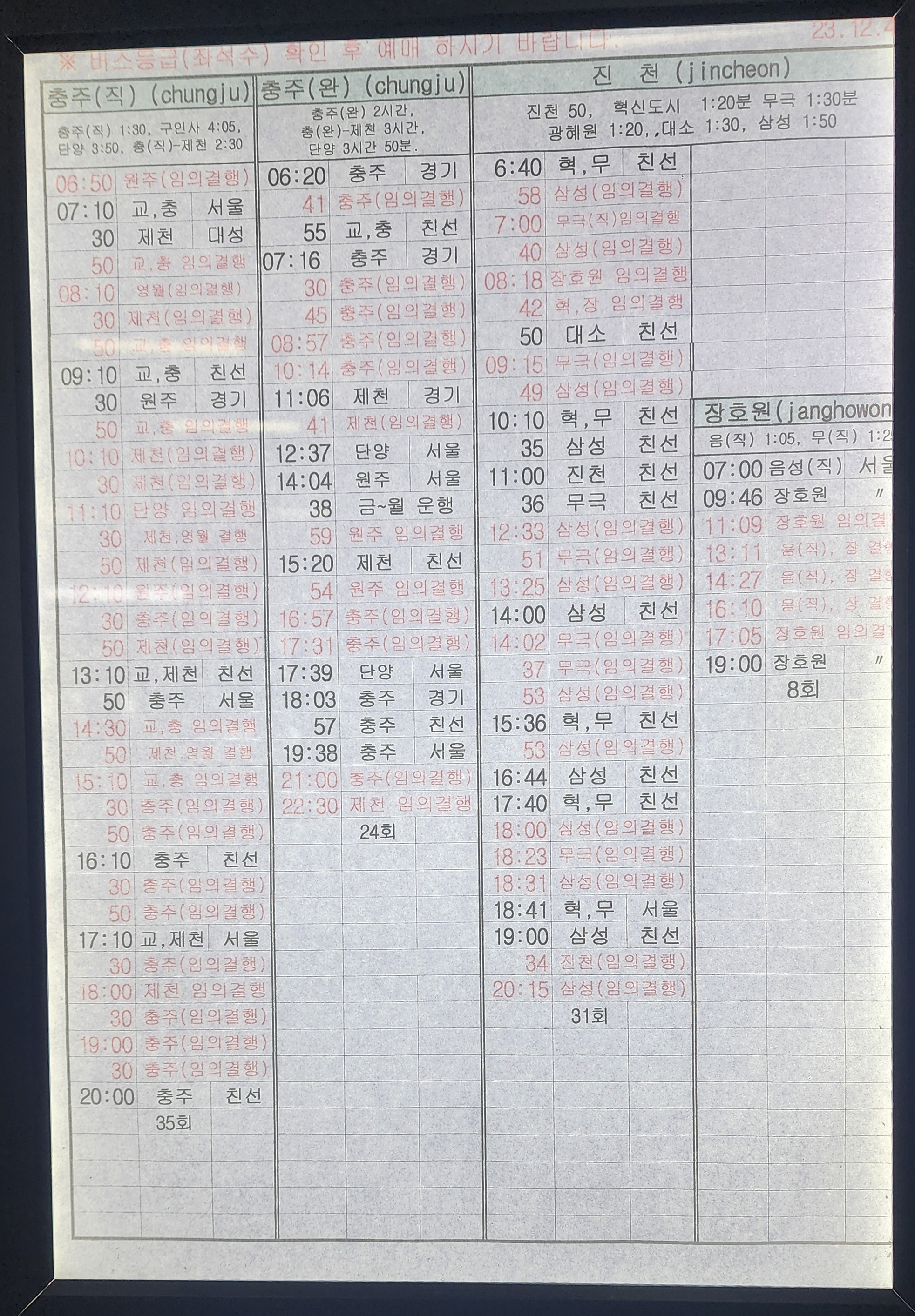 청주 출발 부천, 동송, 강릉, 천안, 원주, 공주, 태백, 대전 방면.