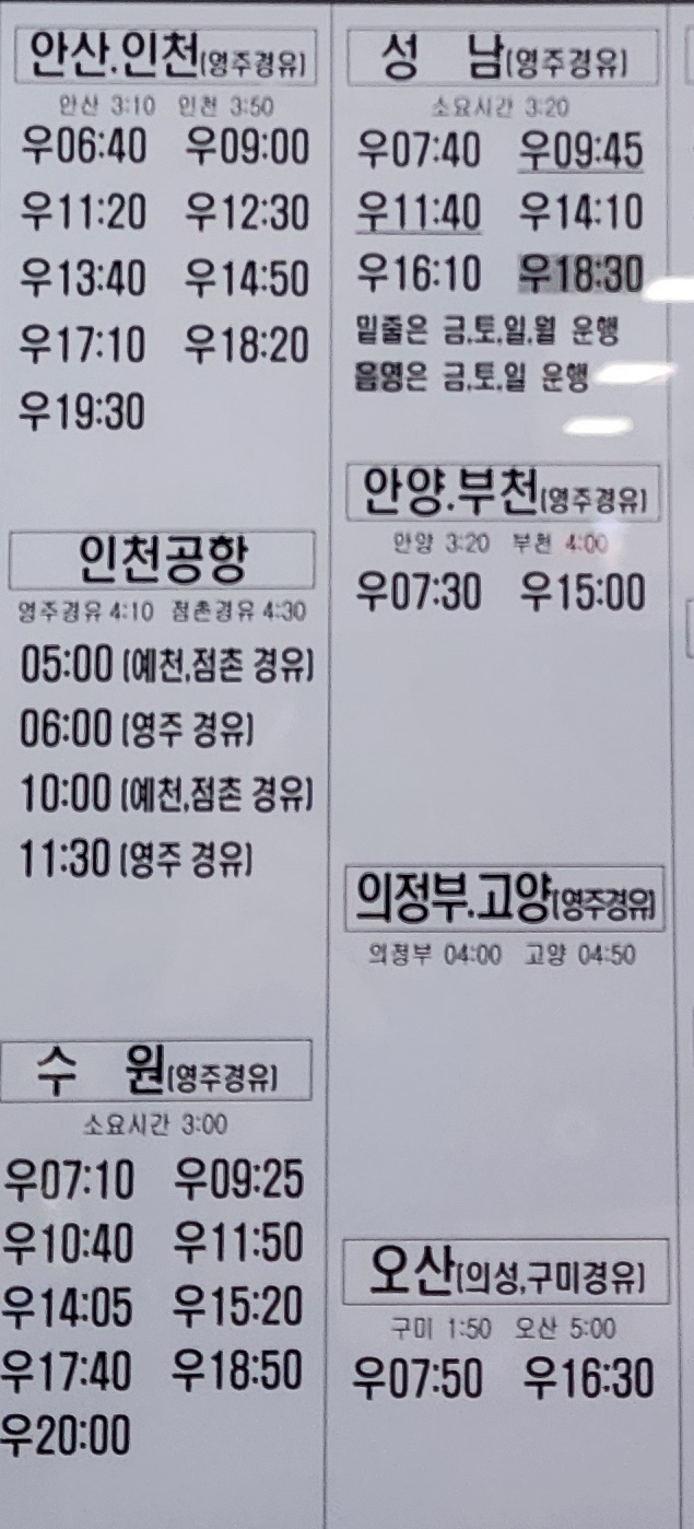 안동 출발 안산, 인천 영주 경유, 인천공항, 수원, 성남, 안양, 부천, 의정부, 고양, 오산, 의성, 구미 방면.
