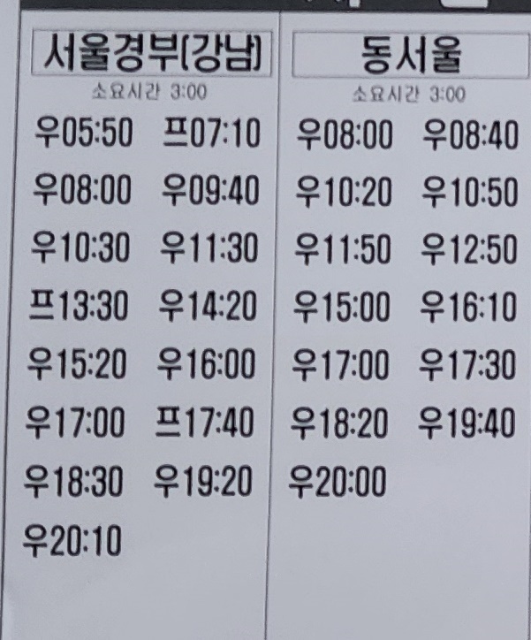 안동 출발 부산, 경주, 울산, 마산, 창원, 대전, 구미, 의성, 군위, 구미, 청주, 원주, 강릉, 속초 방면.