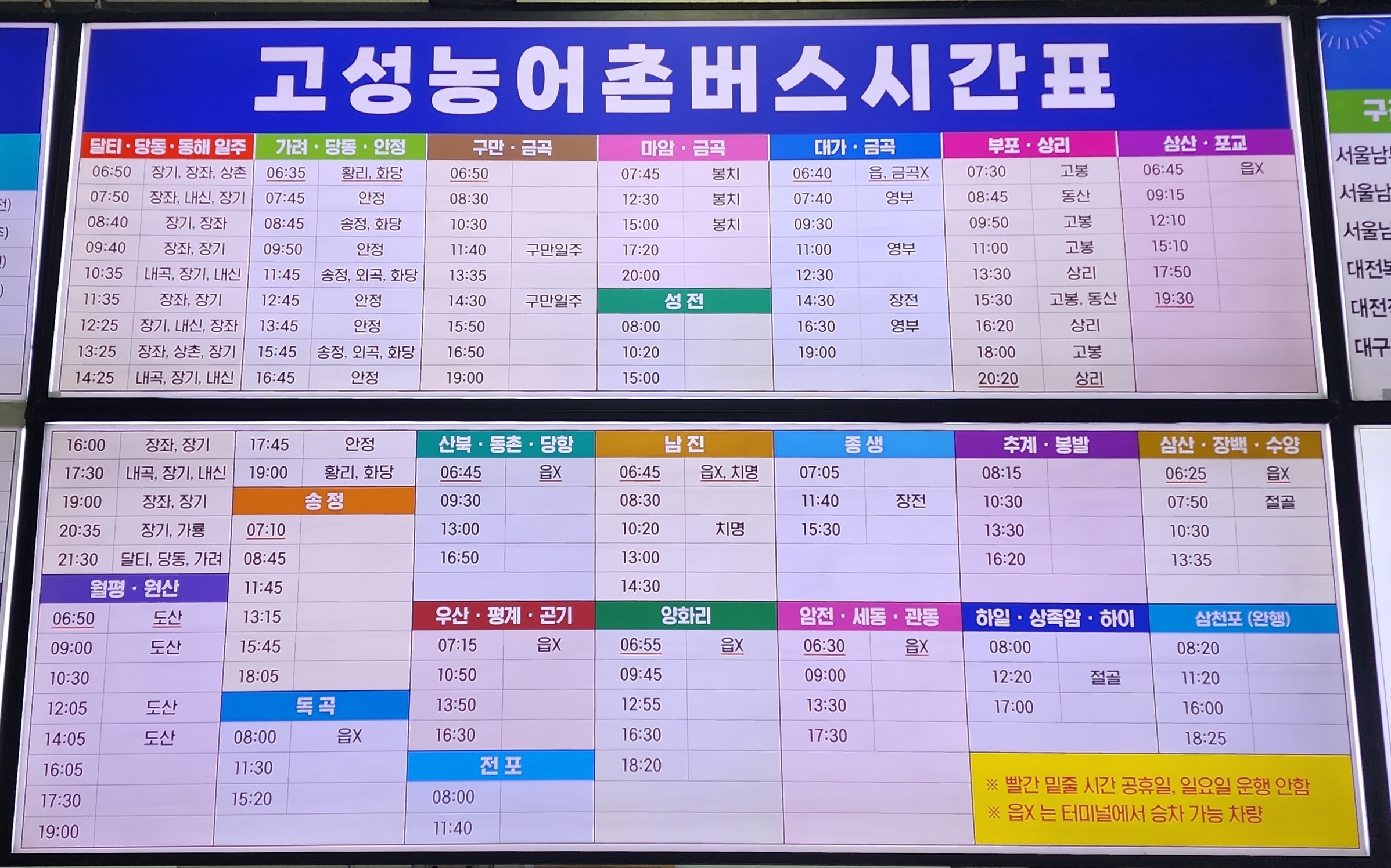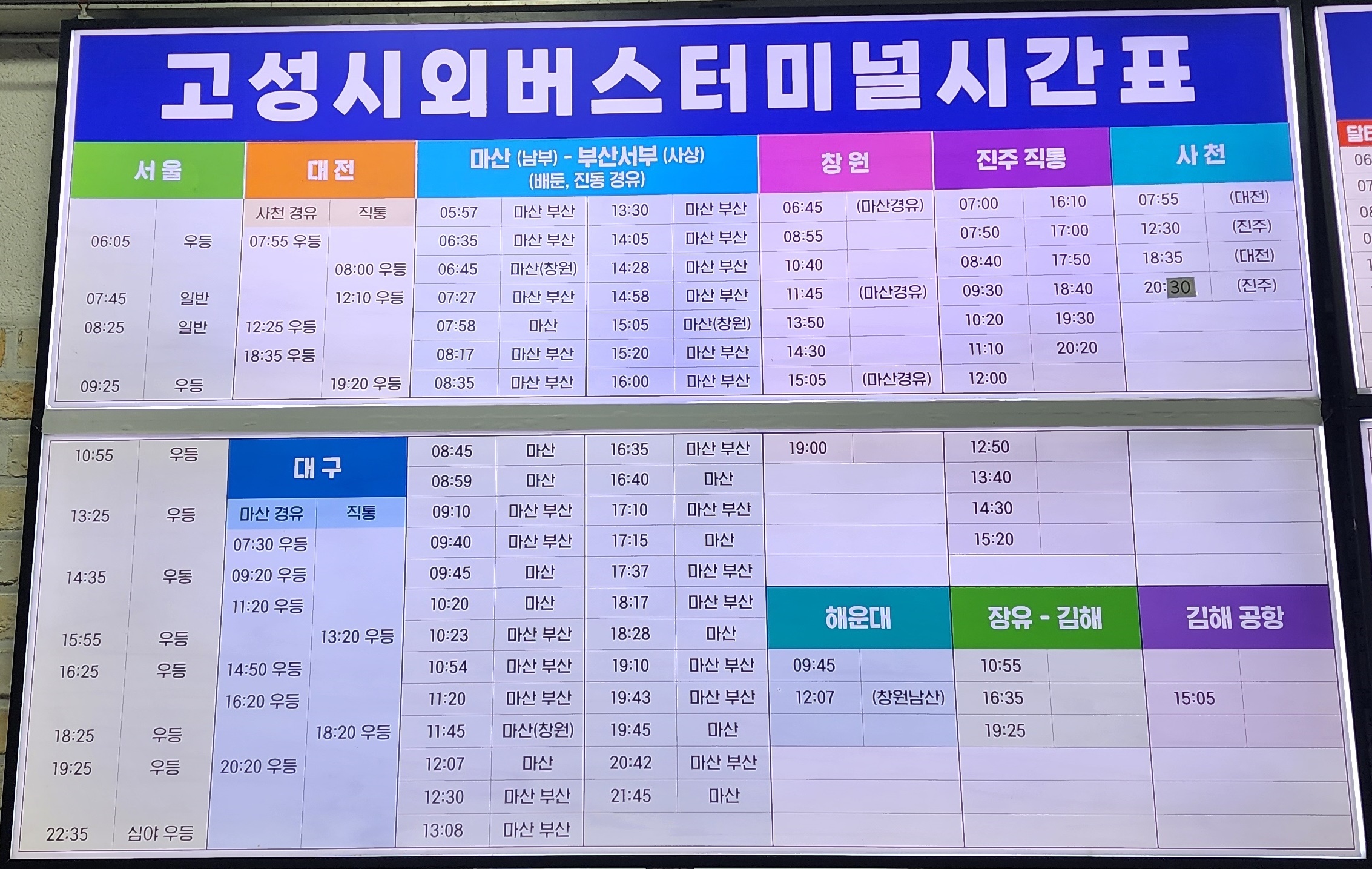 고성 출발 서울, 대전, 대구, 마산, 창원, 진주, 사천, 해운대, 장유, 김해, 김해공항 방면.