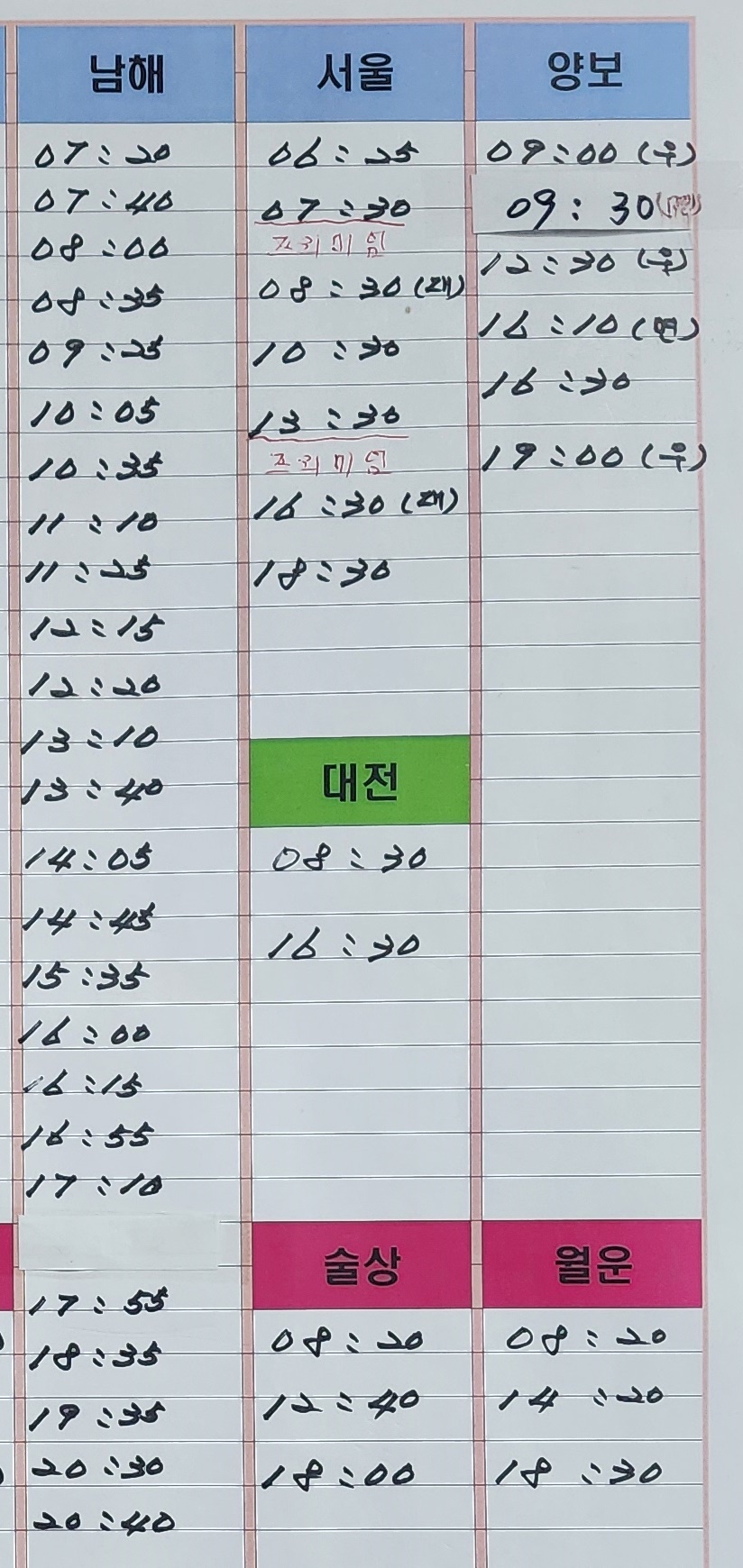 진교 출발 남해, 서울, 양보, 대전, 술상, 원운 방면.