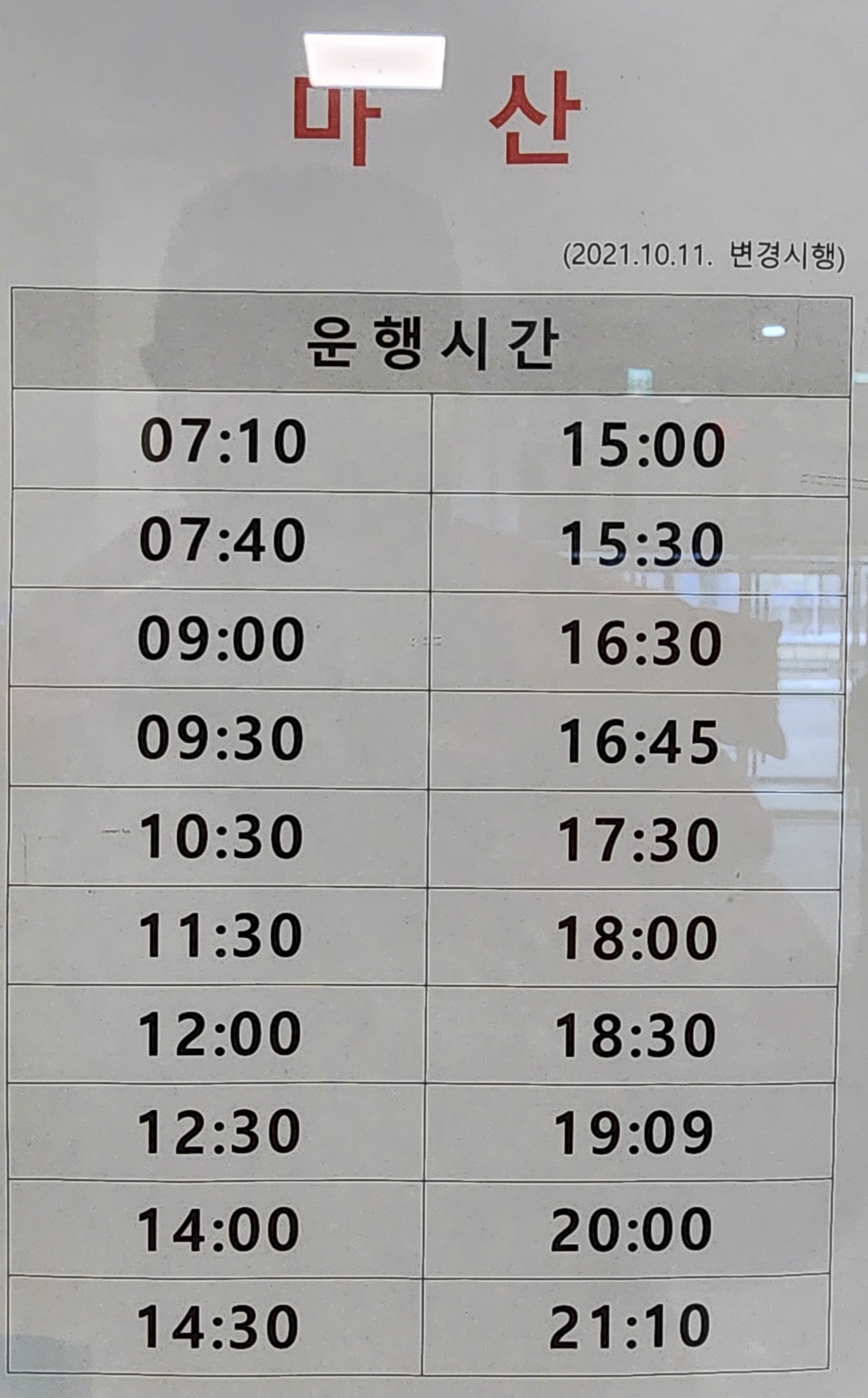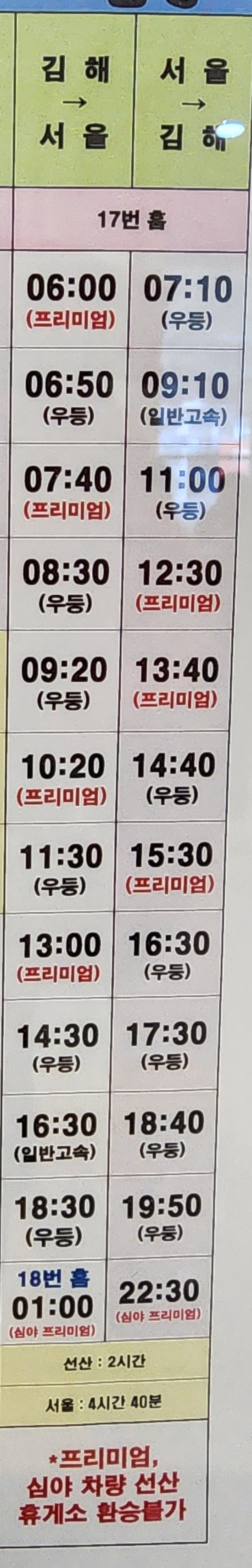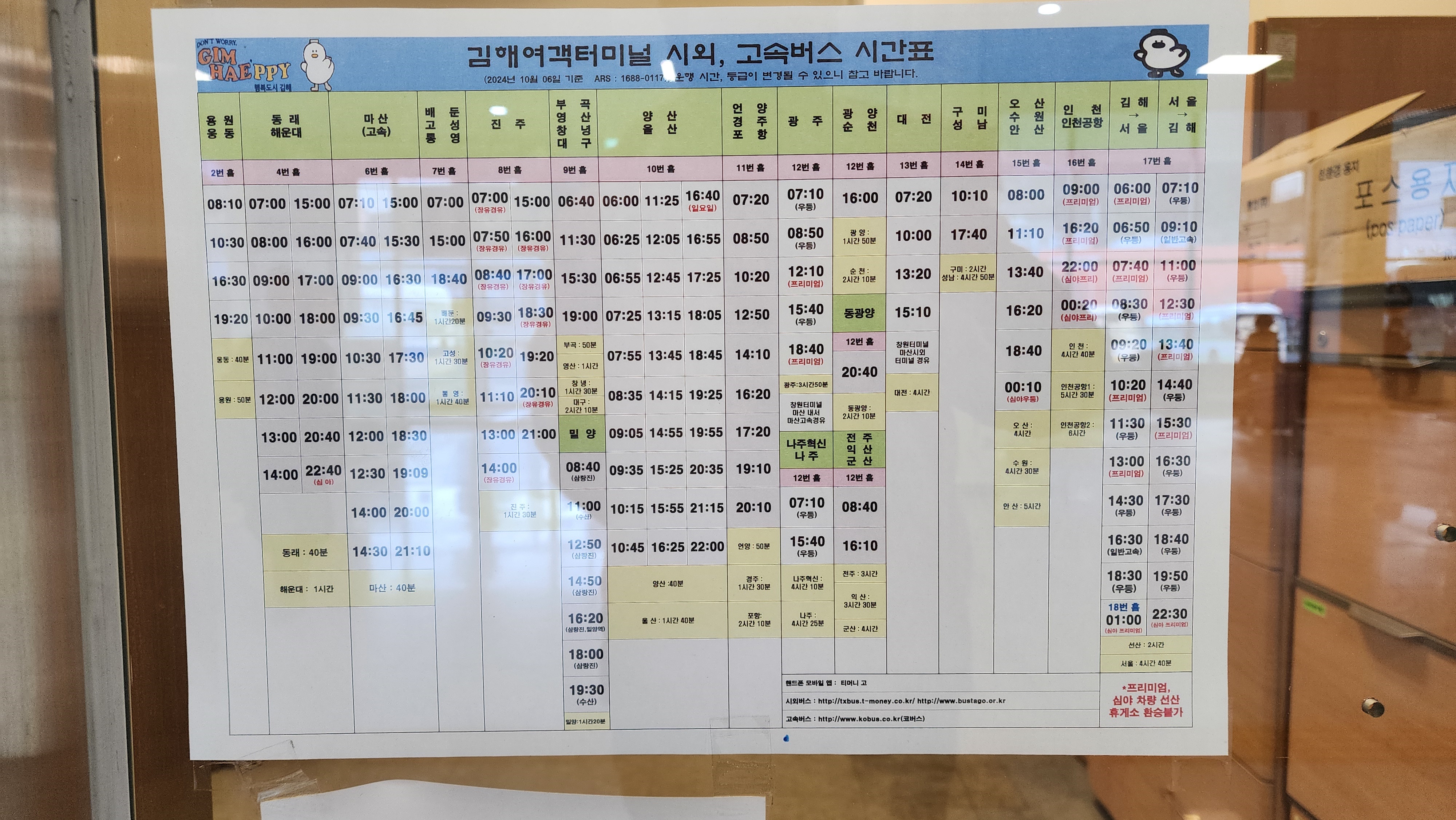 김해여객터미널 시외 고속버스 시간표.