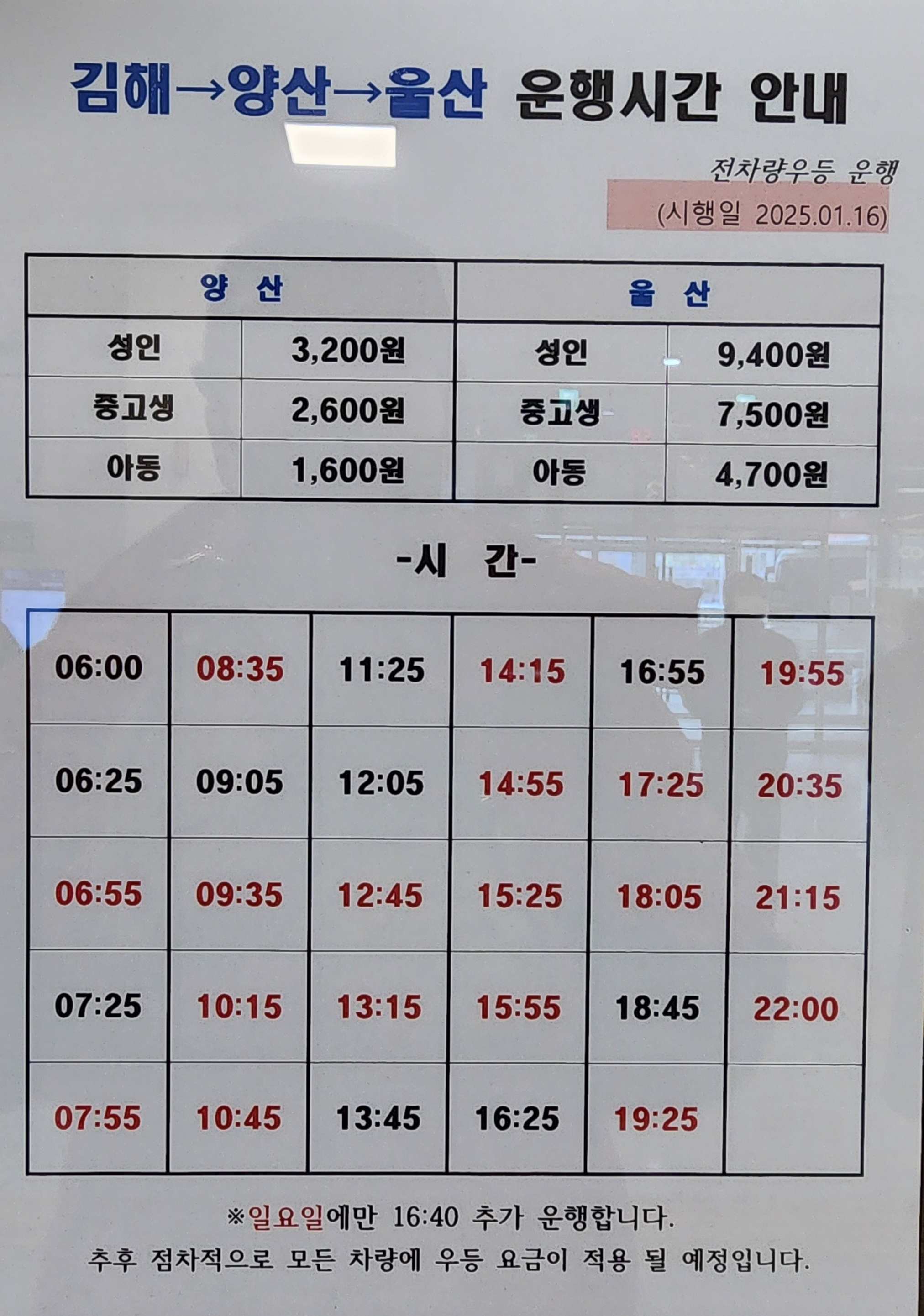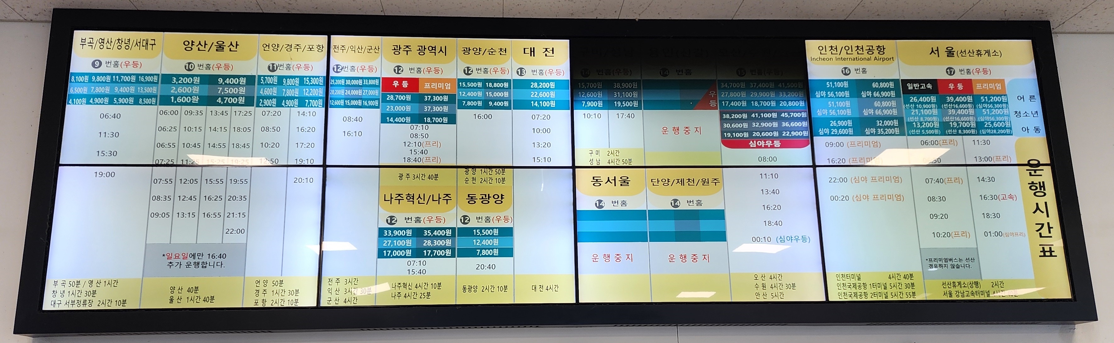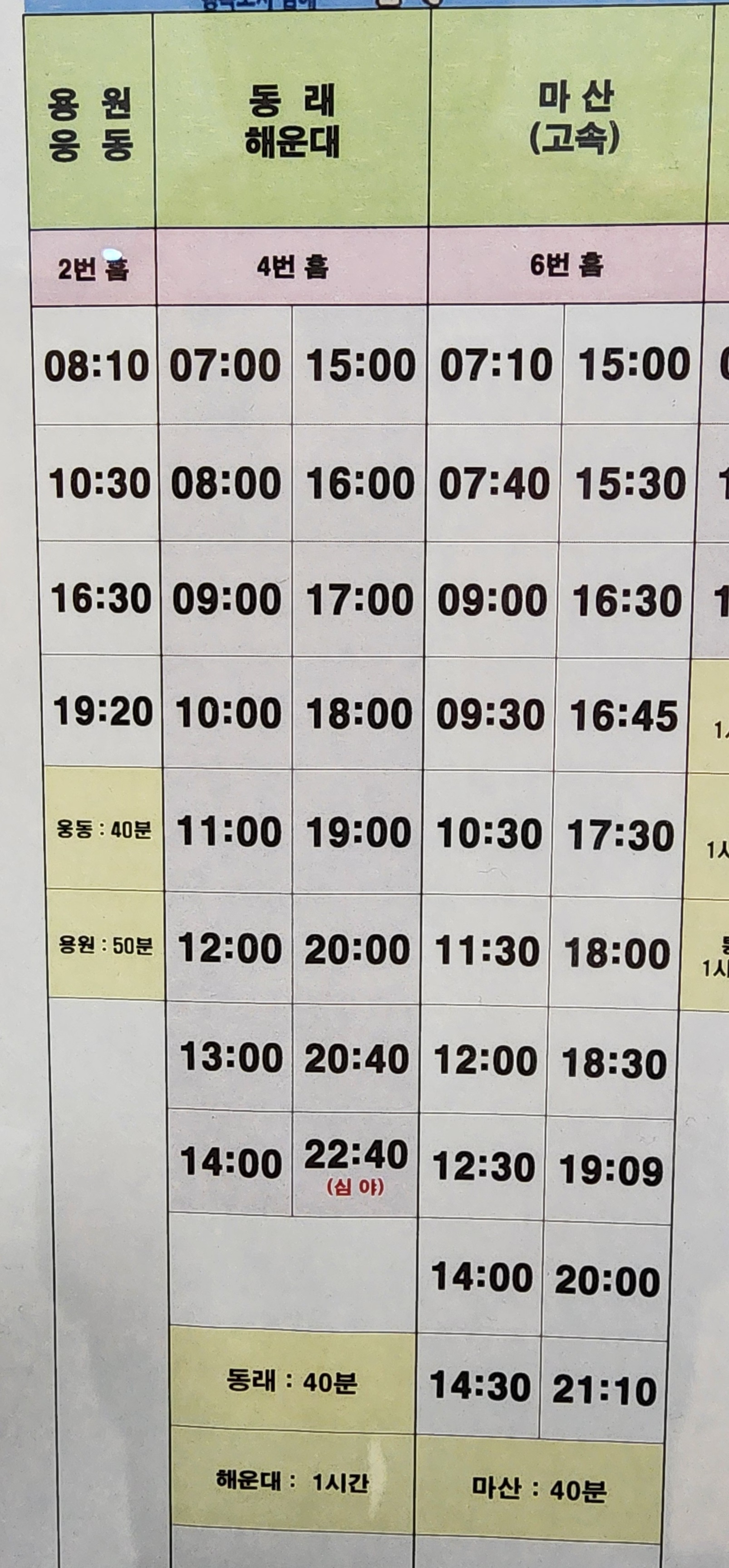 김해여객터미널 시외 고속버스 시간표.