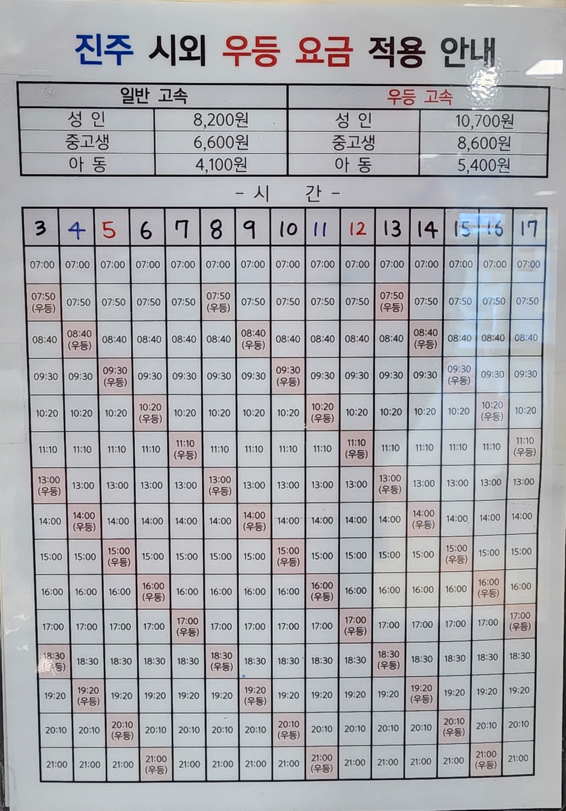 진주 시외 우등 요금 적용 안내