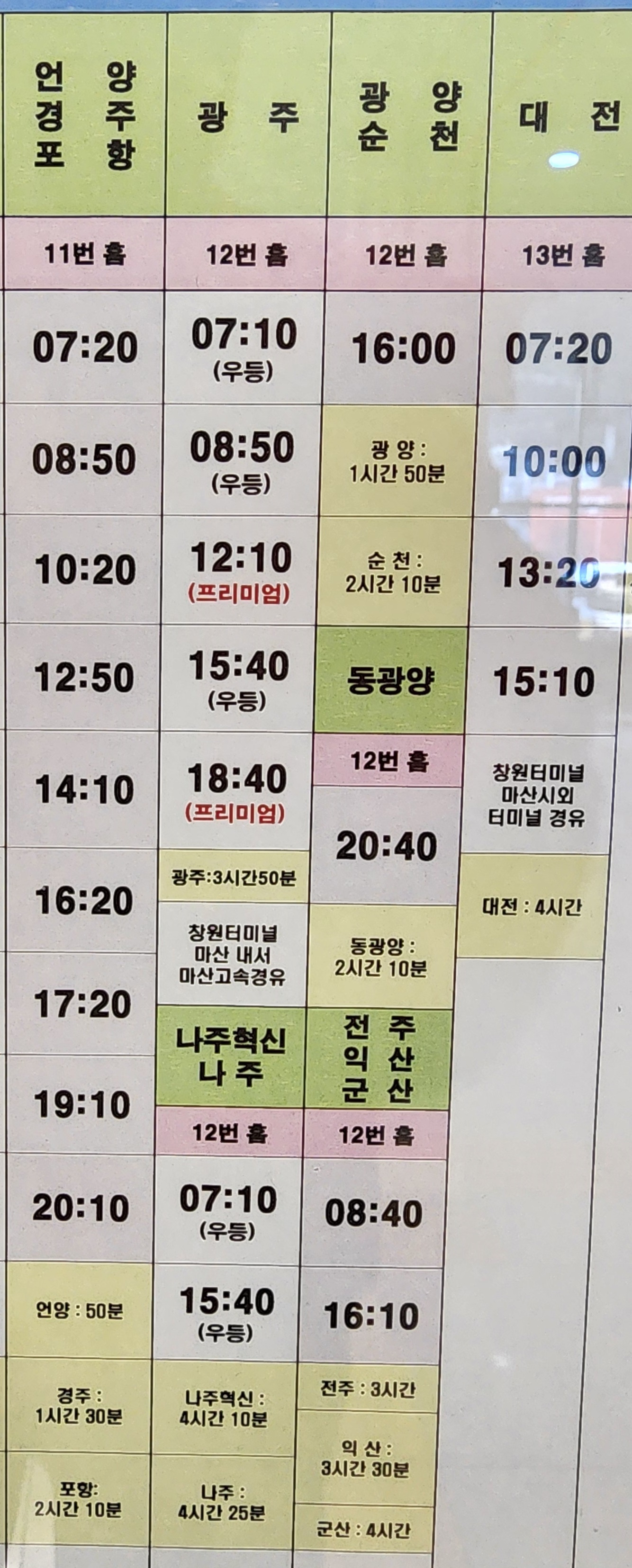 김해 출발 언양, 경주, 포항, 광주, 나주, 나주혁신, 전주, 익산, 군산, 광양, 동광양, 순천, 대전 방면.