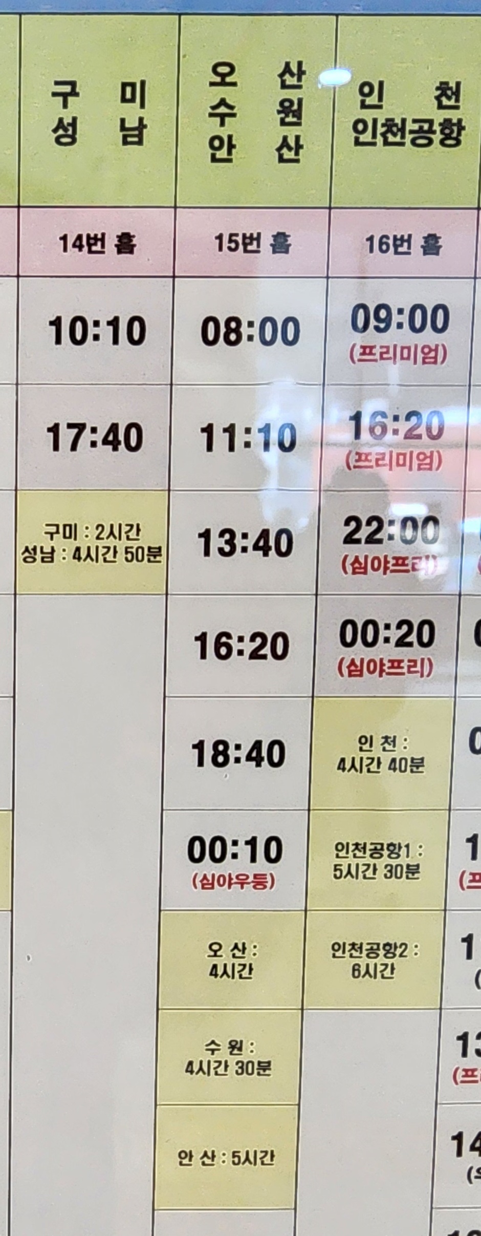 김해 출발 구미, 성남, 오산, 수원, 안산, 인천, 인천공항 방면.