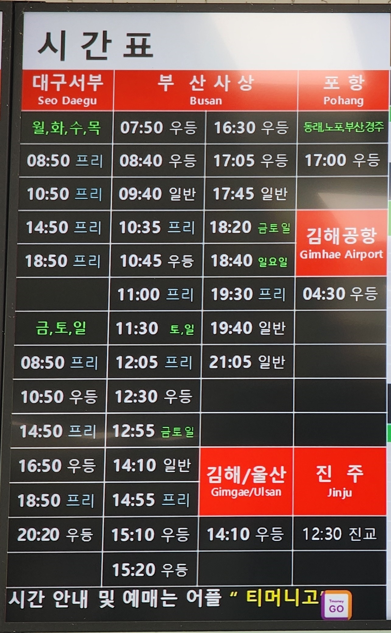 동광양 출발 대구 서부, 부산 사상, 포항, 김해공항, 김해, 울산, 진교, 진주 방면.