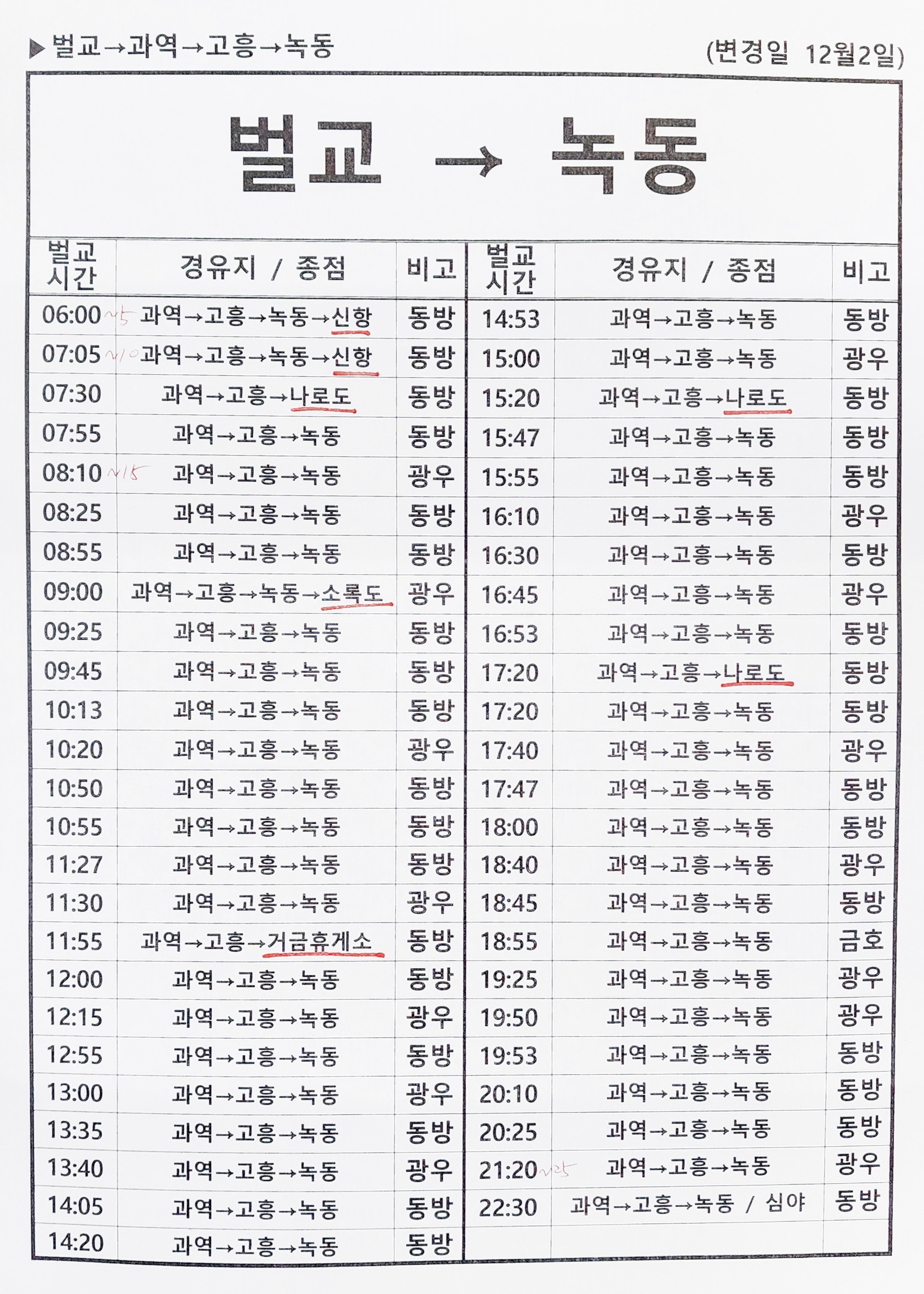 벌교 출발 과역, 고흥, 녹동, 신항, 소록도, 거금휴게소, 나로도 방면.