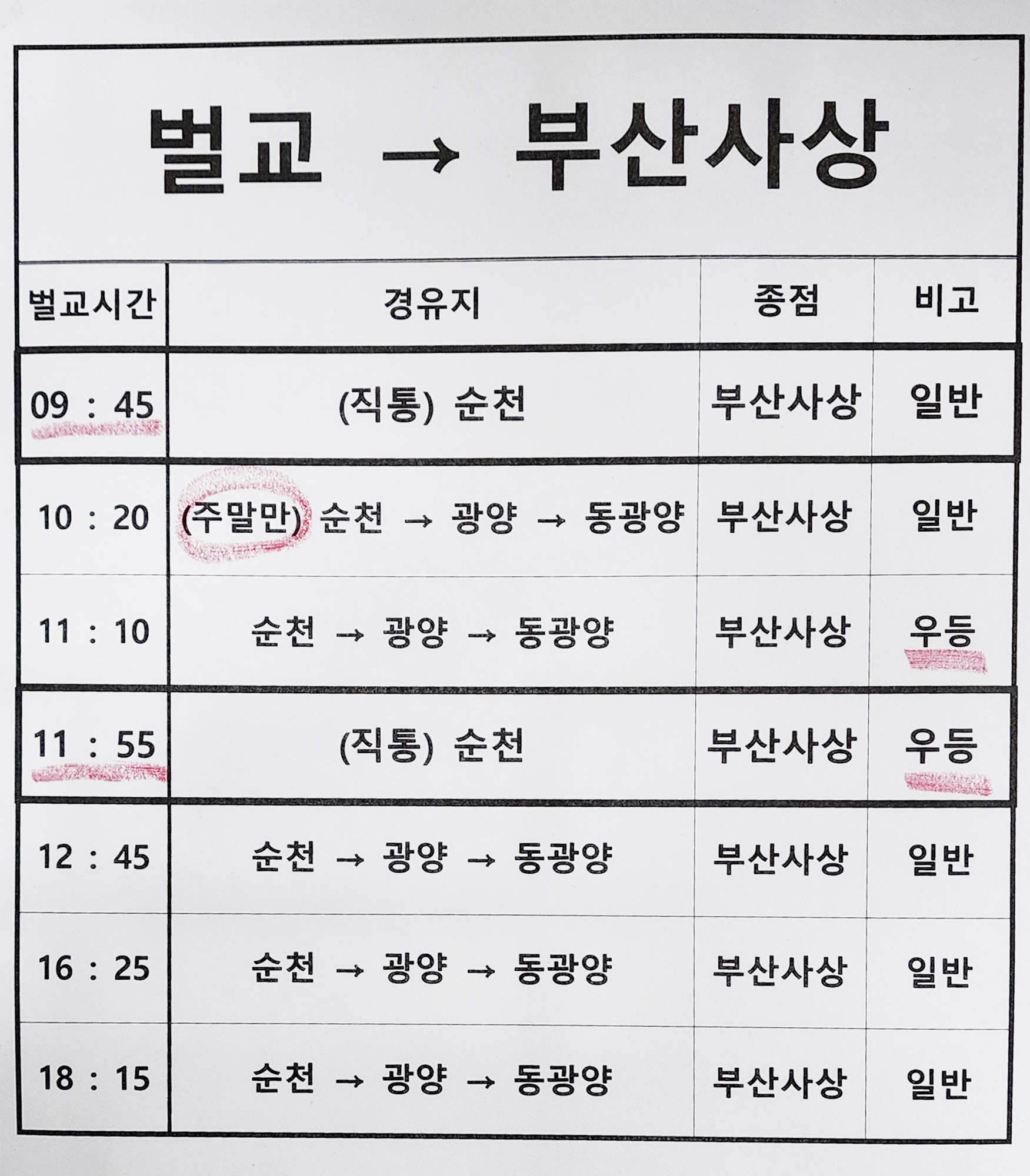 벌교 출발 순천, 광양, 동광양, 부산 사상 방면.