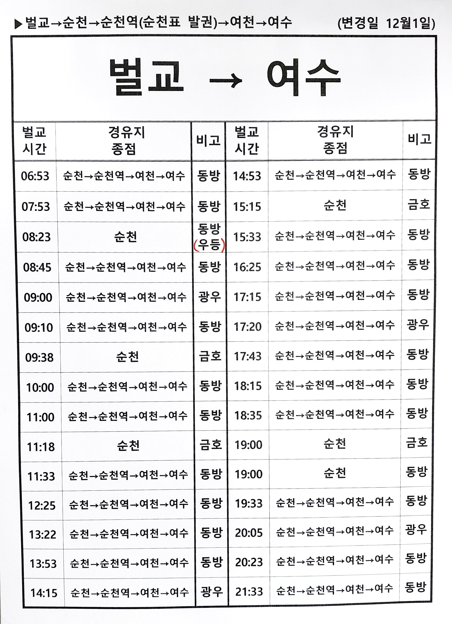 벌교 출발 순천, 순천역, 여천, 여수 방면.