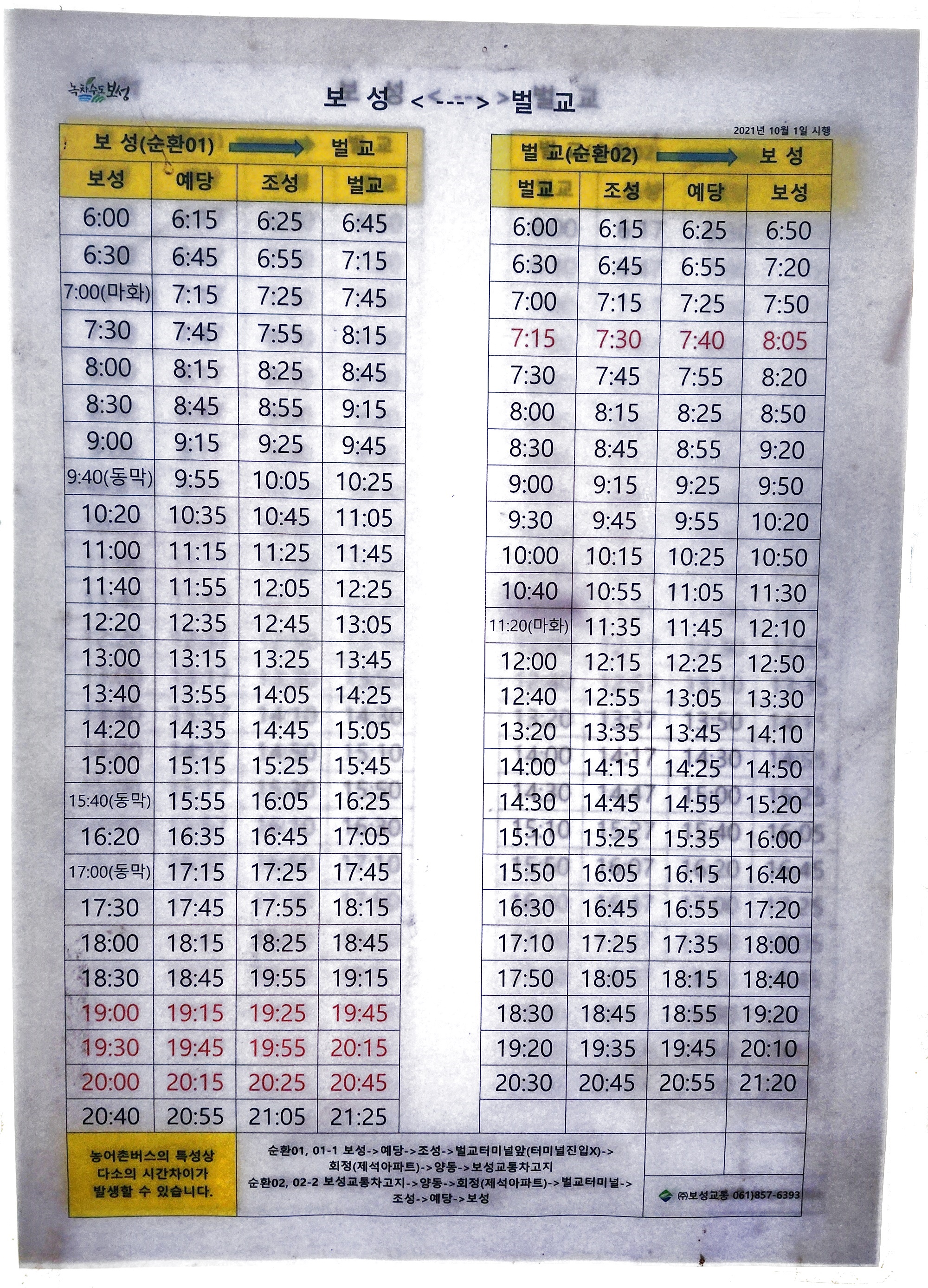 벌교 출발 장안, 대포, 조성, 대보동, 보성, 신기, 마동, 진석, 호산, 동막 방면.