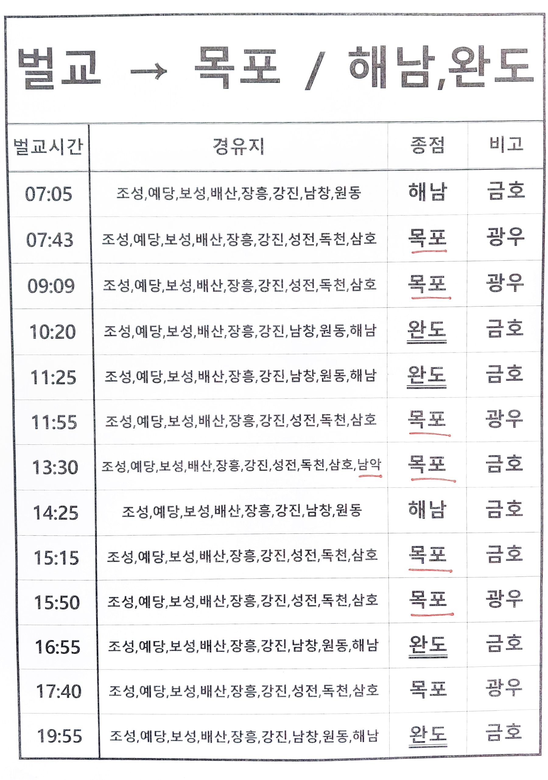 벌교 출발 목포, 해남, 완도 방면.