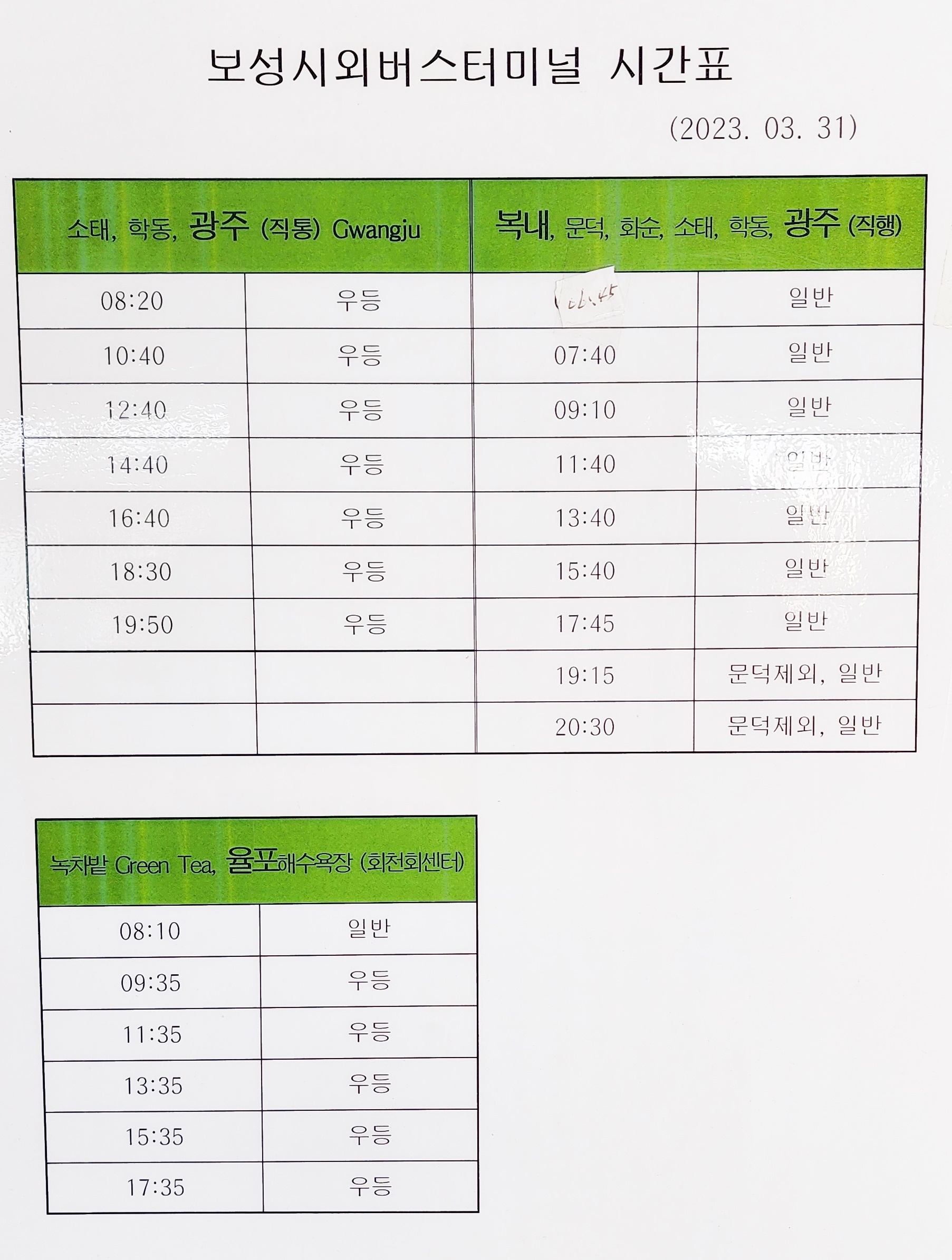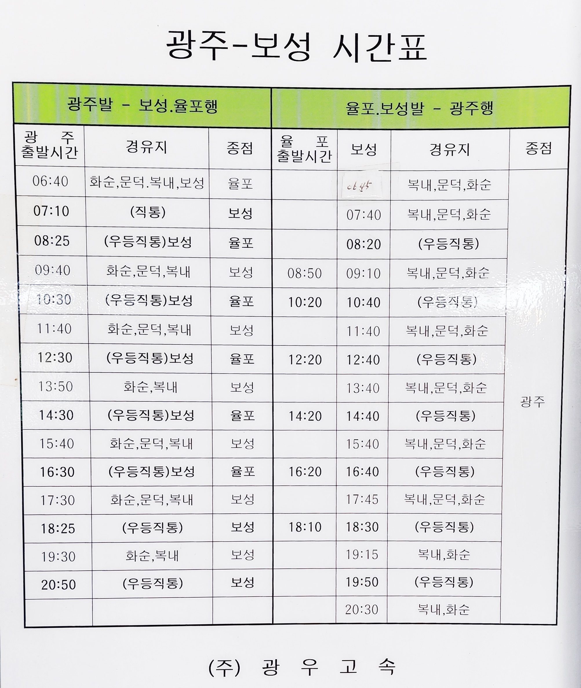 보성 출발 소태, 학동, 광주, 복내, 문덕, 화순, 녹차밭 율포 방면.