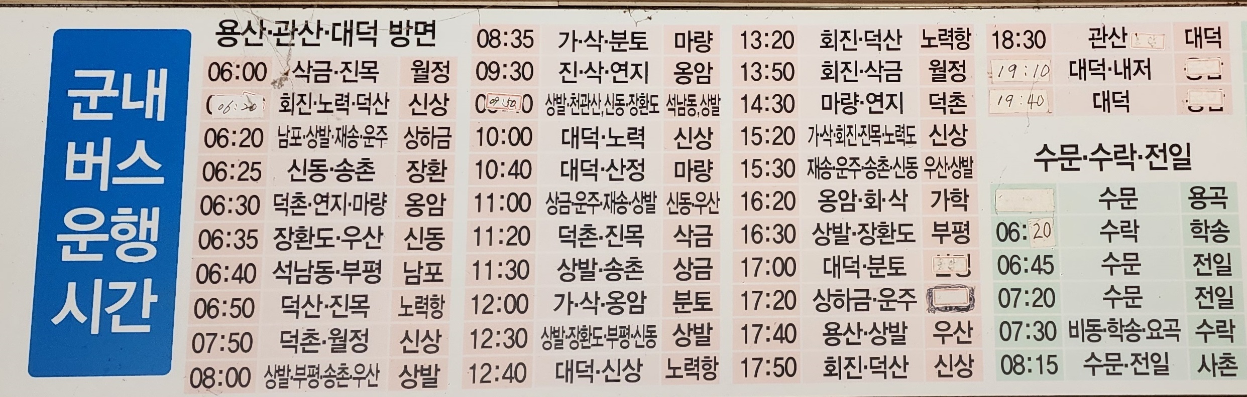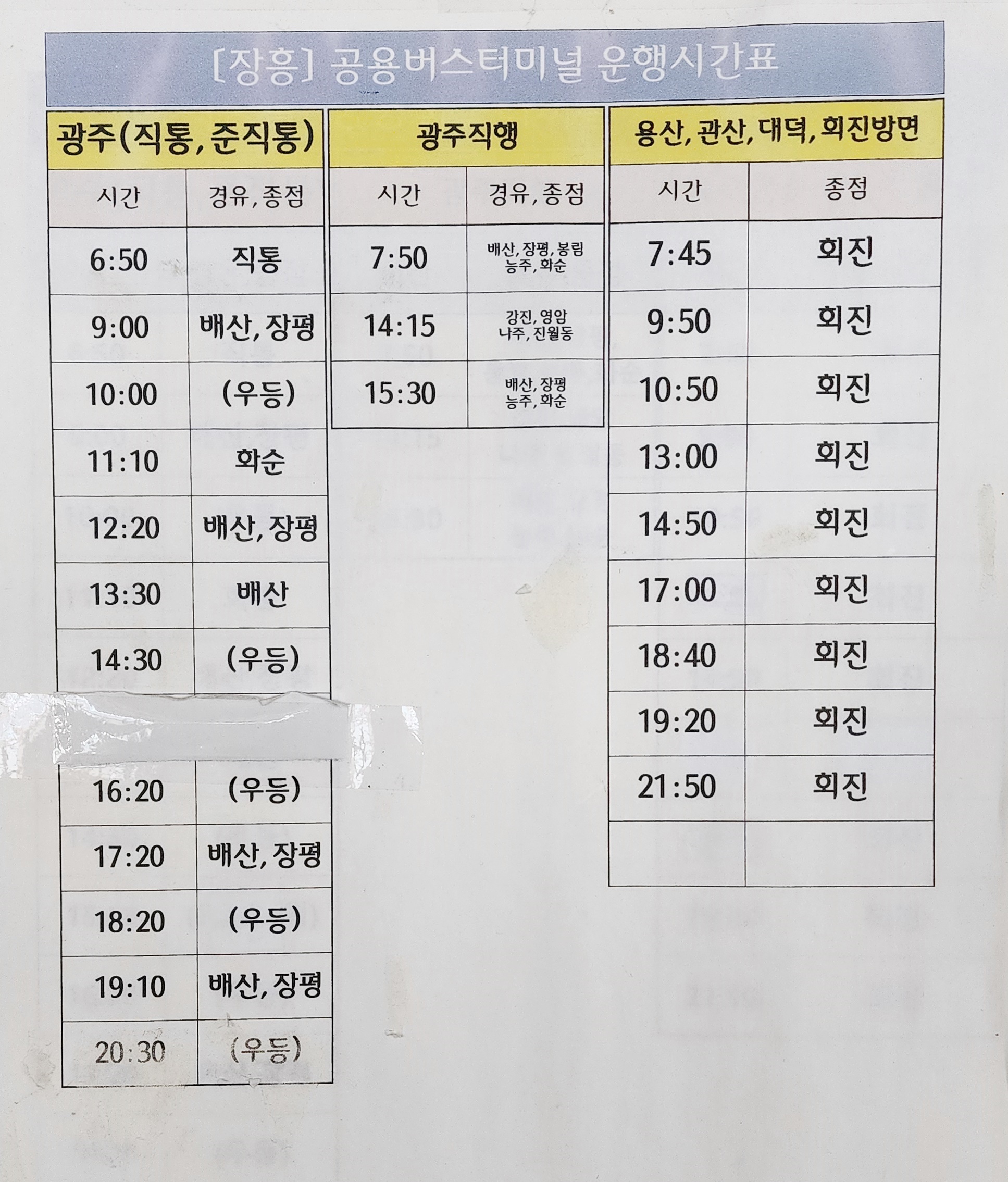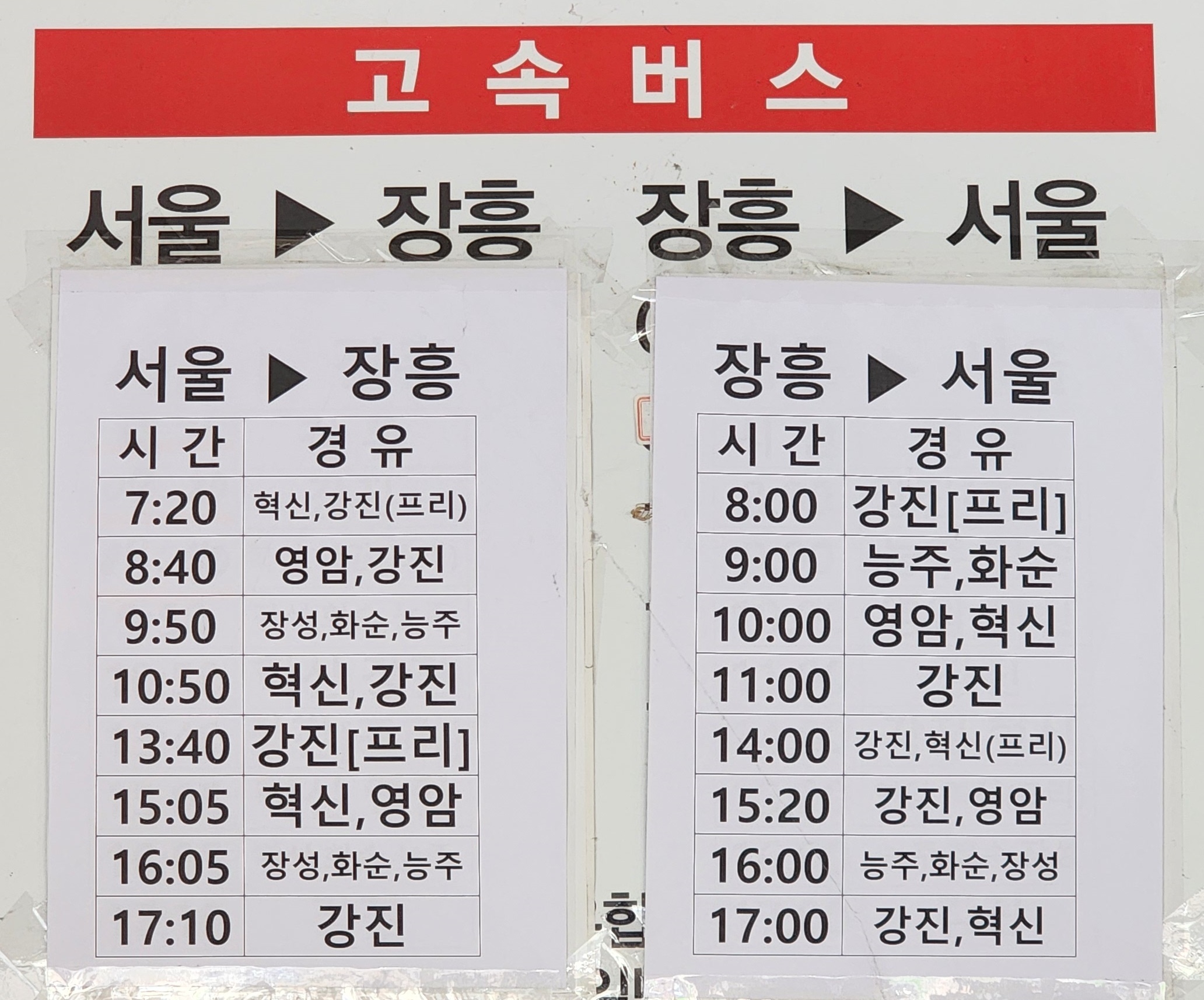 장흥 출발 광주, 용산, 관산, 대덕, 회진 방면.