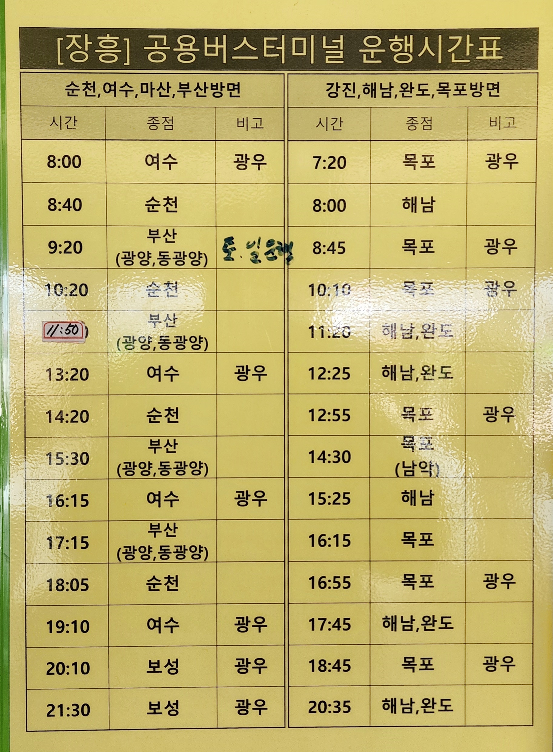 장흥 출발 순천, 여수, 마산, 부산, 강진, 해남, 완도, 목포 방면.