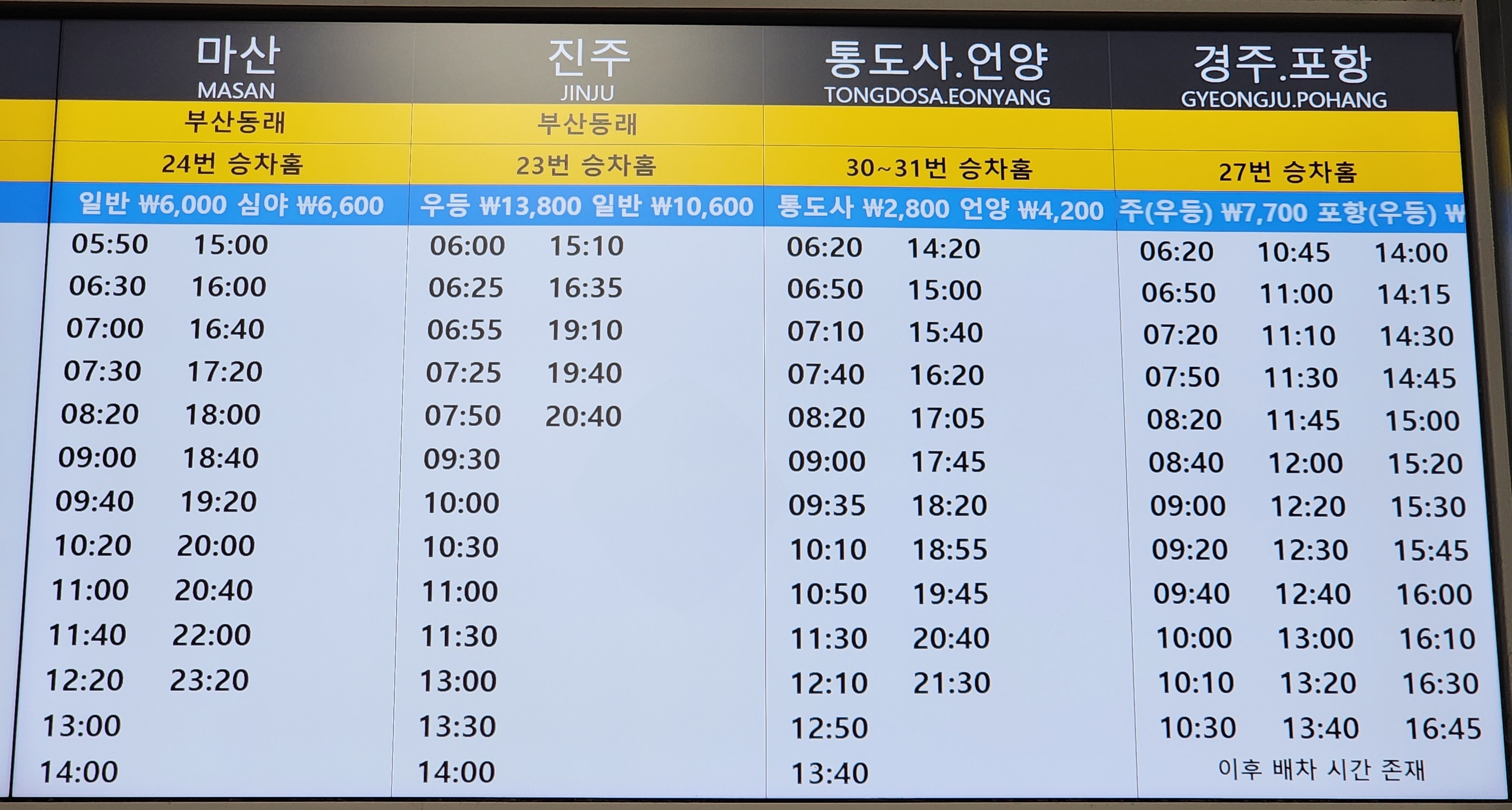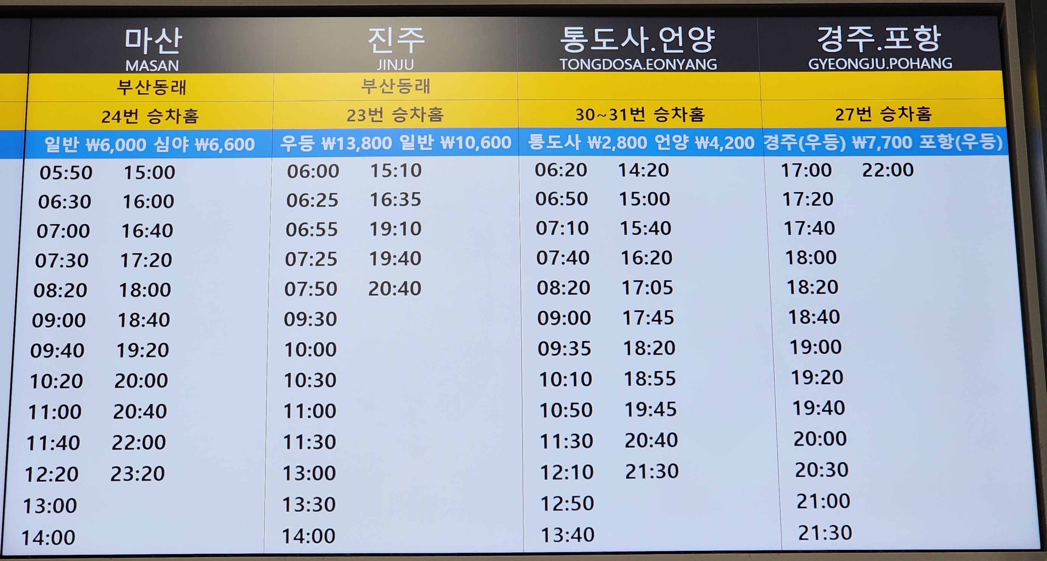 부산 출발 마산, 진주, 통도사, 언양, 경주, 포항 방면.