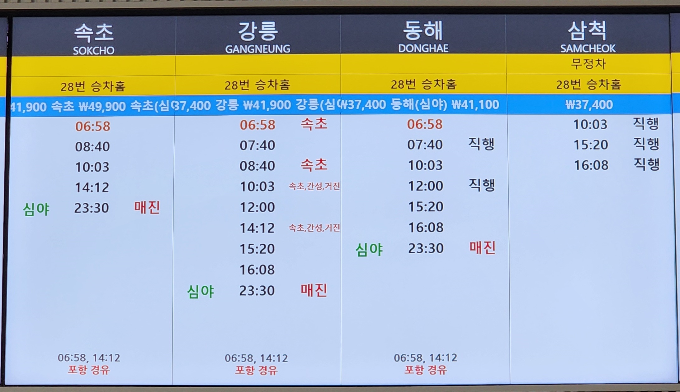 부산 출발 속초, 강릉, 동해, 삼척 방면.