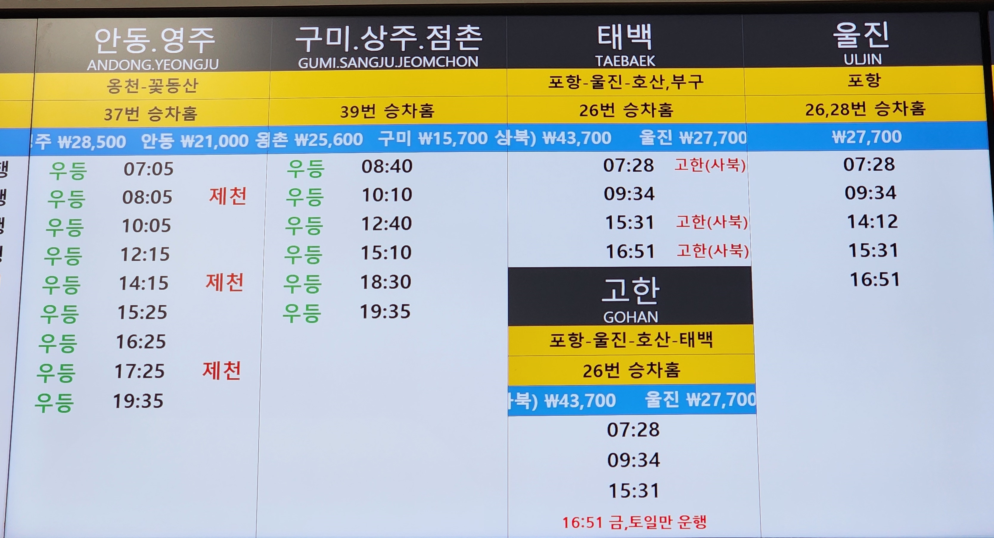 부산 출발 안동, 영주, 구미, 상주, 점촌, 태백, 울진, 고한 방면.