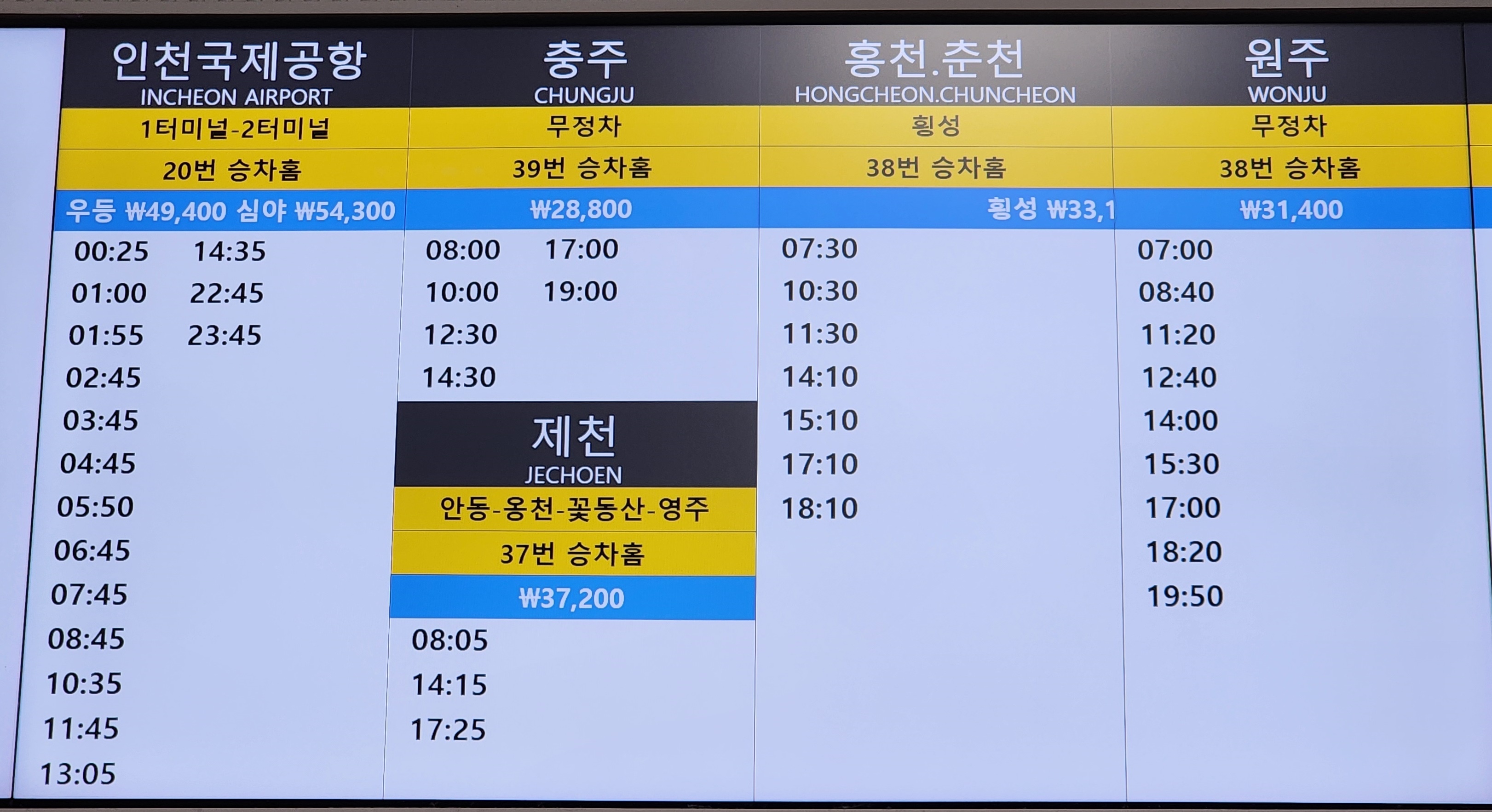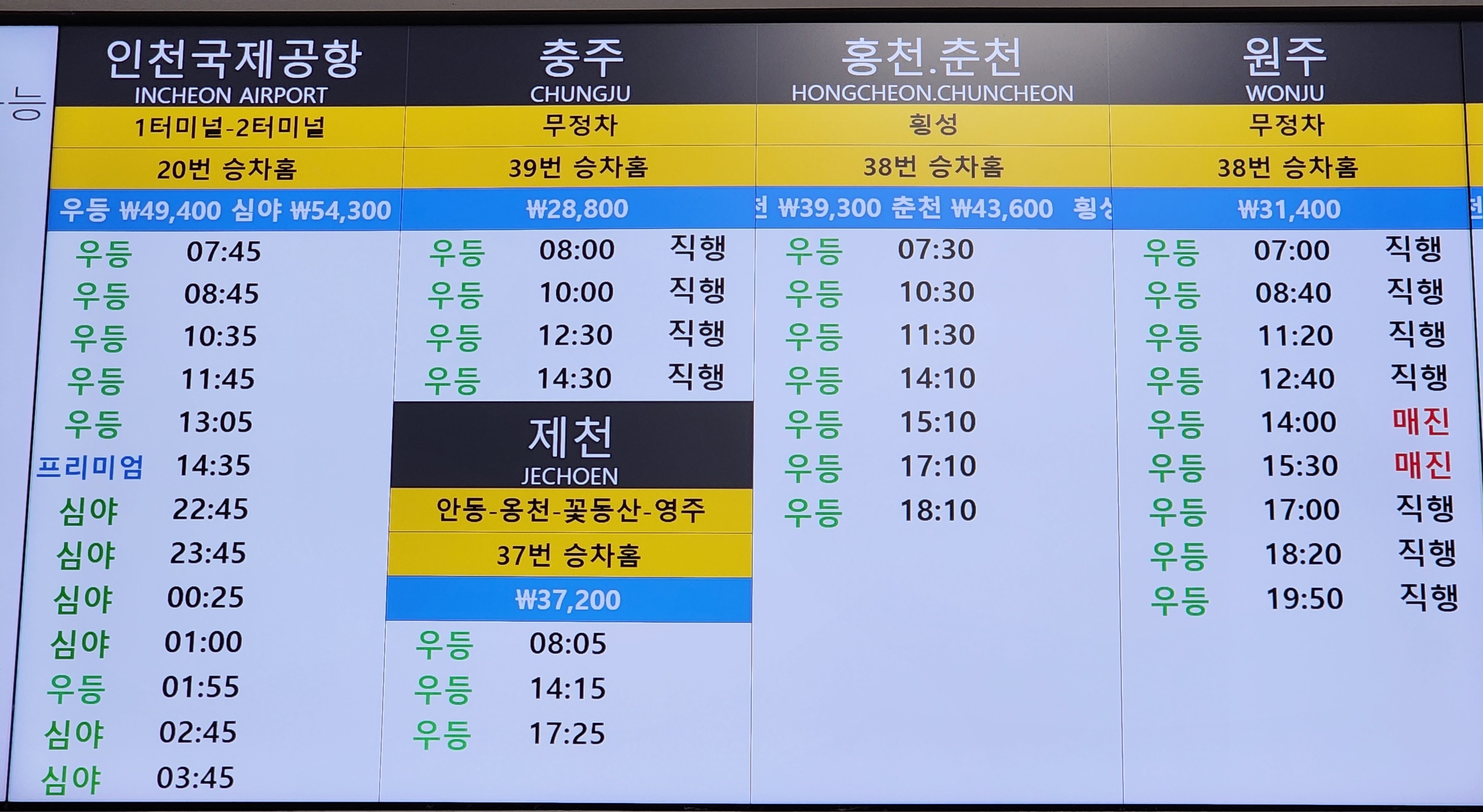 부산 출발 인천국제공항, 충주, 홍천, 춘천, 원주, 제천 방면.
