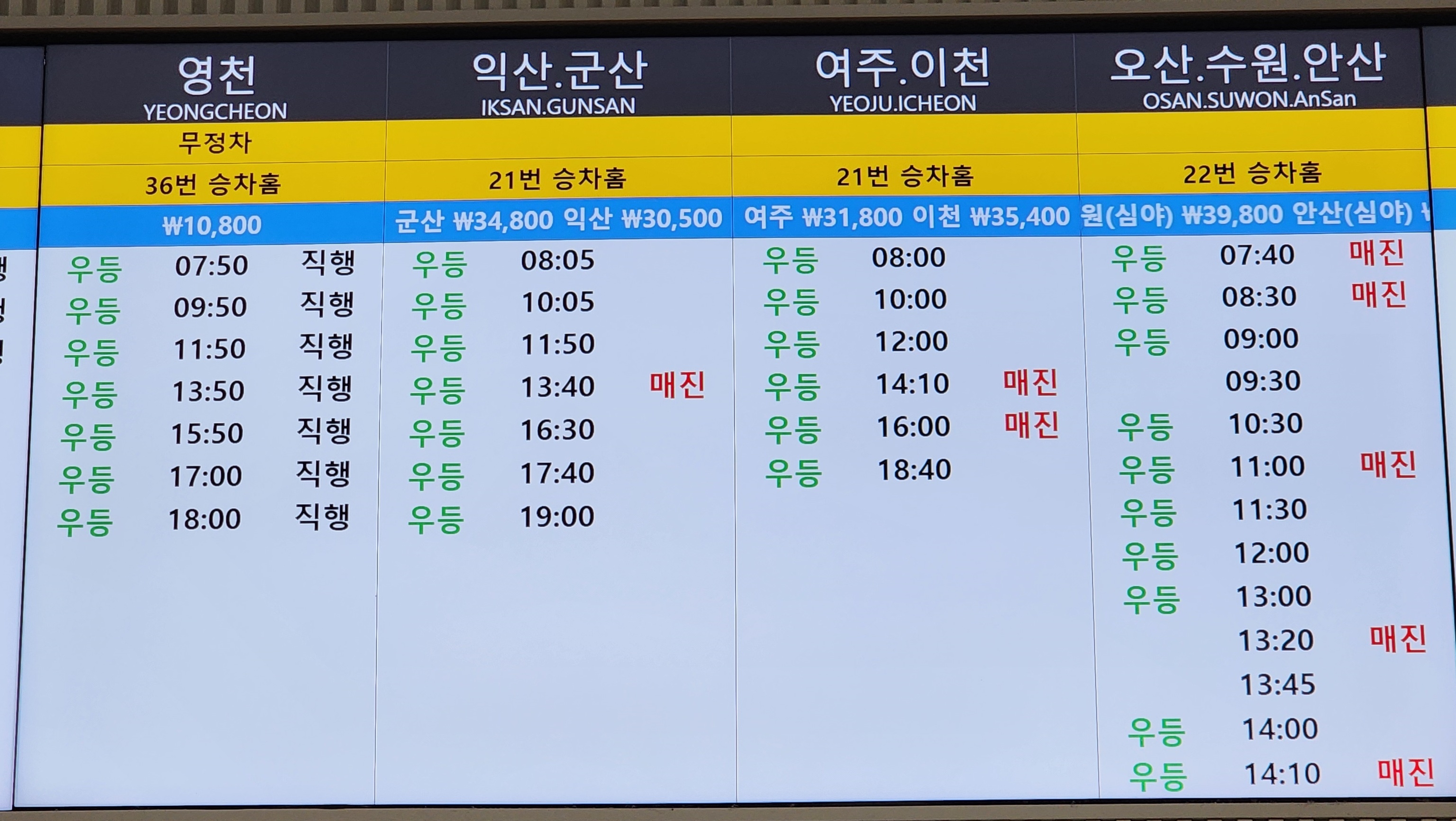 부산 출발 영천, 익산, 군산, 여주, 이천, 오산, 수원, 안산 방면.