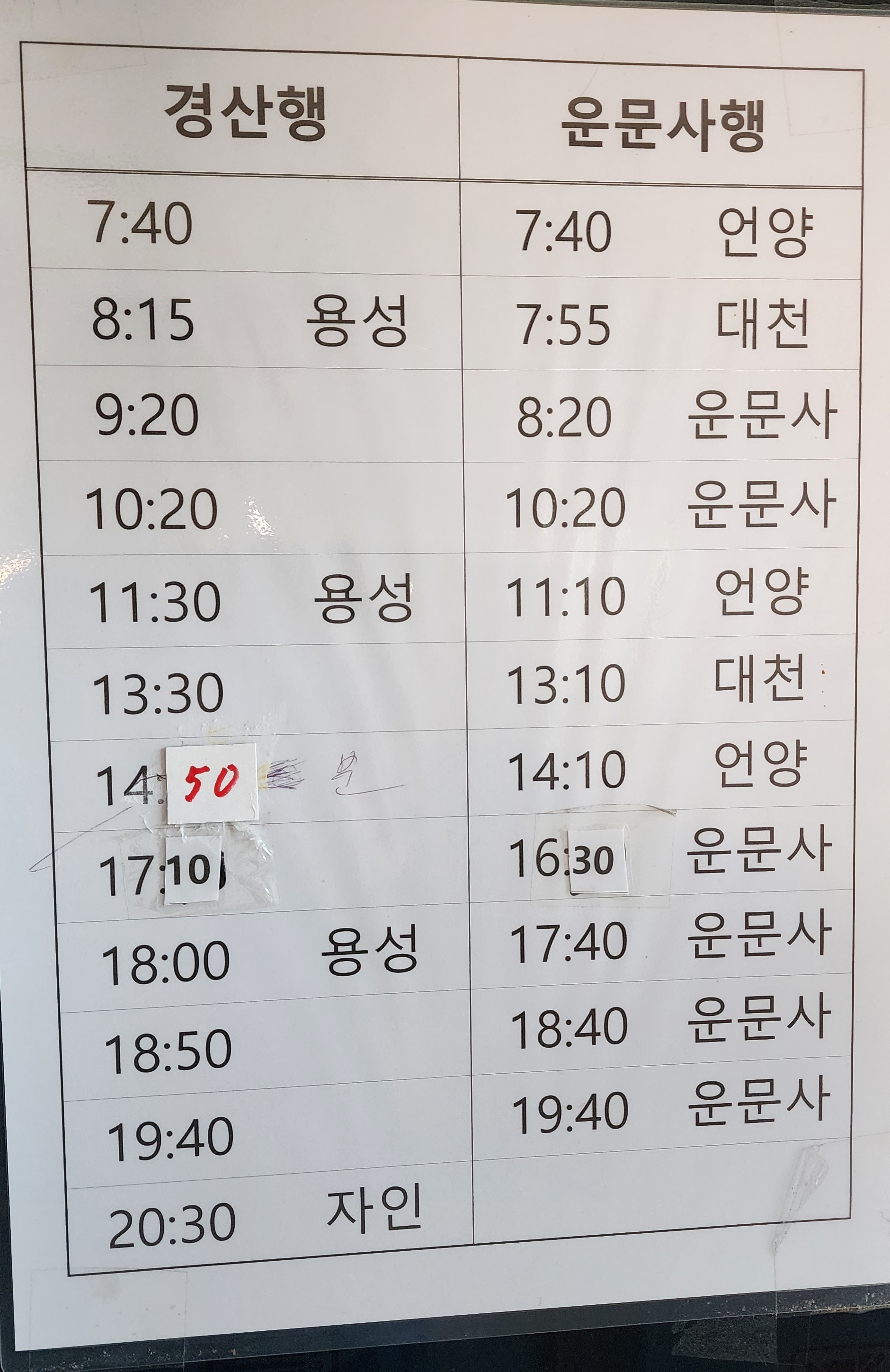 청도 동곡 출발 경산, 운문사, 언양 방면.