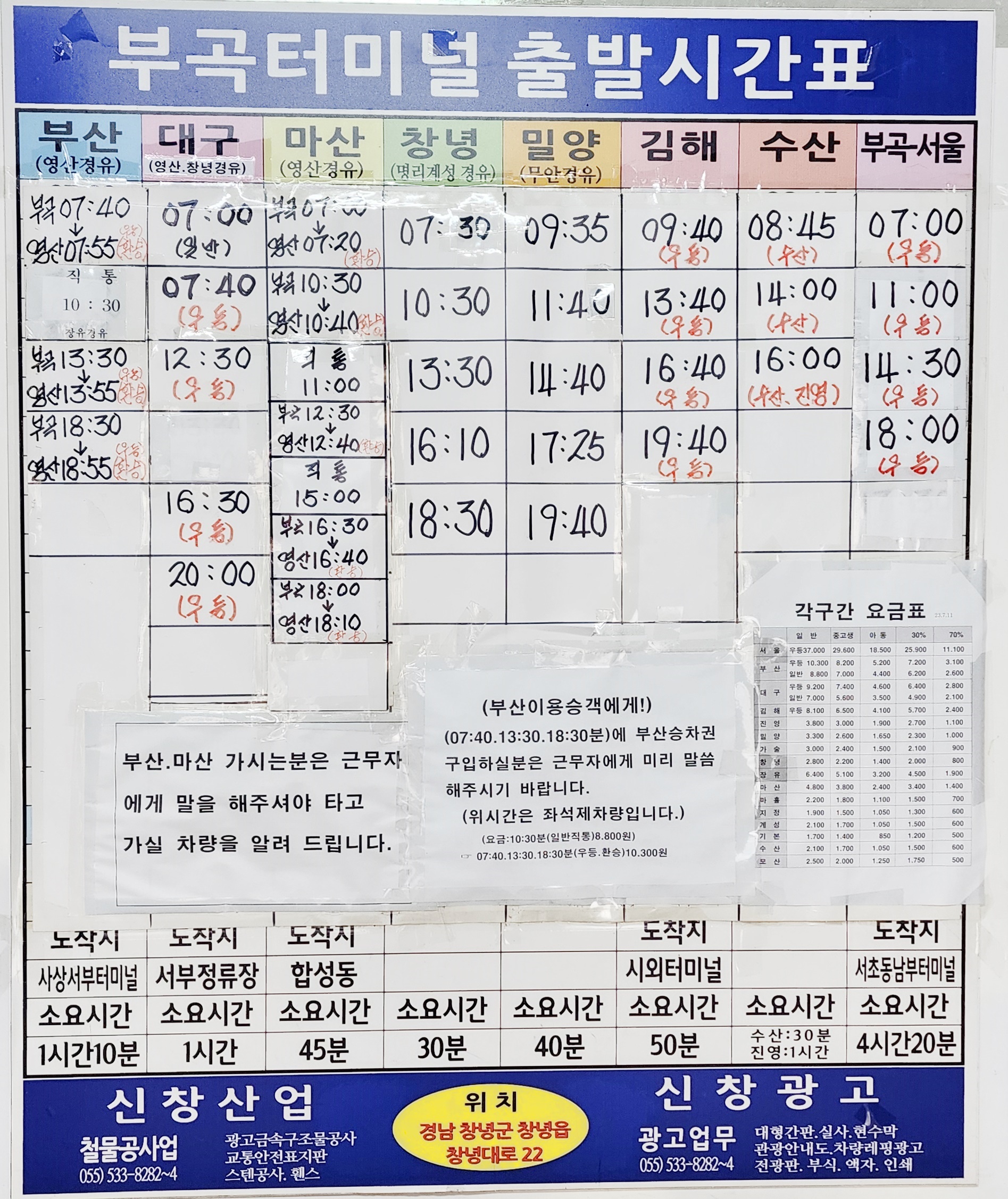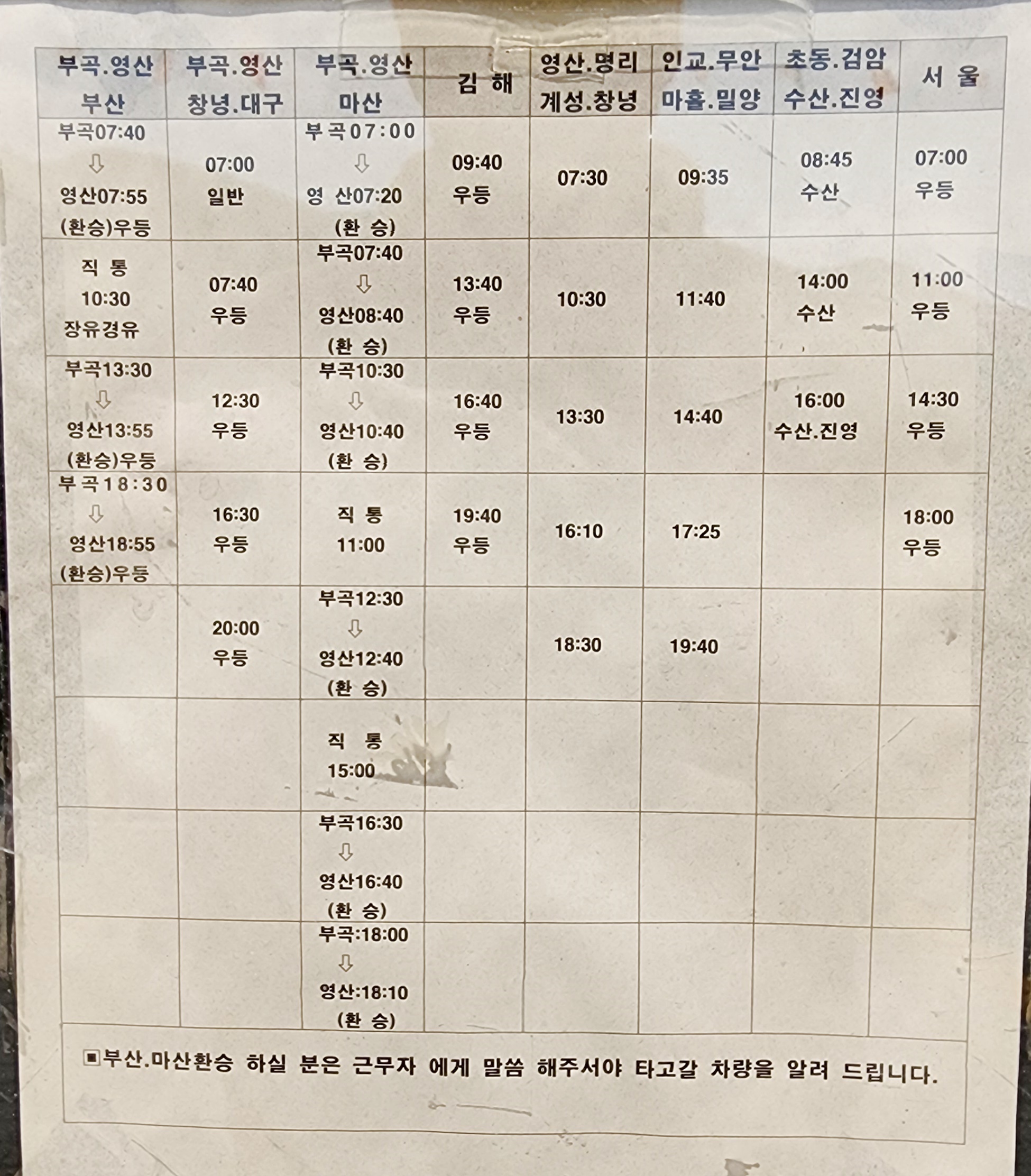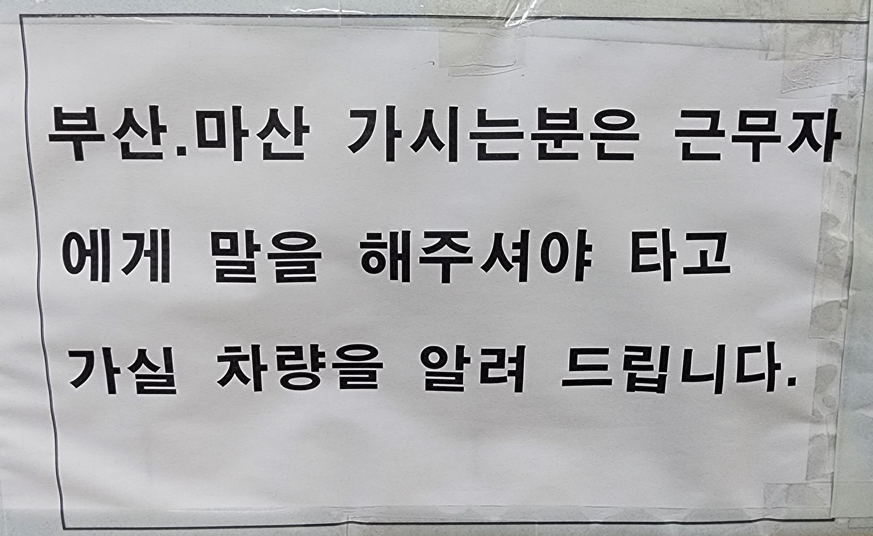 부곡 출발 부산, 마산 가시는 분은 근무자에게 말을 해주셔야 타고 가실 차량을 알려 드립니다.
