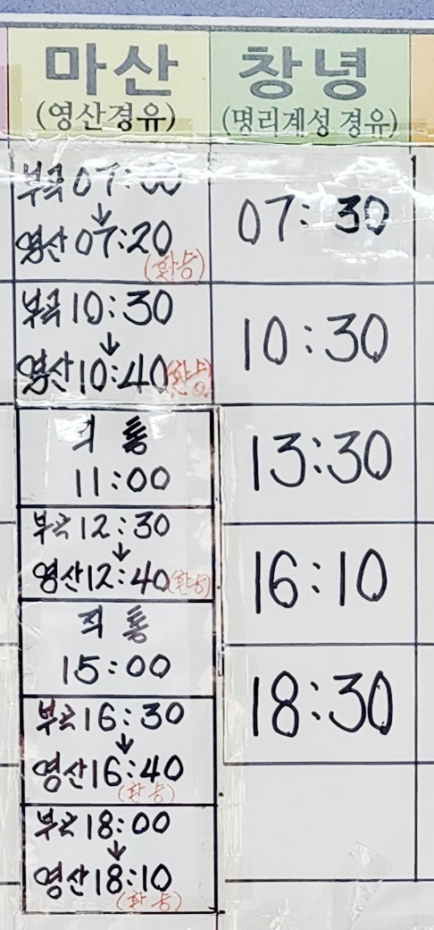 부곡 출발 마산, 영산, 명리계성, 창녕 방면.