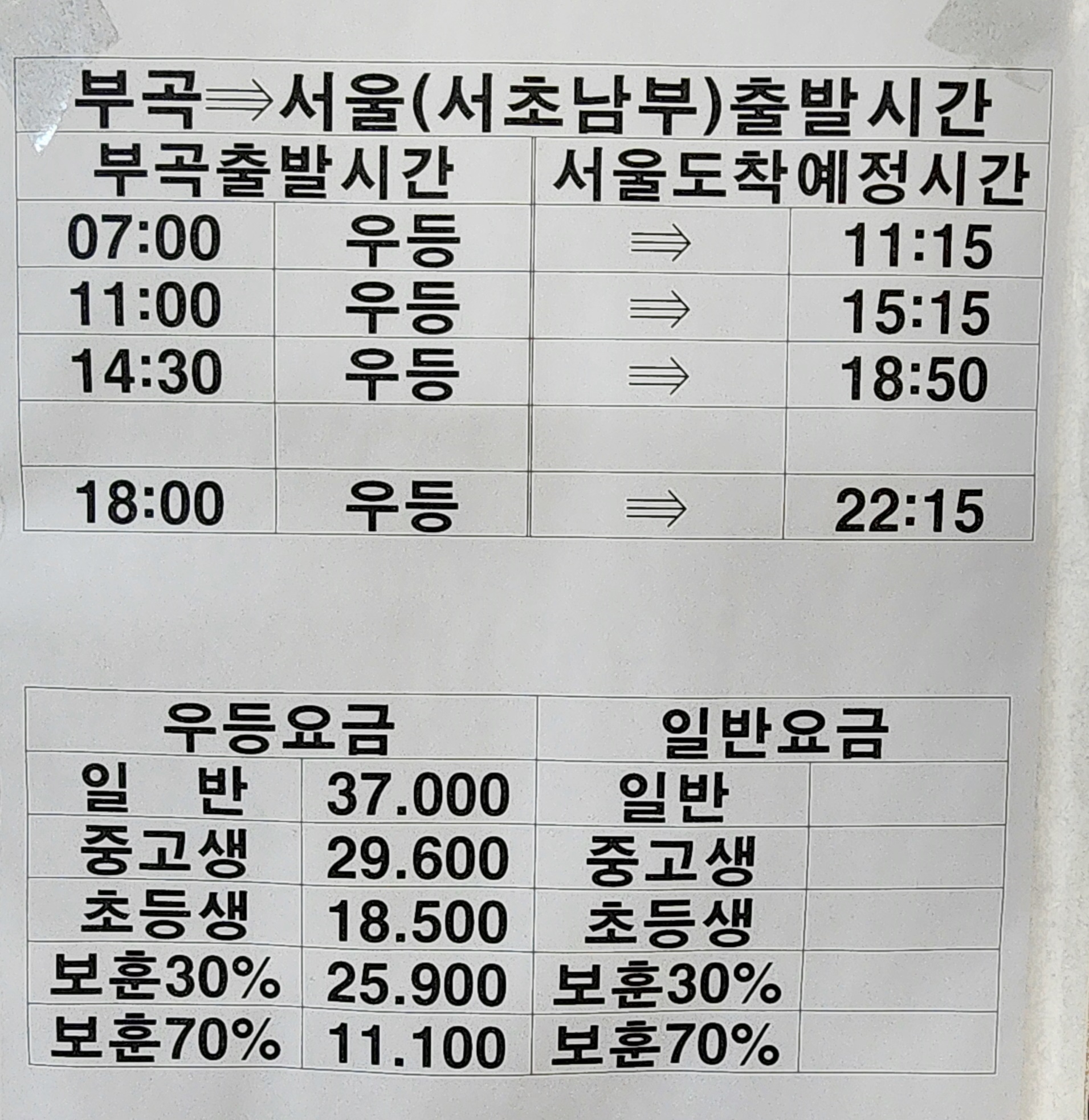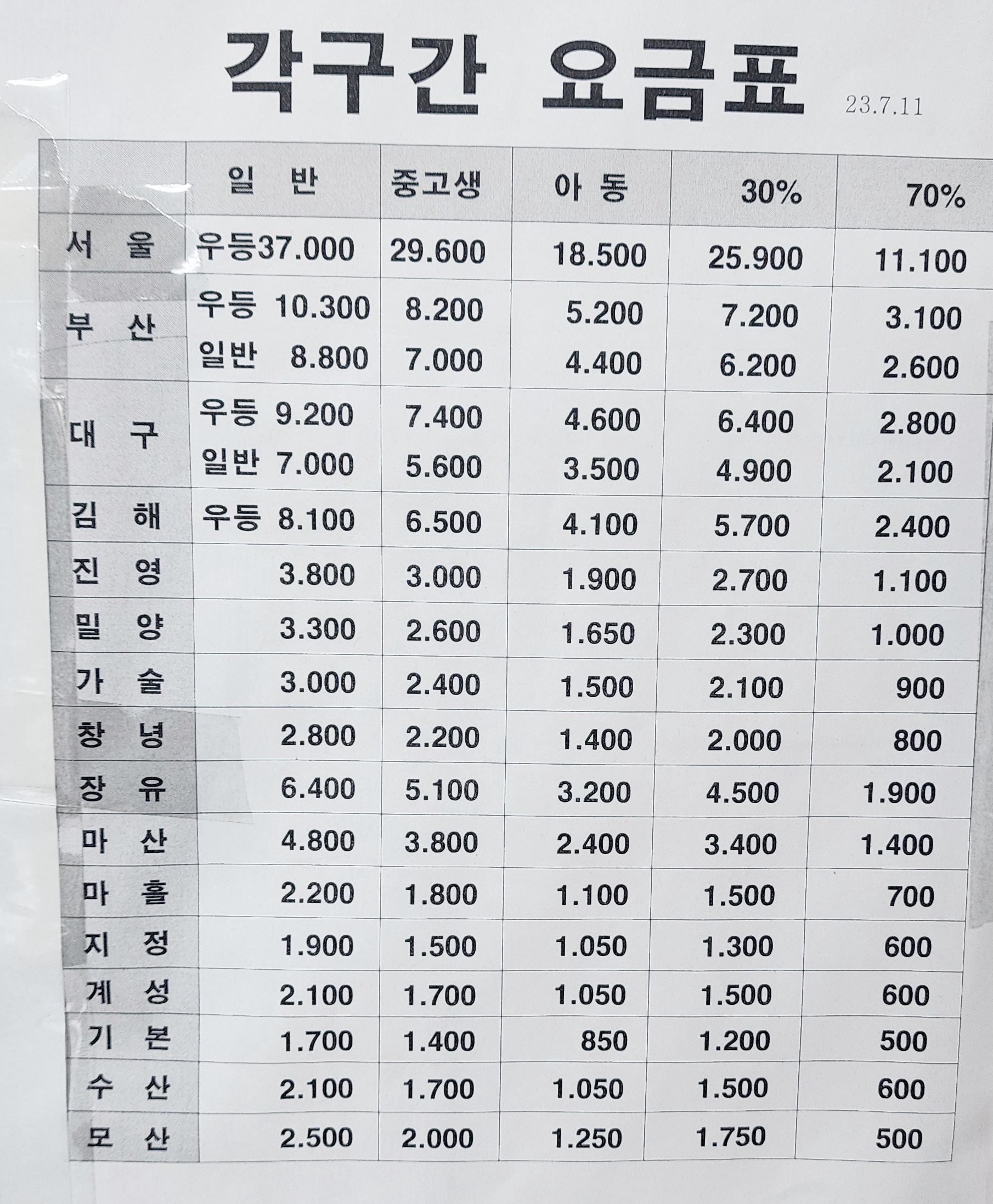 부곡시외버스터미널 각구간 요금표