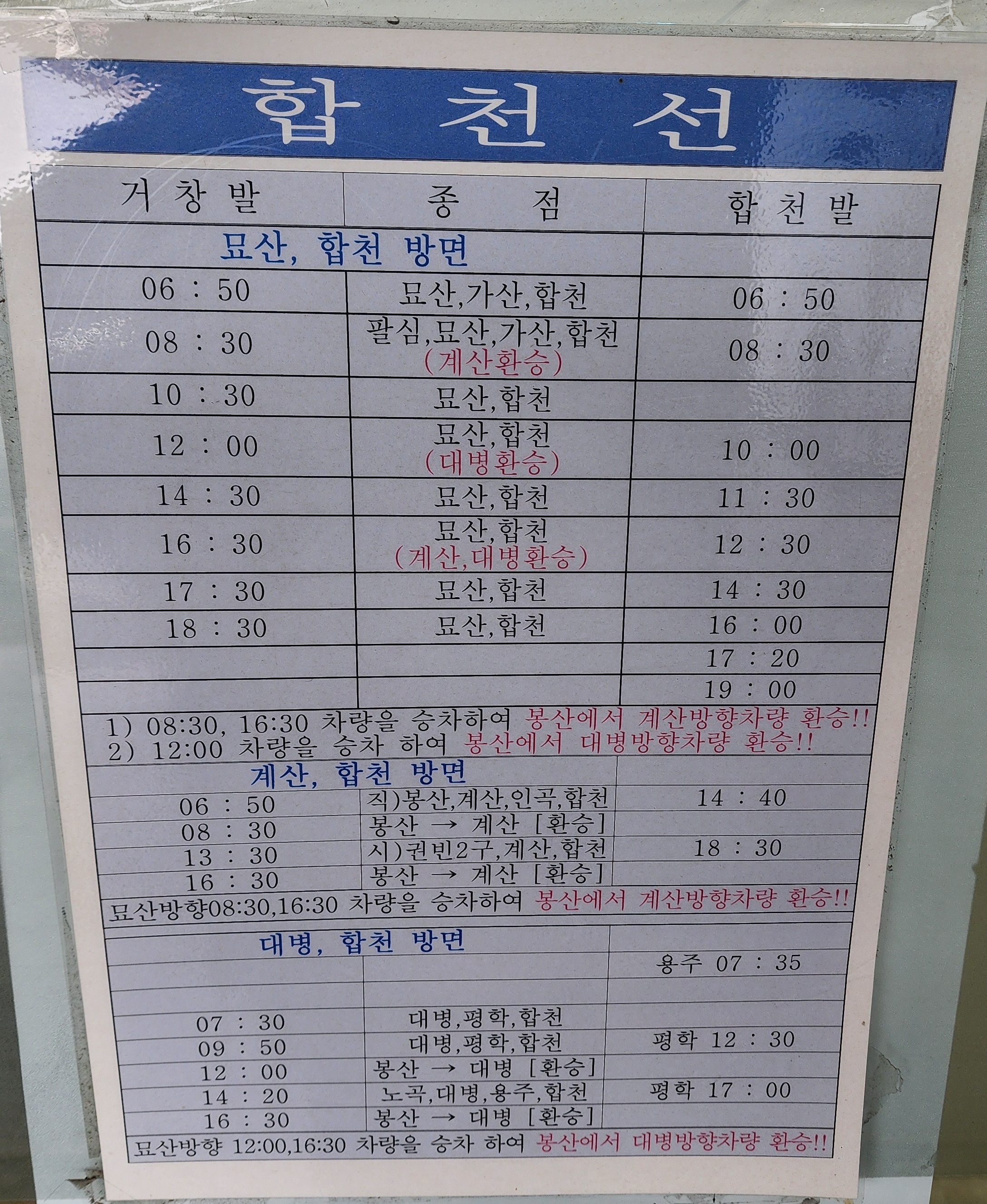 거창 출발 묘산, 계산, 대병, 합천 방면.