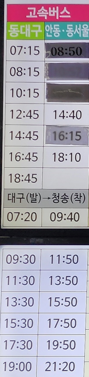청송 출발 동대구, 안동, 동서울 방면.