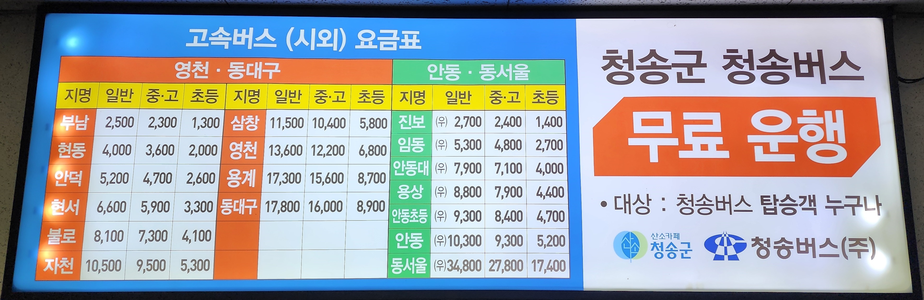 청송시외버스터미널 요금표