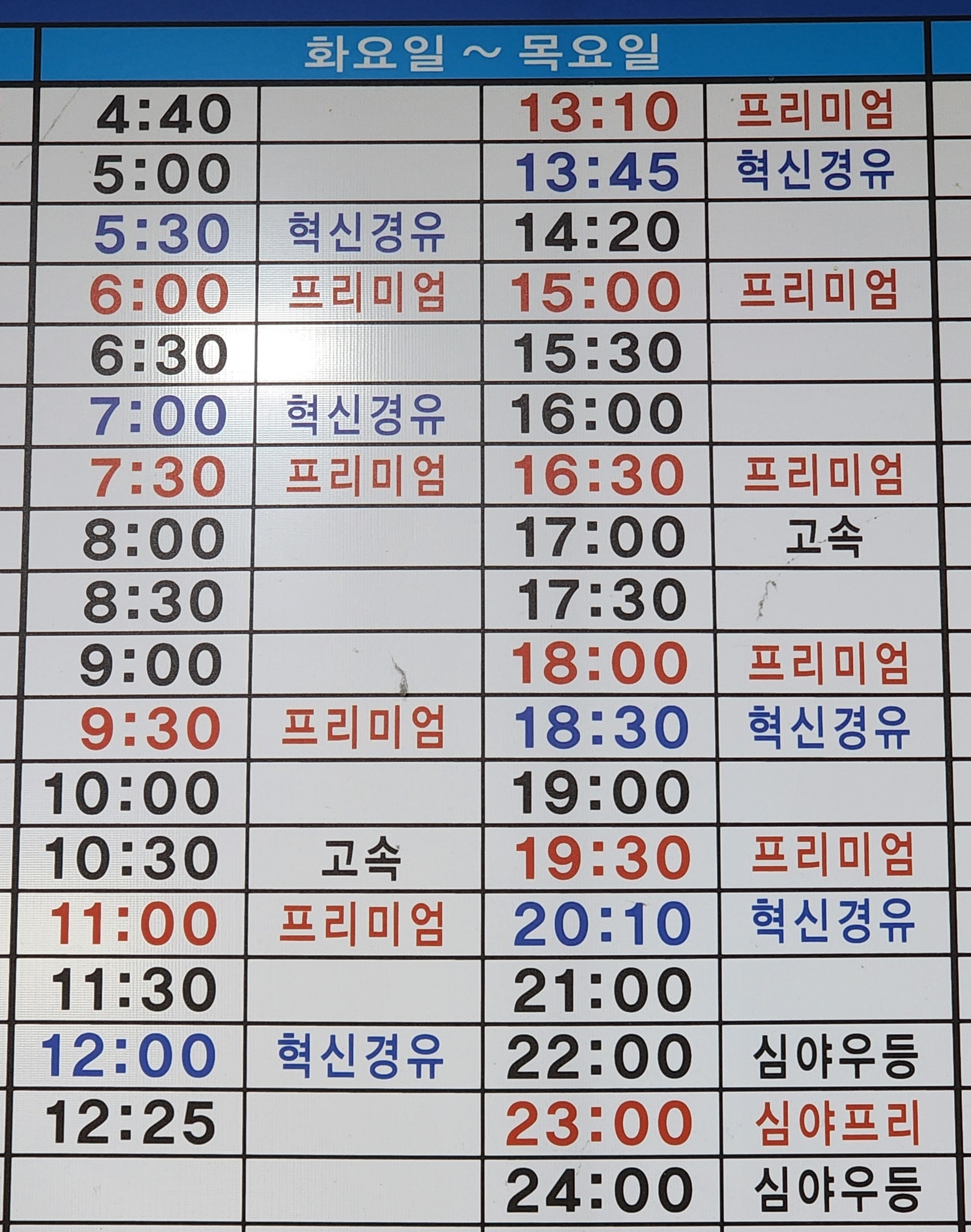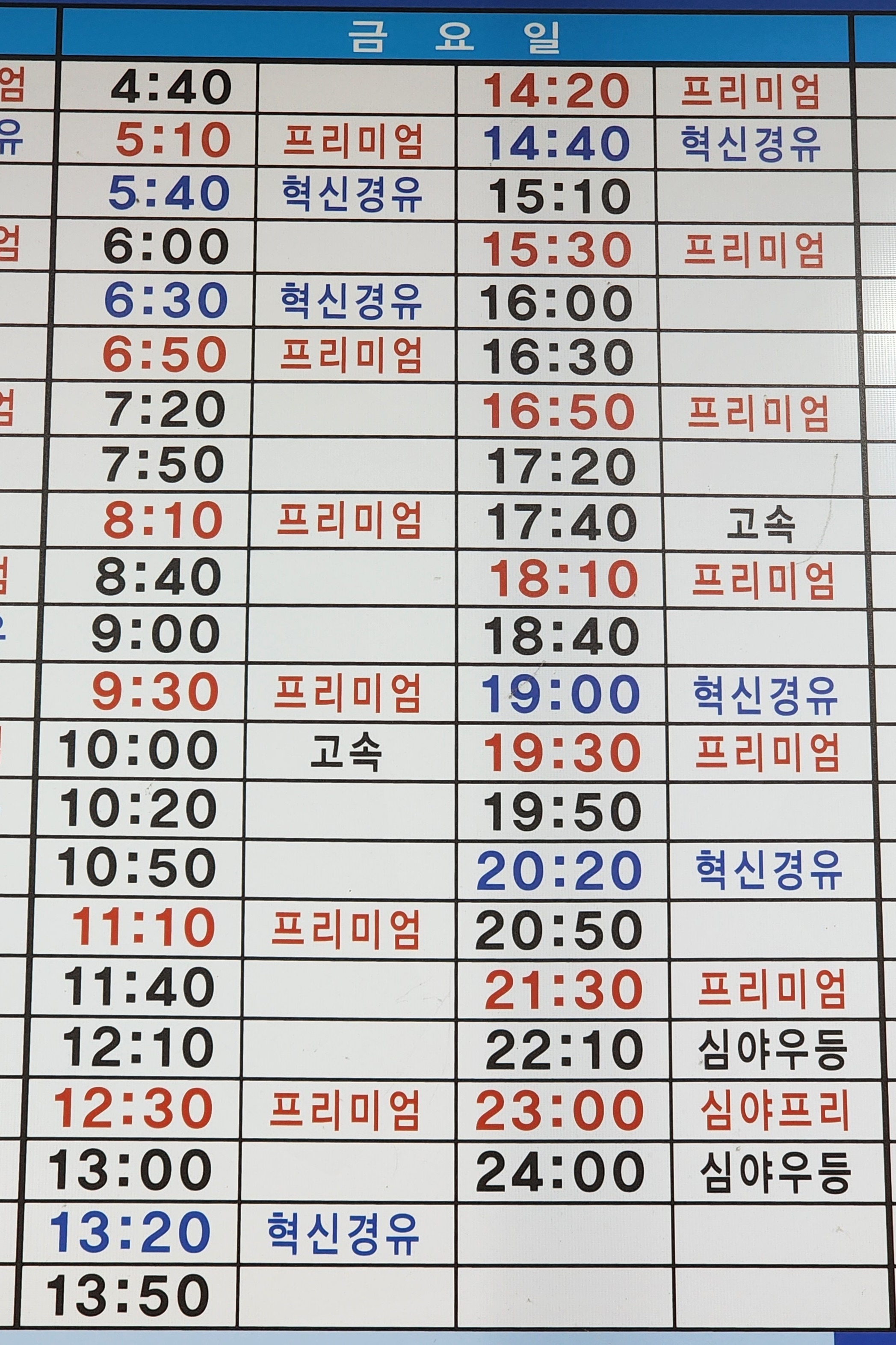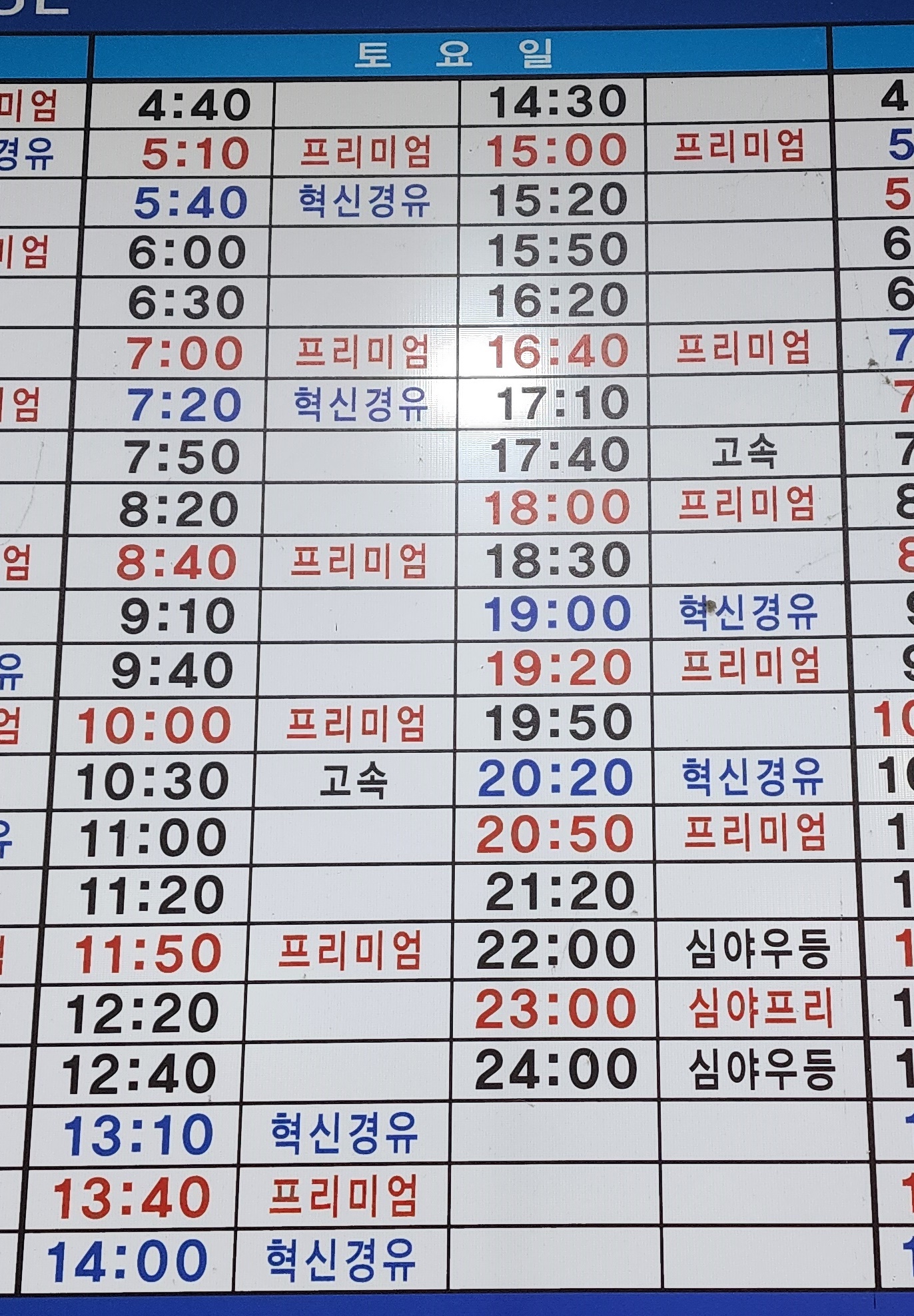 진주 출발 서울, 동서울,수원, 인천, 성남, 용인, 용인시갈, 용인기흥, 광주, 대구 요금표.