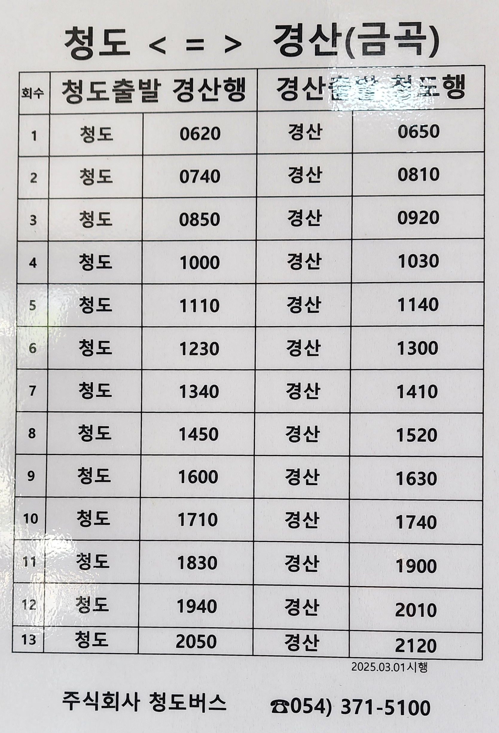 청도 출발 경산, 풍각, 밀양, 울산 방면.