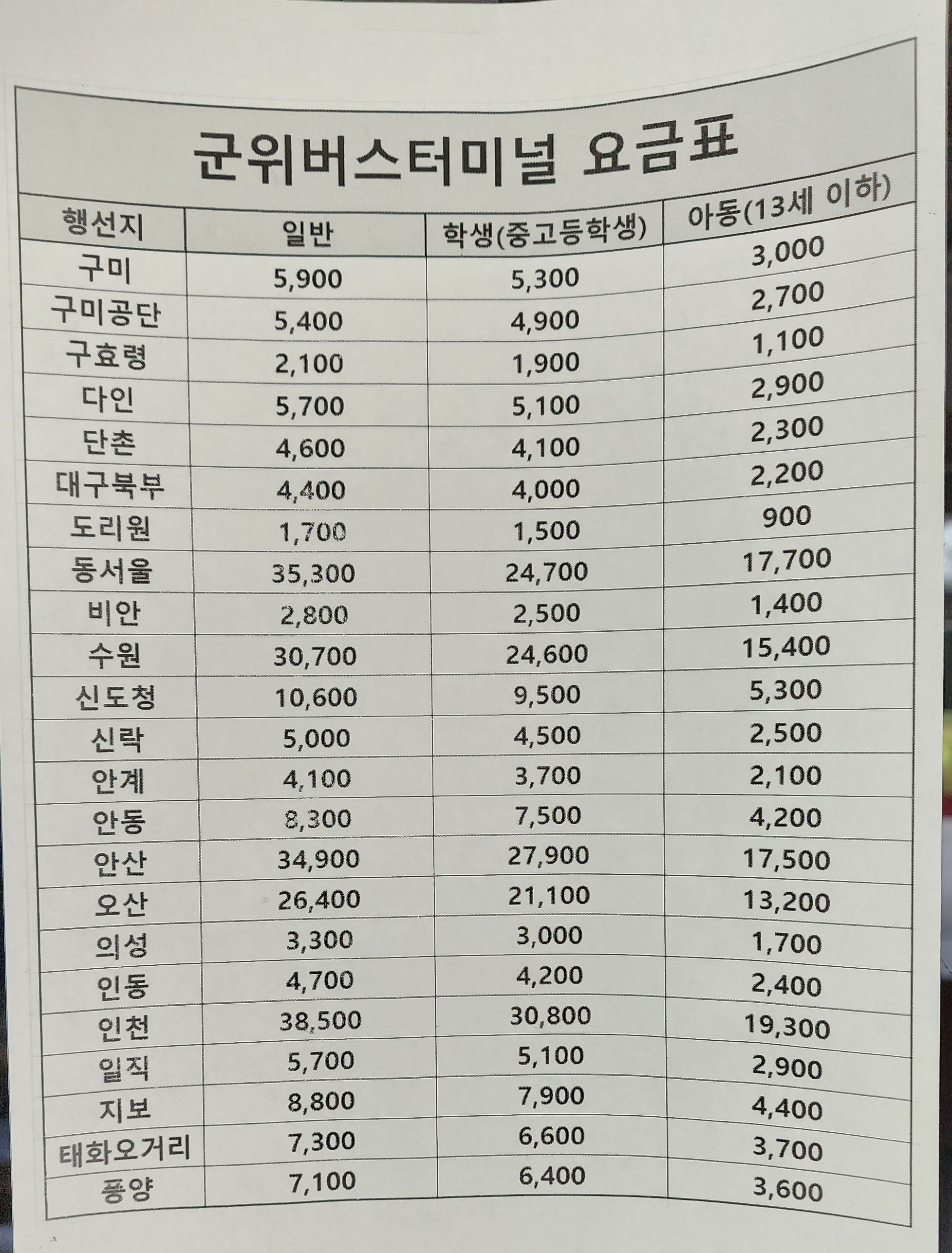 군위버스터미널 요금표