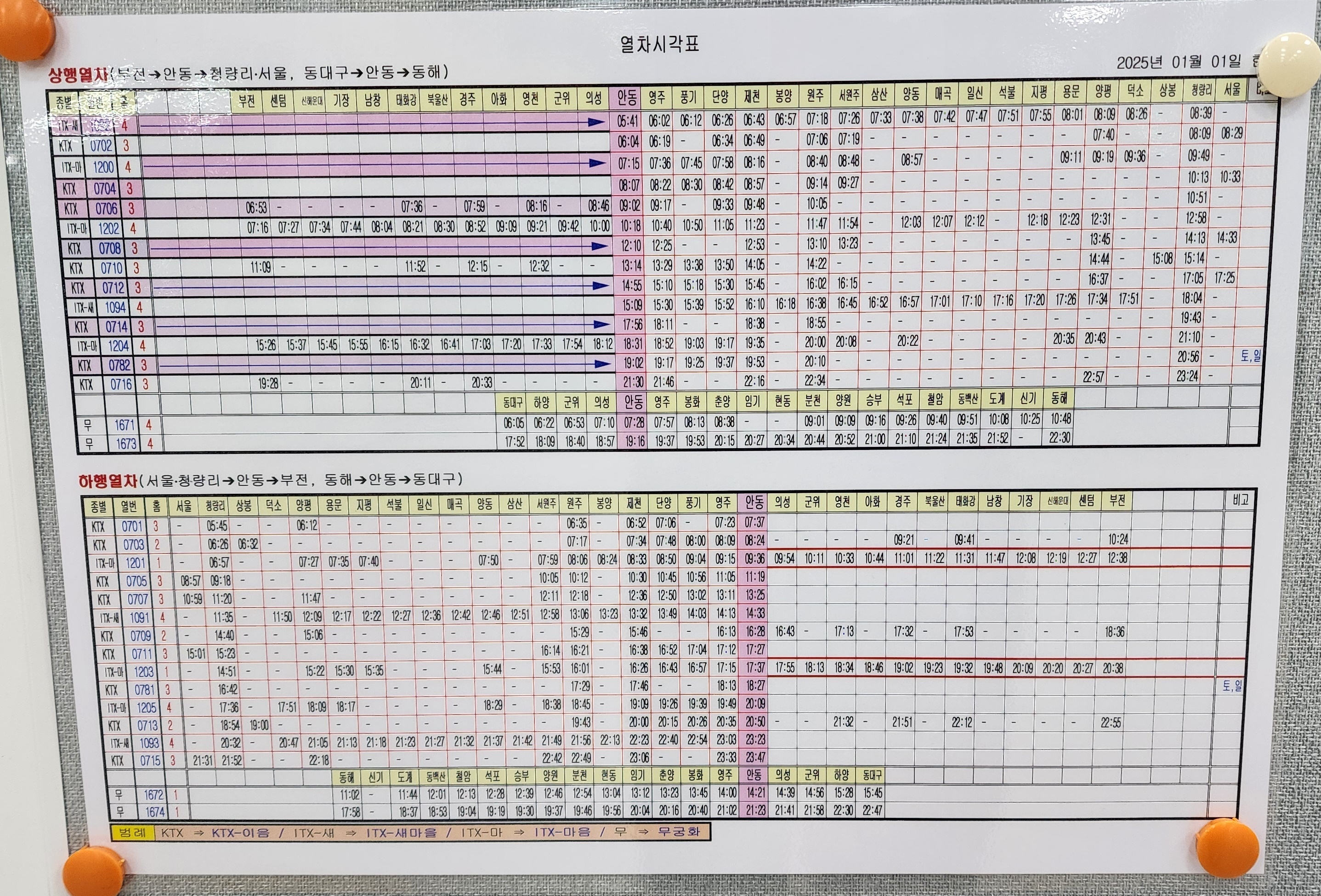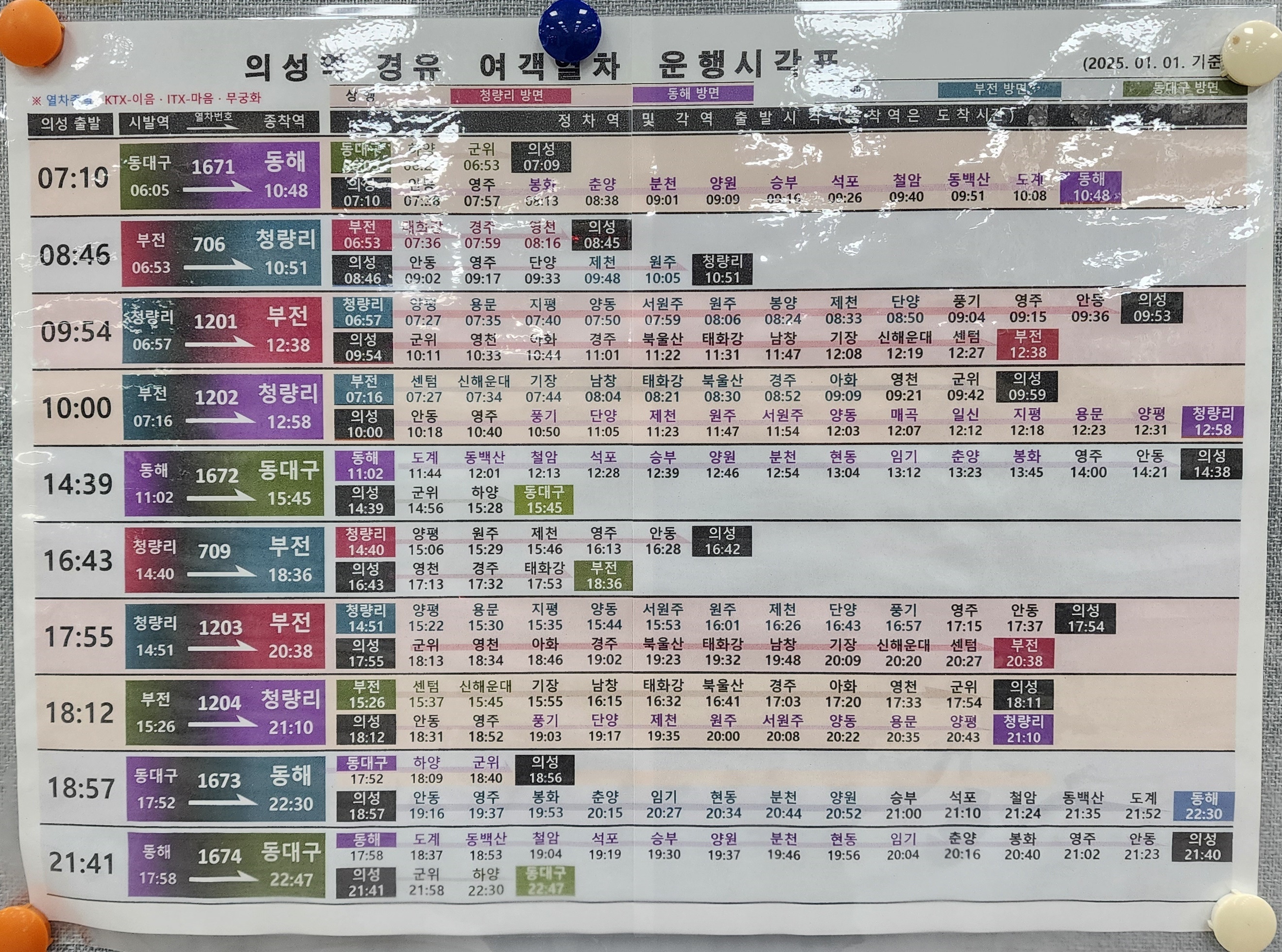 의성 출발 청량리, 부전, 동해, 동대구 방면.