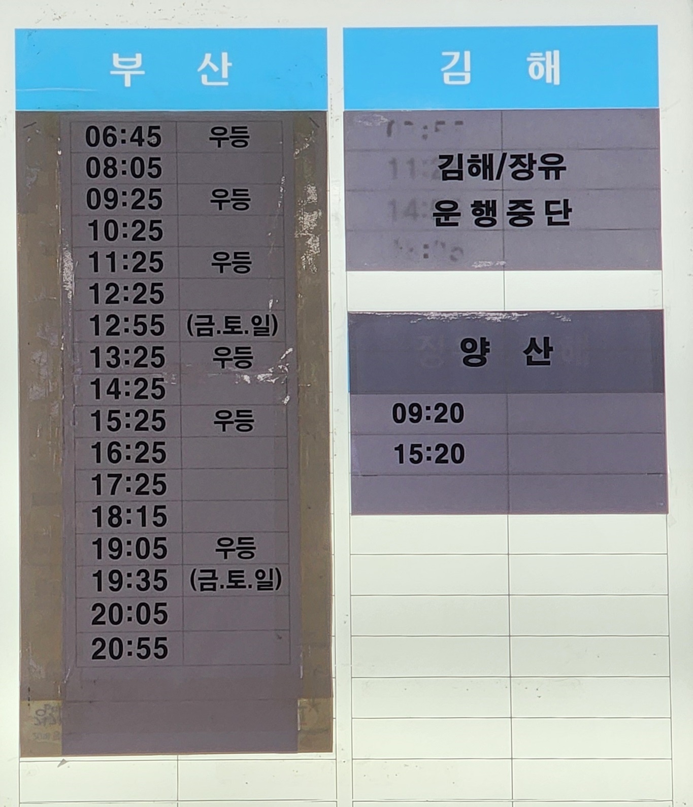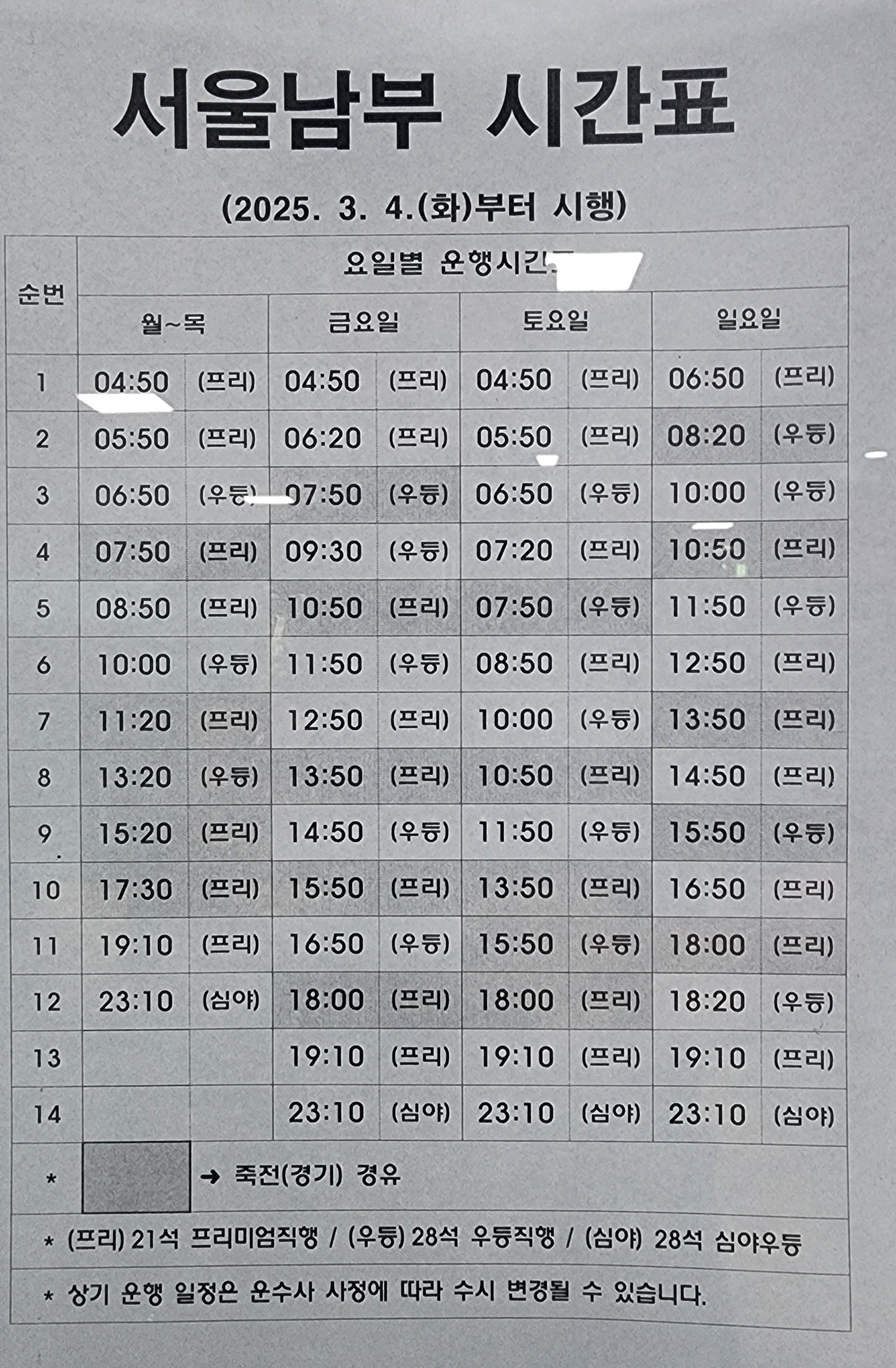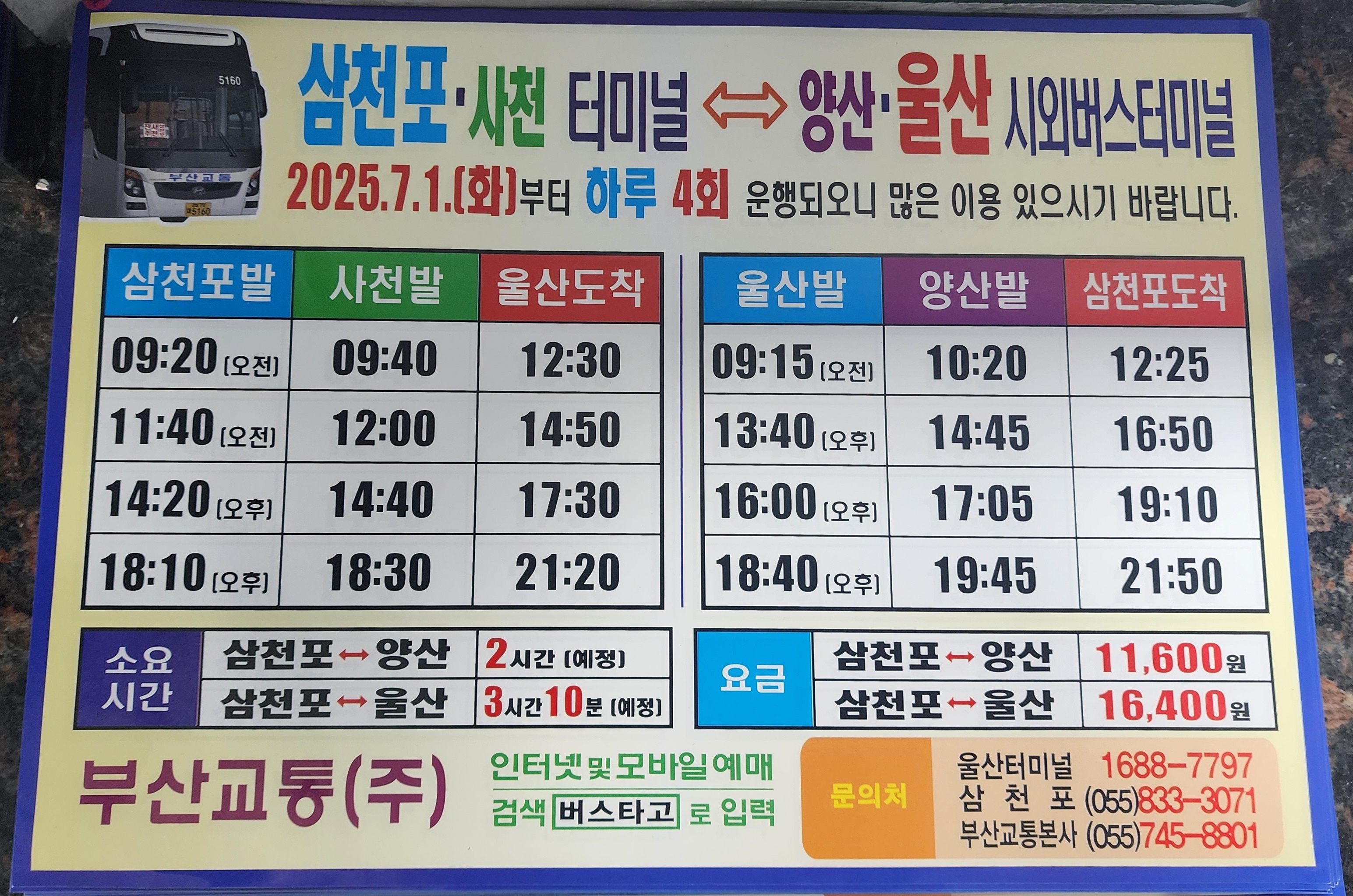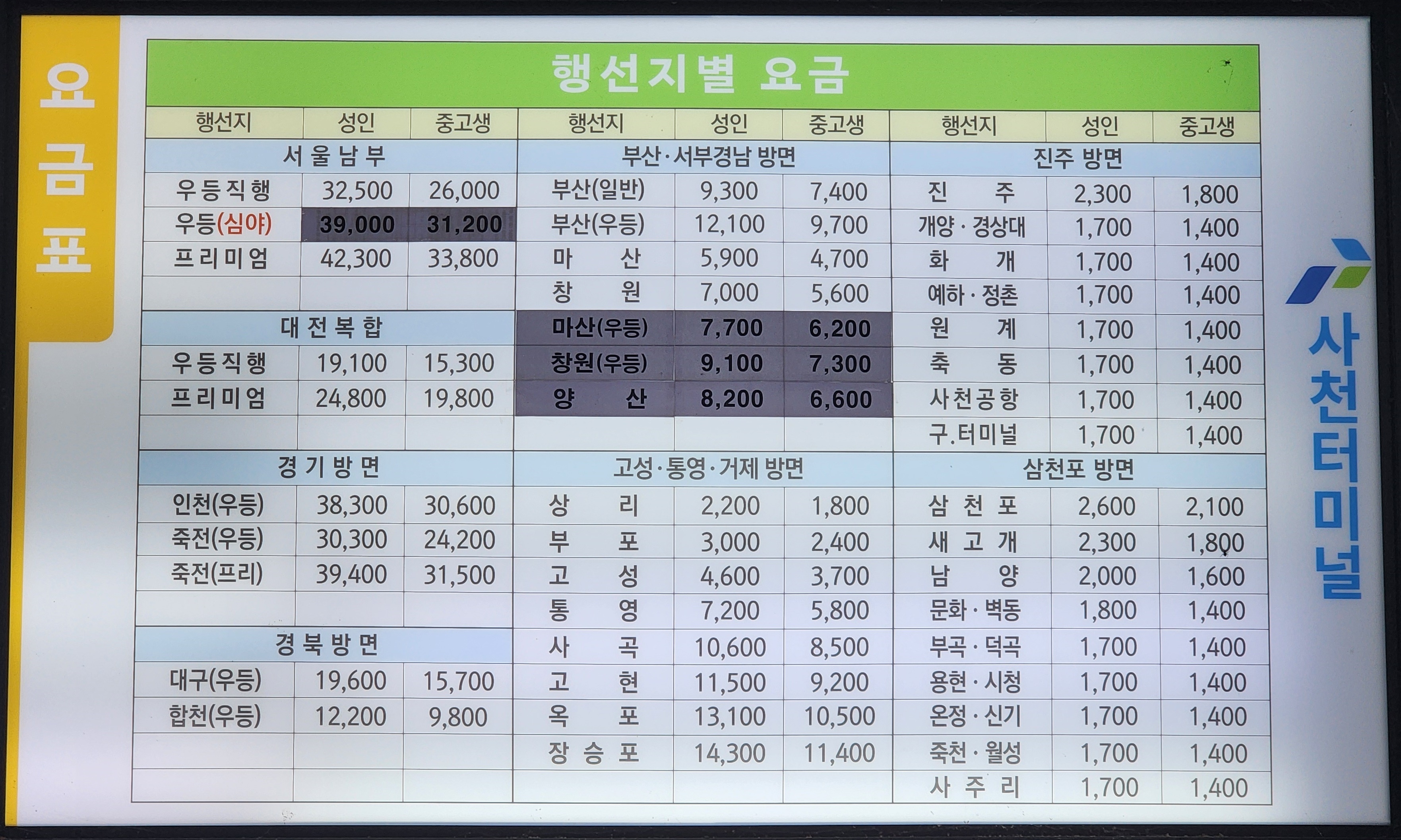 사천 출발 서울 남부, 대전, 대구서부, 합천 방면.