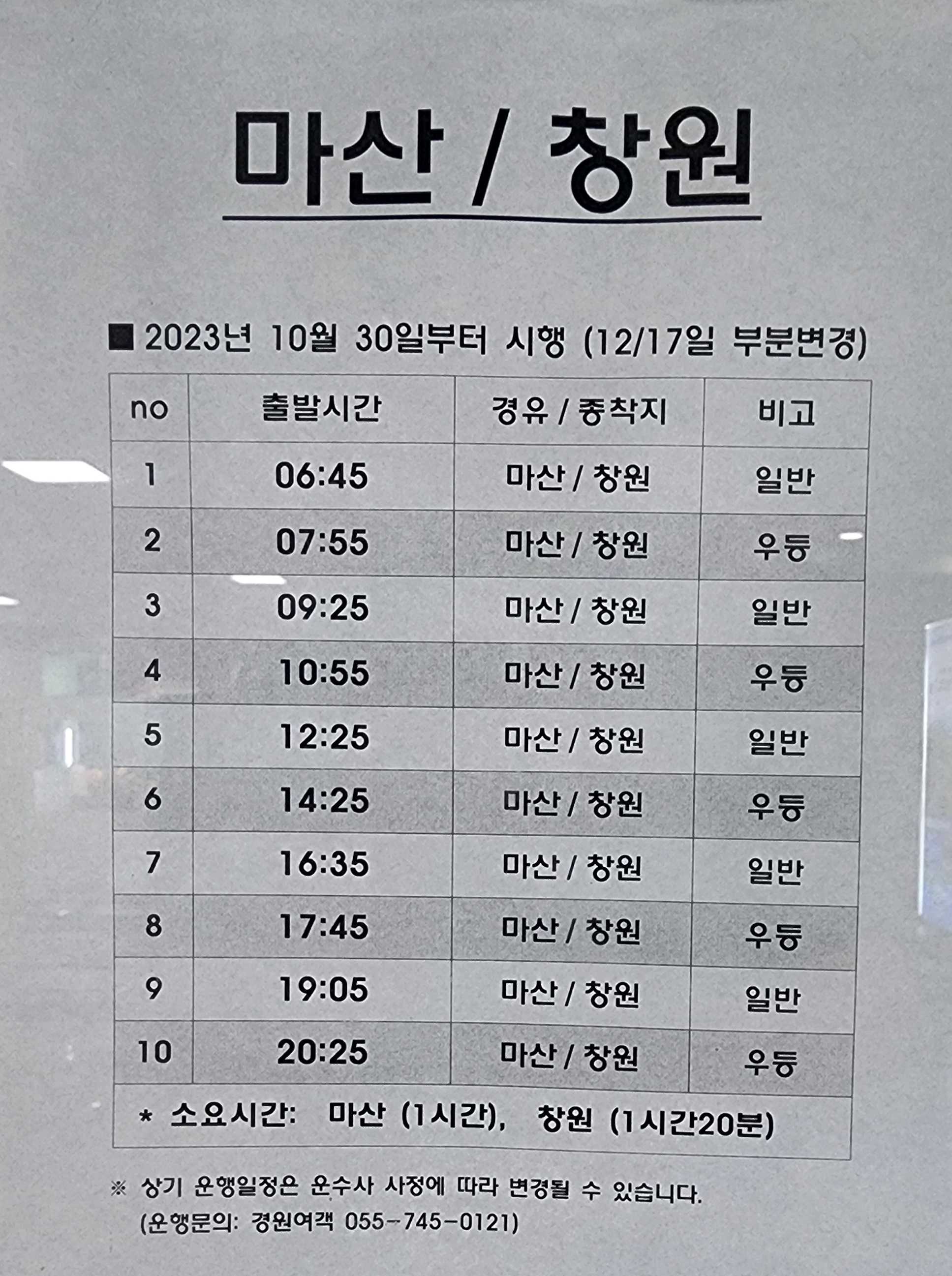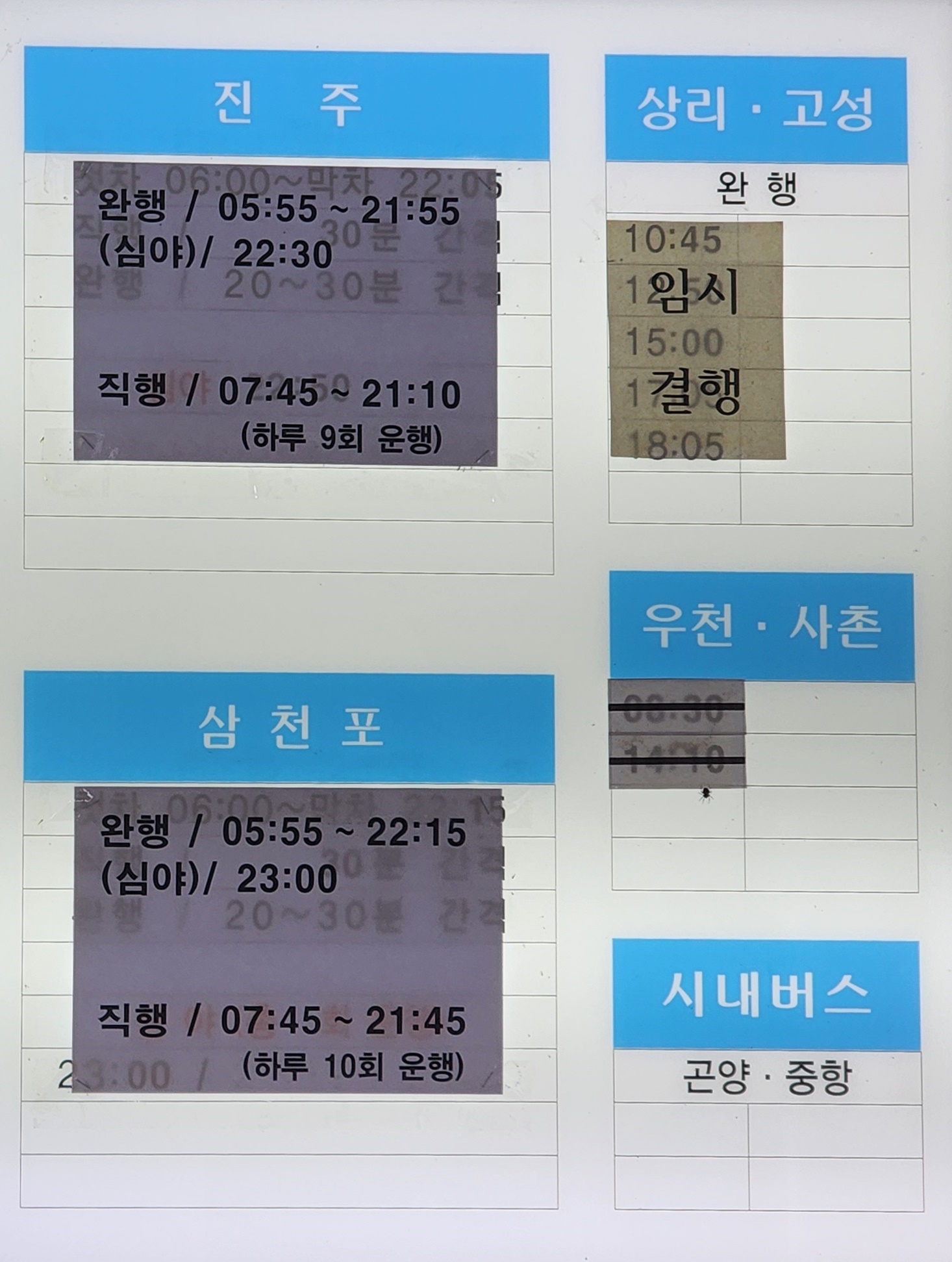 사천 출발 마산, 창원, 고성, 통영, 고현, 장승포 방면.