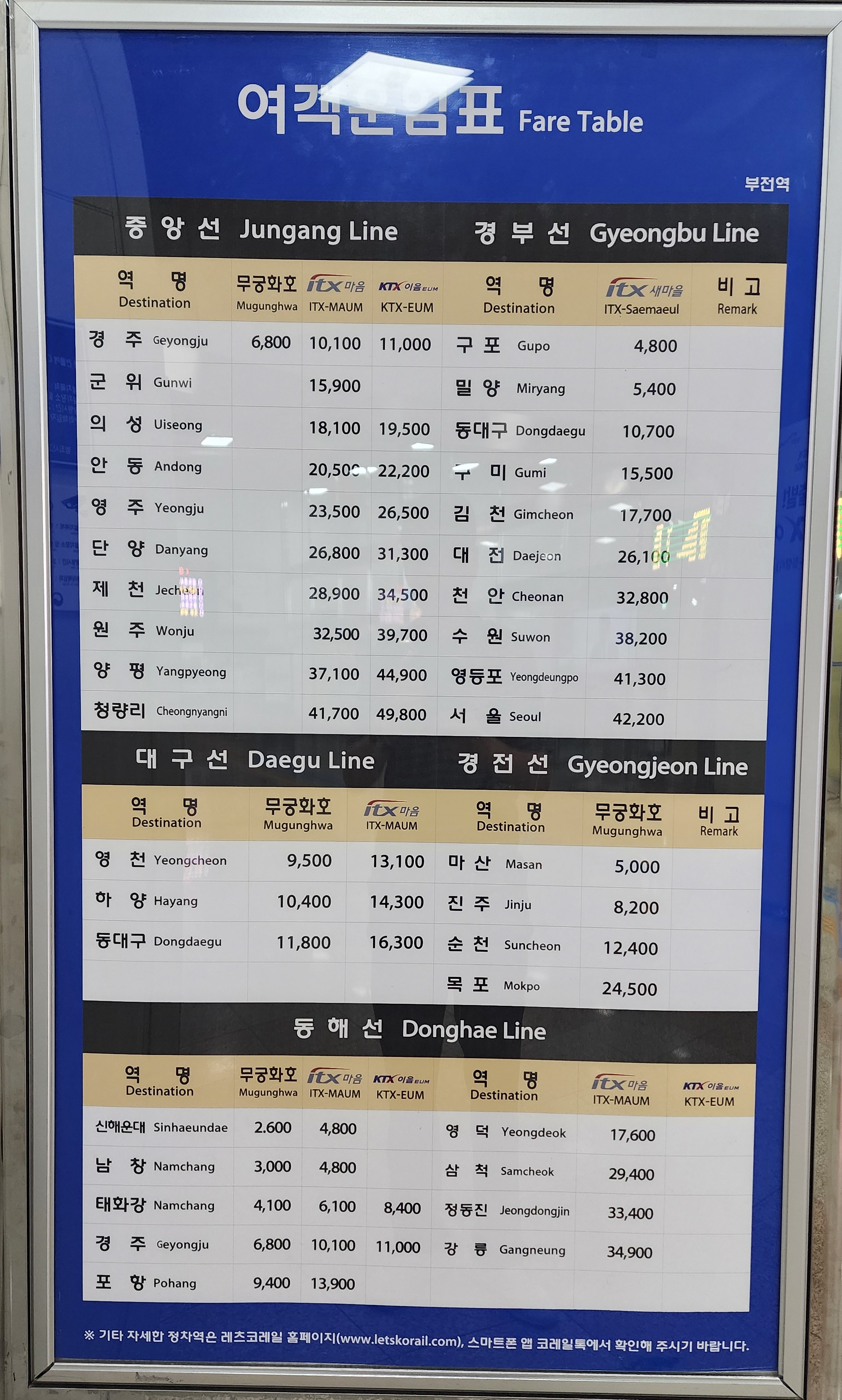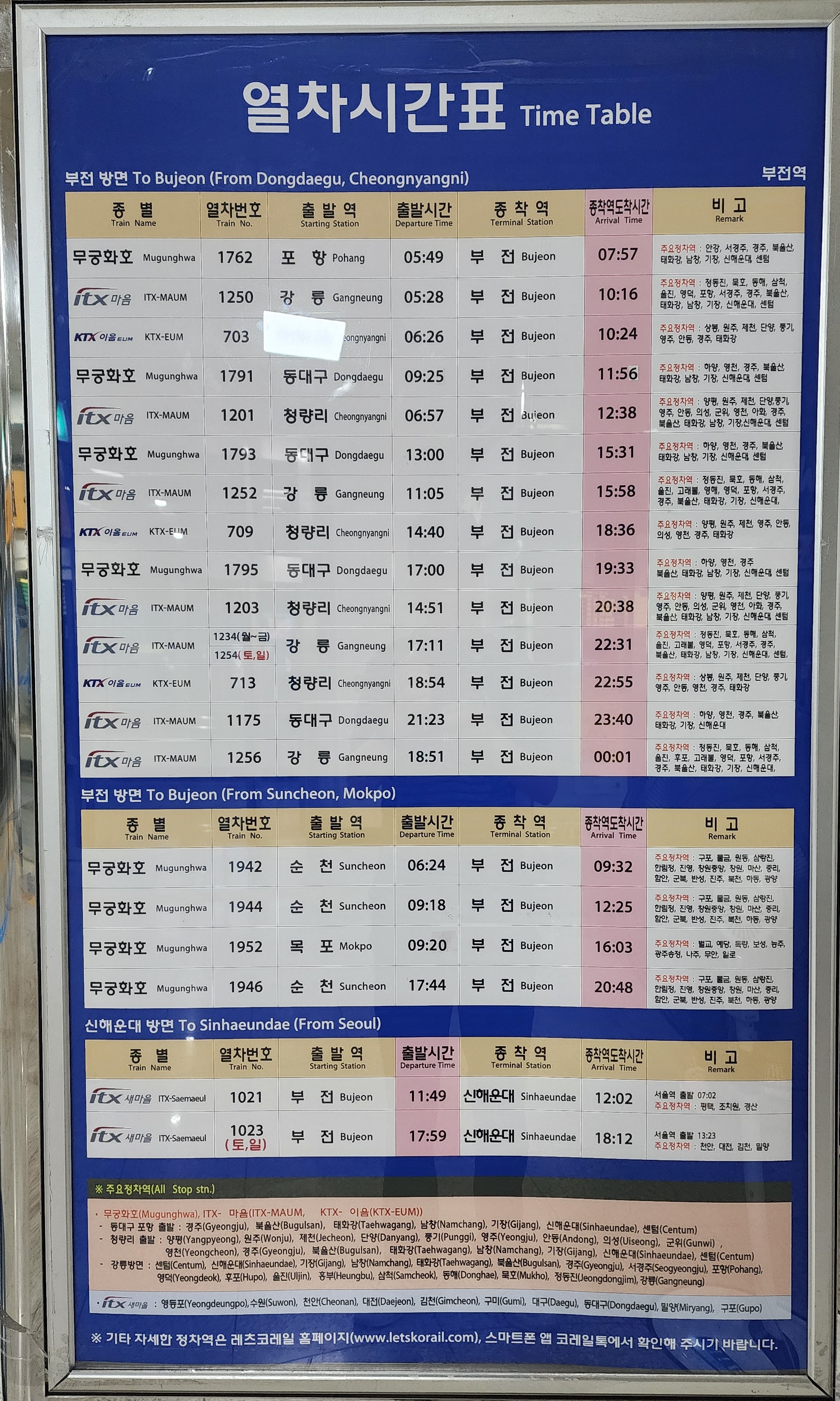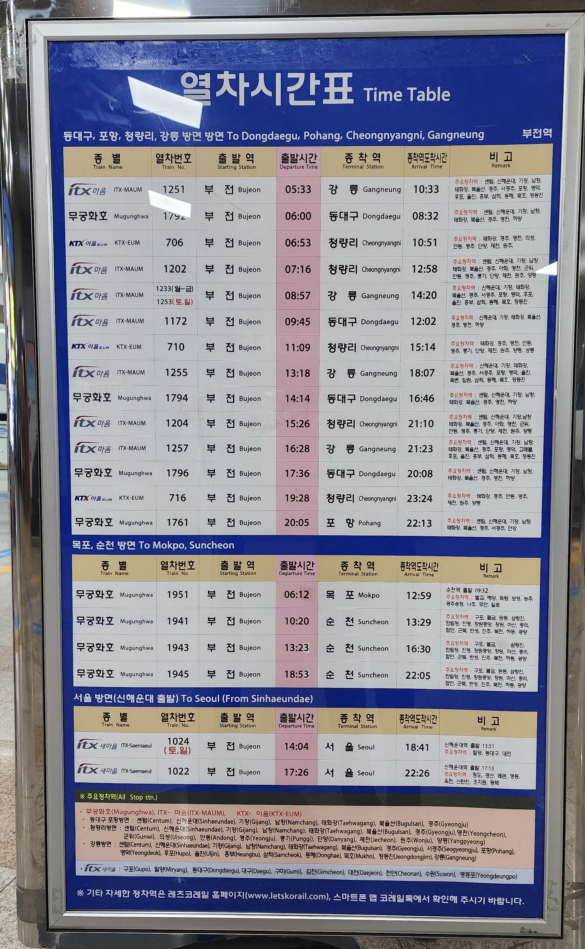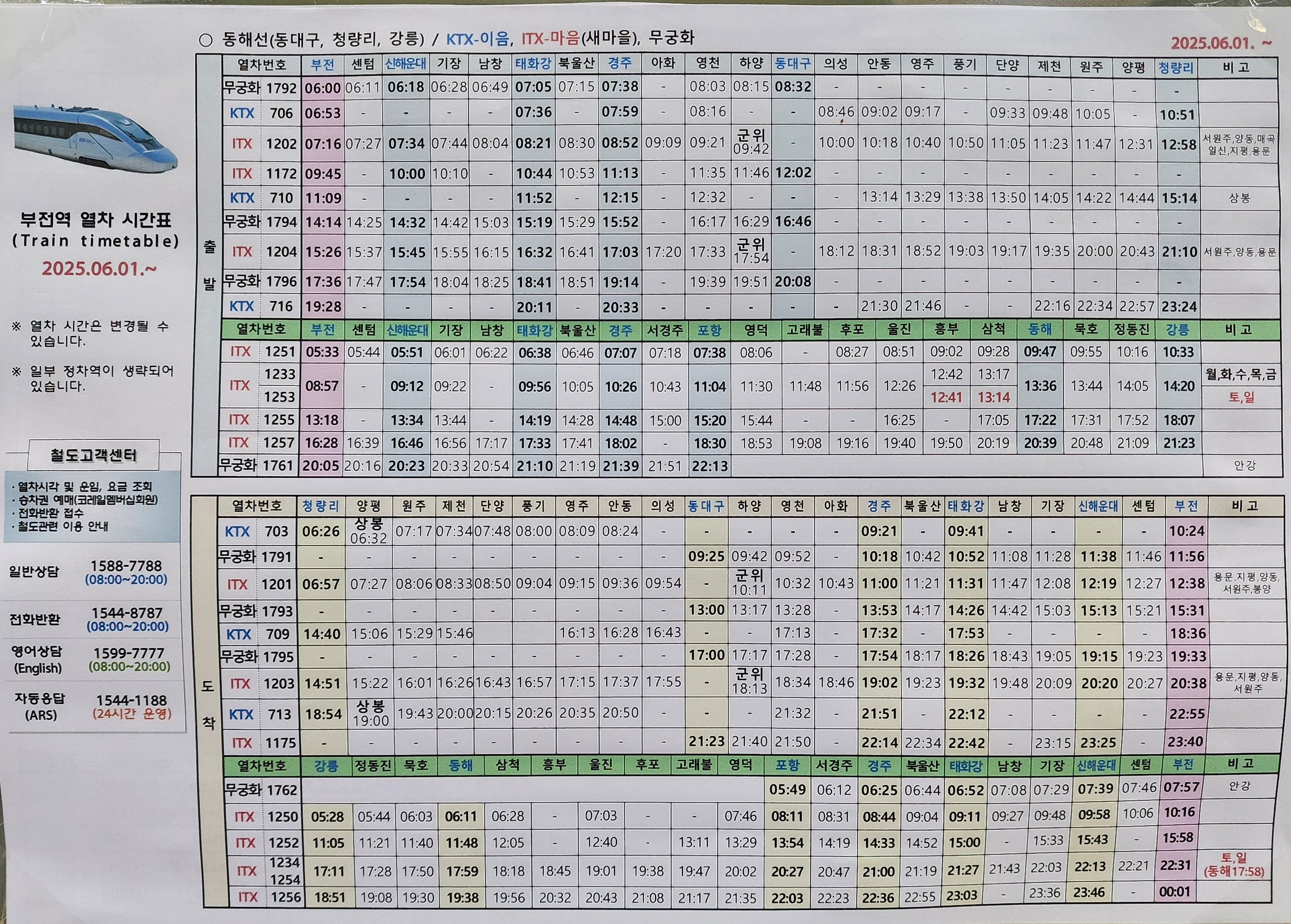부전역 출발 동해선 동대구, 청량리, 강릉 KTX-이음, ITX-마음, 무궁화