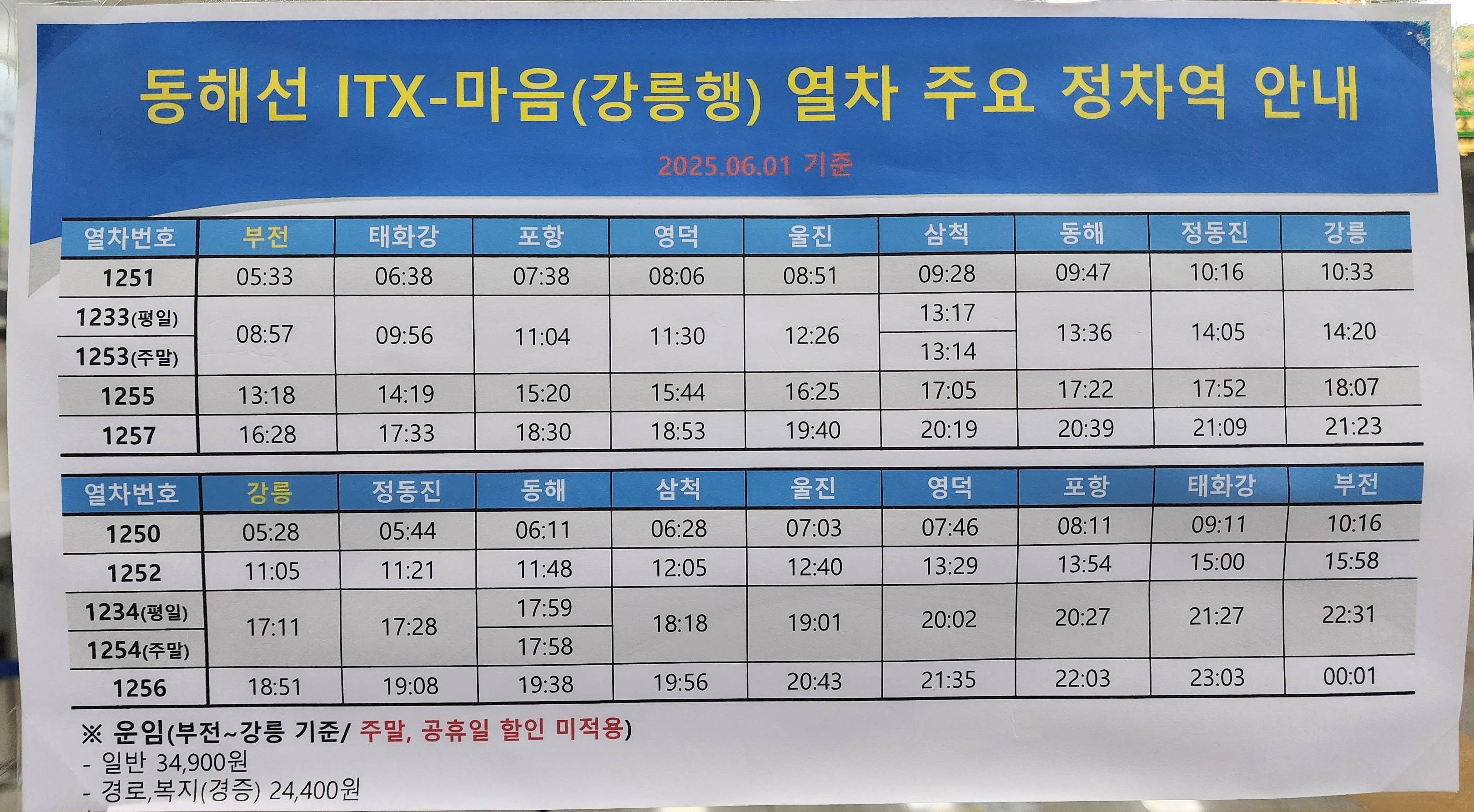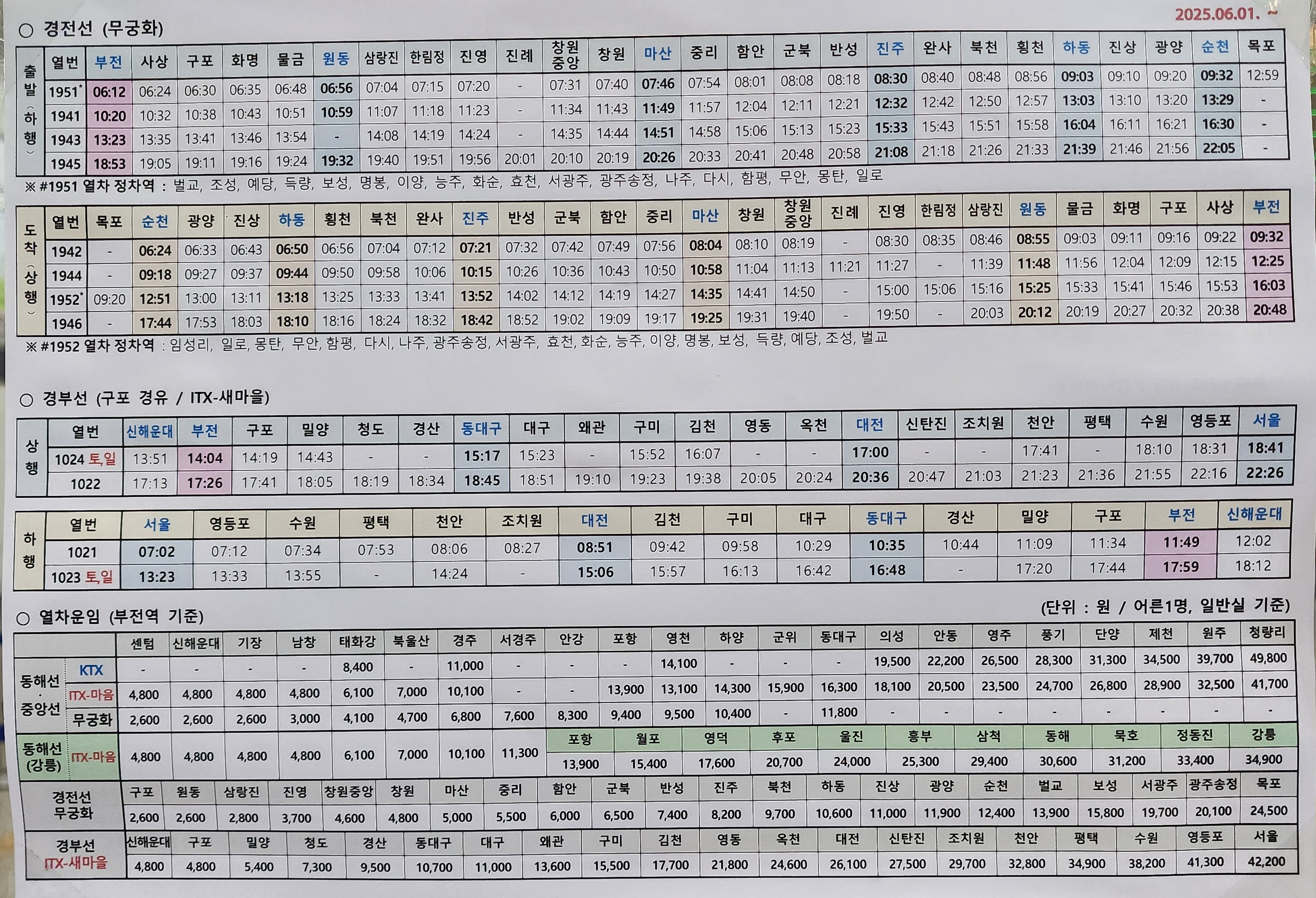 부전 출발 태화강, 포항, 영덕, 울진, 삼척, 동해, 정동진, 강릉 방면.