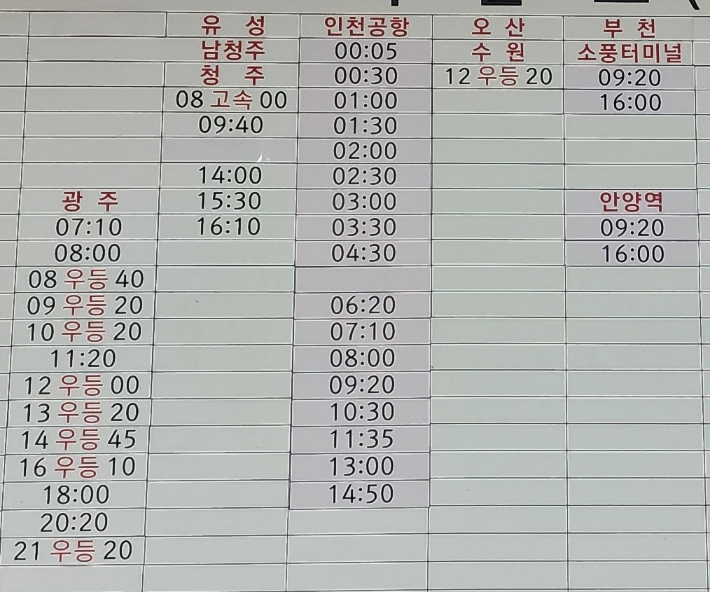 익산 출발 광주, 유성, 남청주, 청주, 인천공항, 오산, 수원, 부천, 소풍터미널, 안양역 방면.