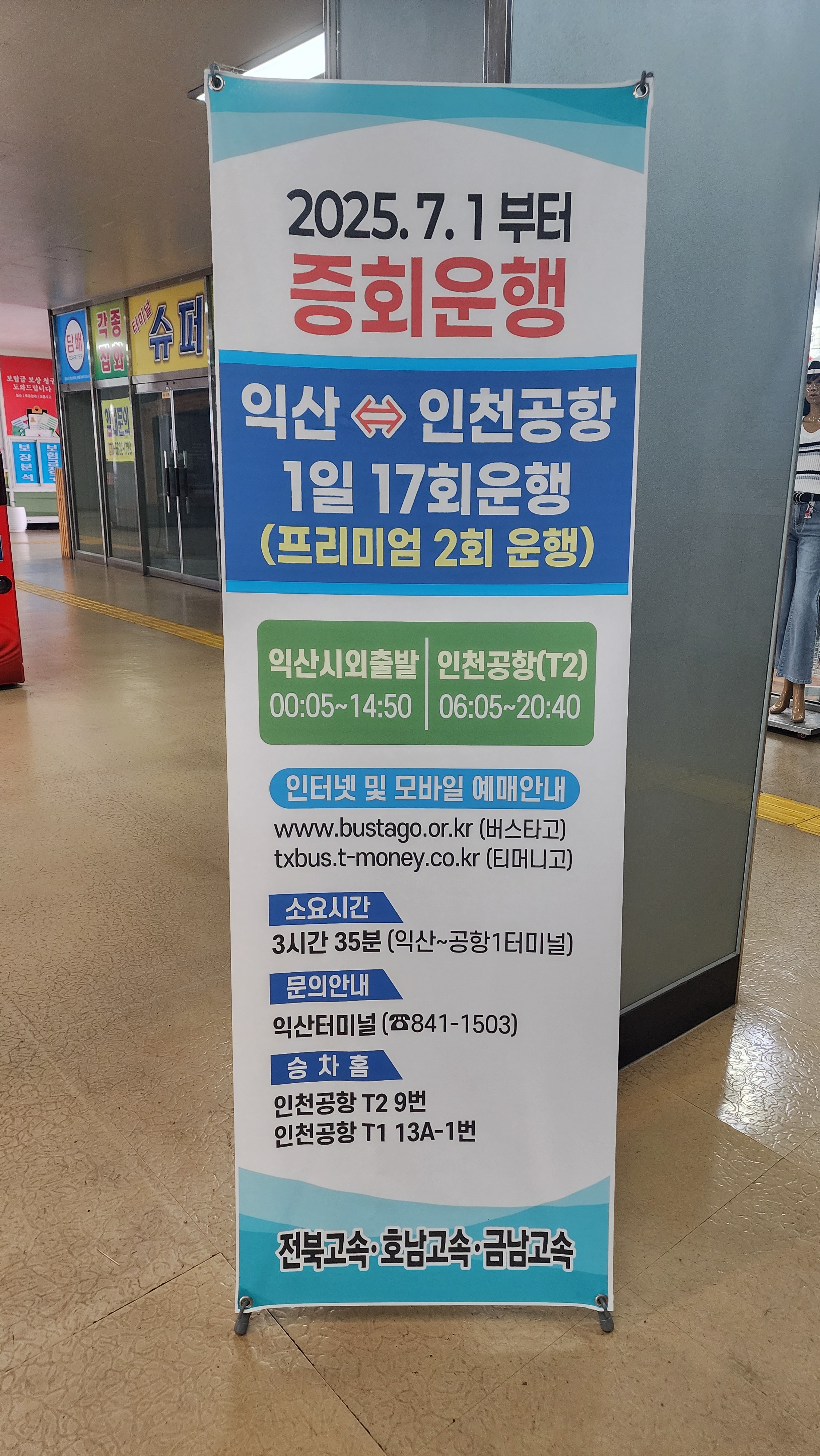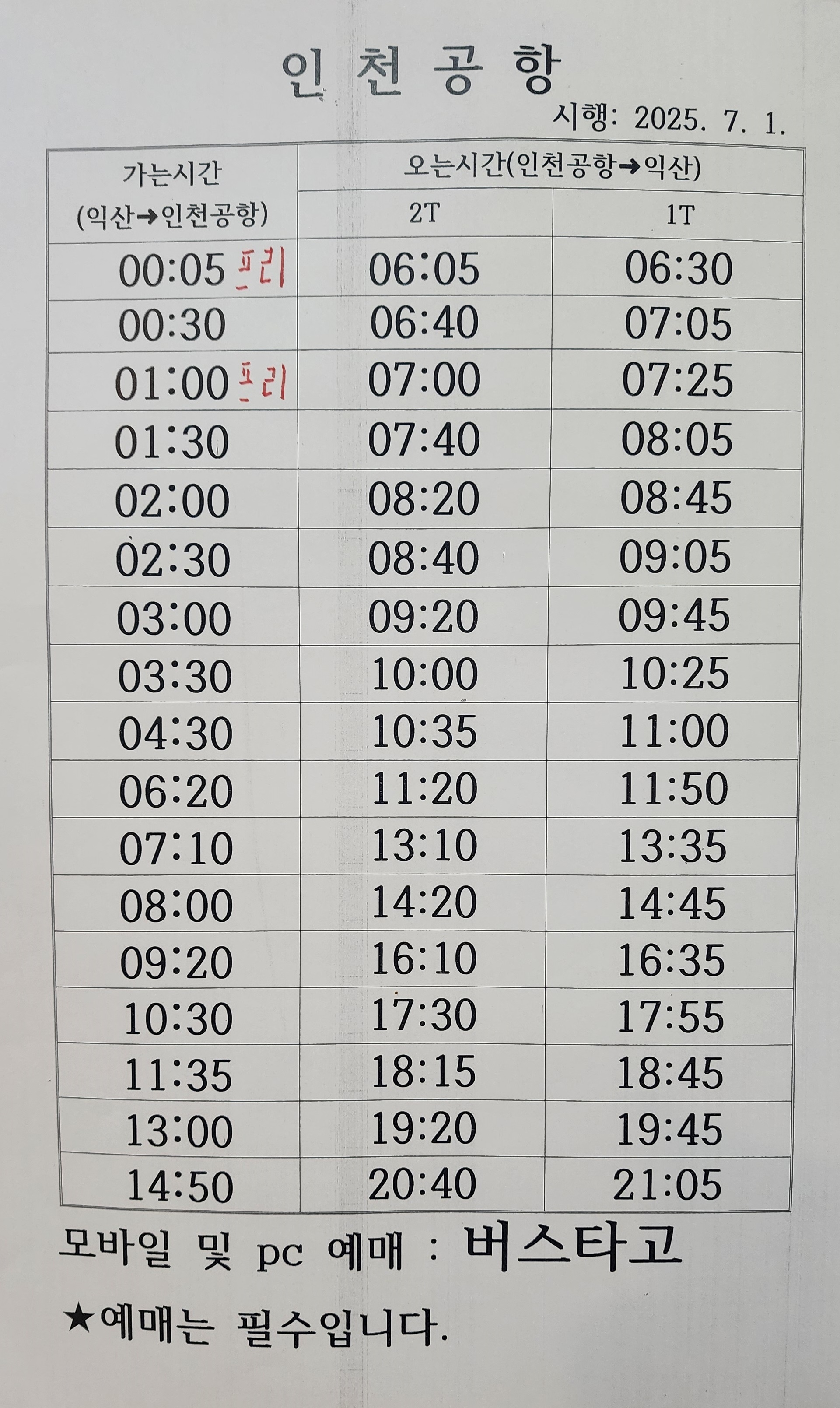 익산 출발 인천공항 방면 시행일자 2025년 7월 1일.