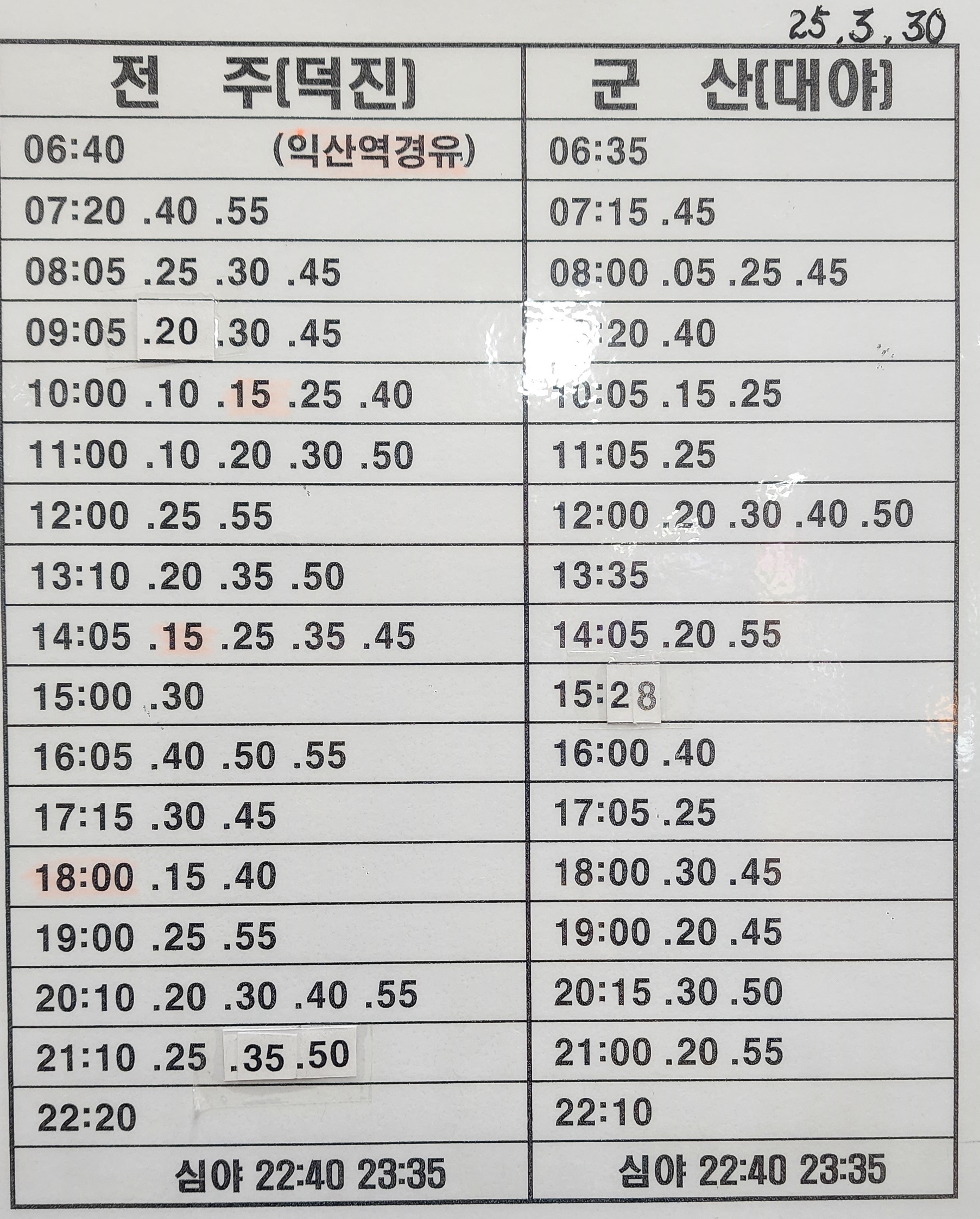 익산 출발 전주, 군산 방면(25년 3월 30일 시행)