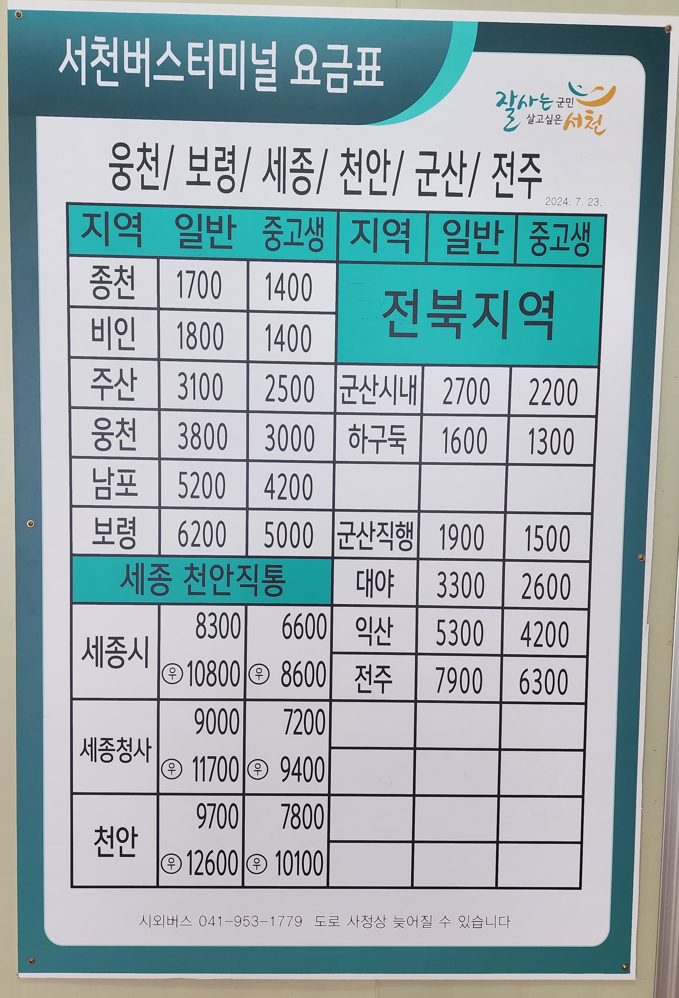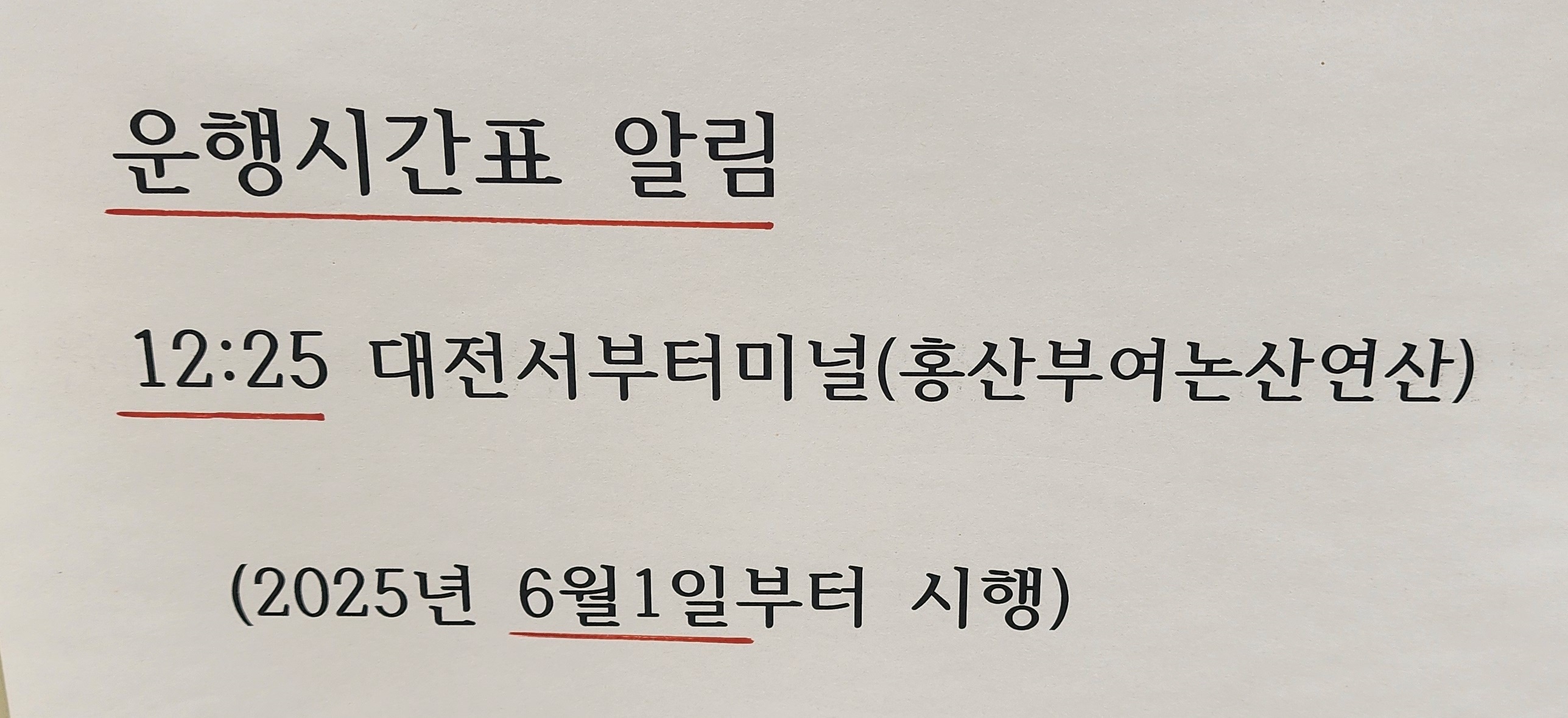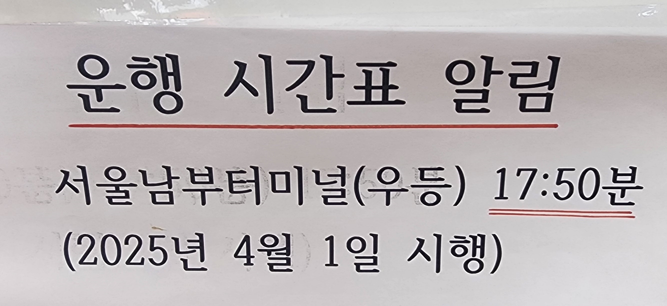 서천 출발 서울 남부터미널 17:50분 2025년 4월 1일 시행
