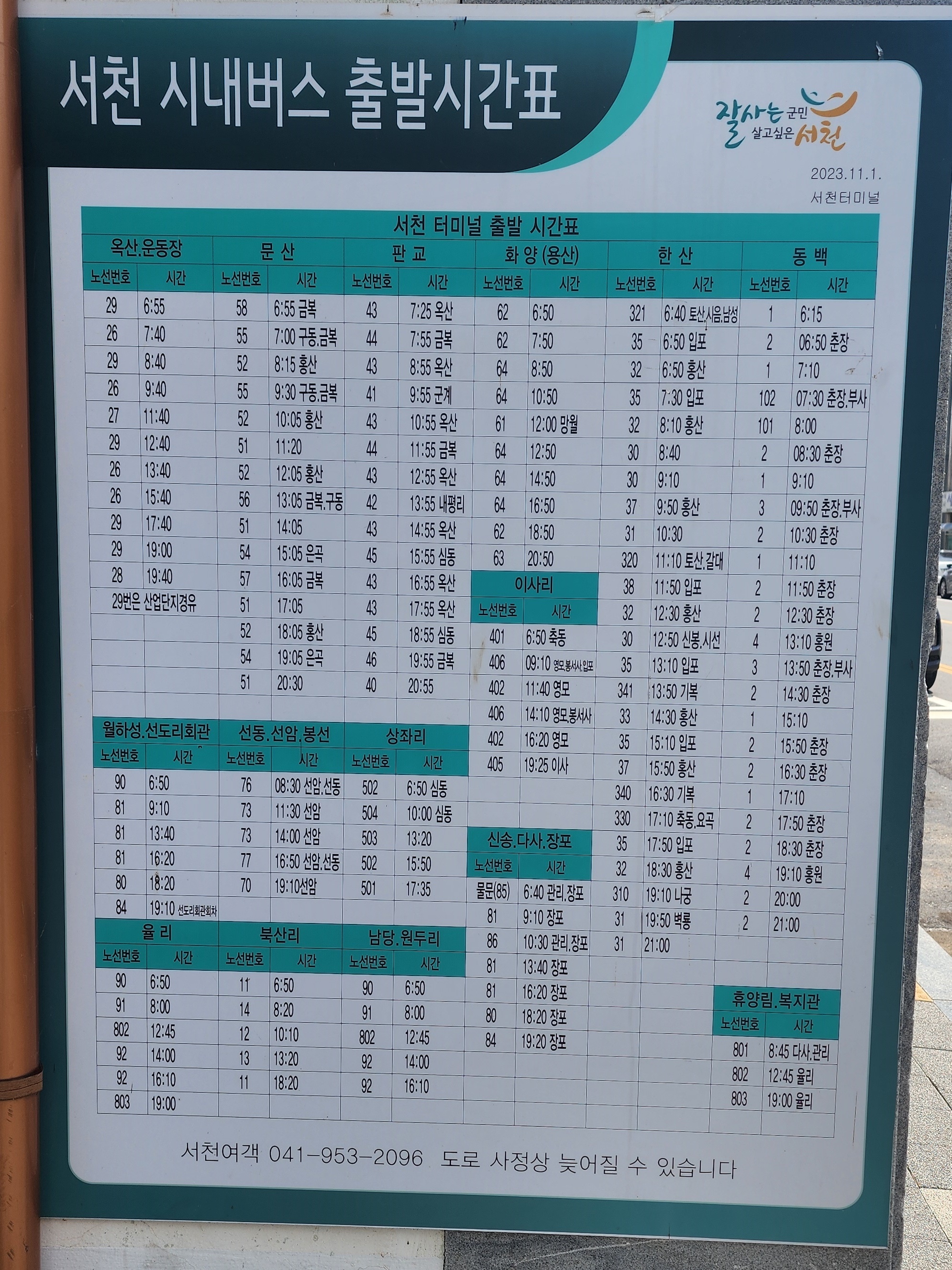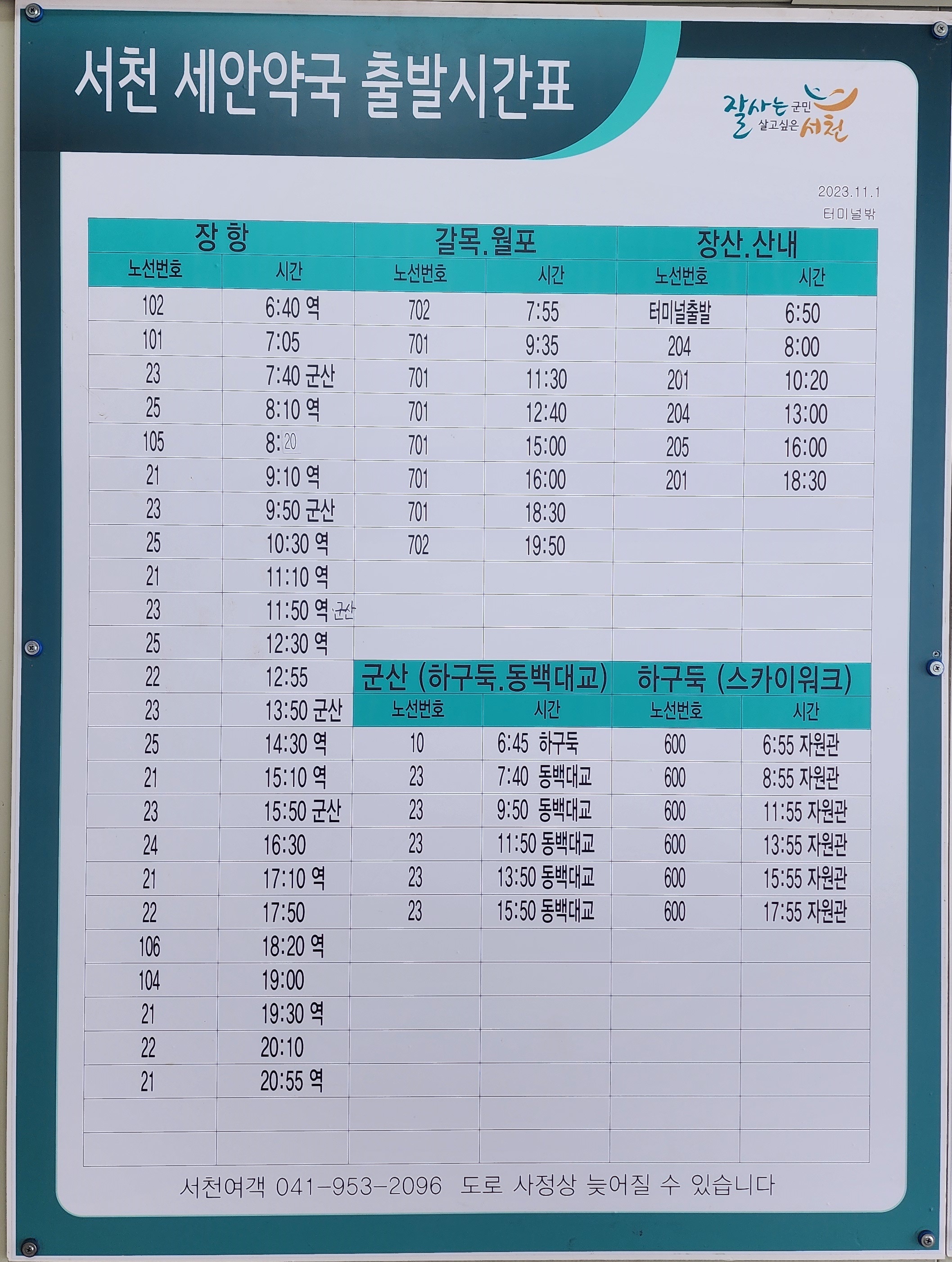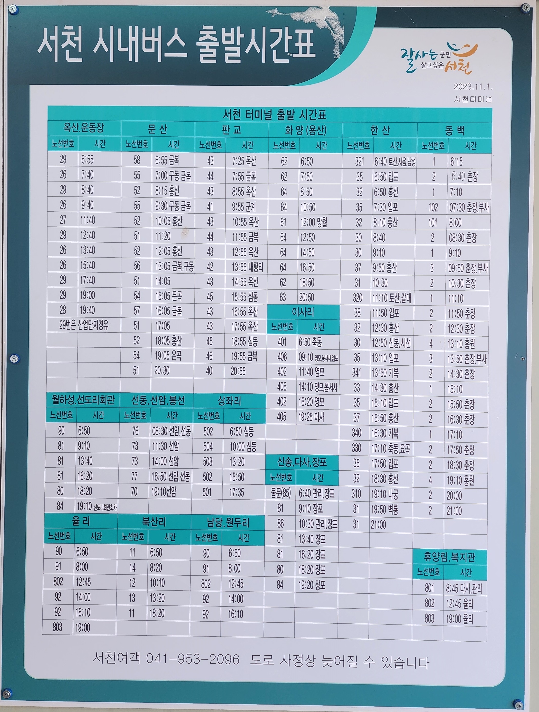 서천 출발 대전 서부터미널, 흥산, 부여, 논산, 양정, 대전 복합터미널, 부여, 논산, 연누, 유성, 천안, 주산, 웅천, 보령 서울남부, 군산 방면.
