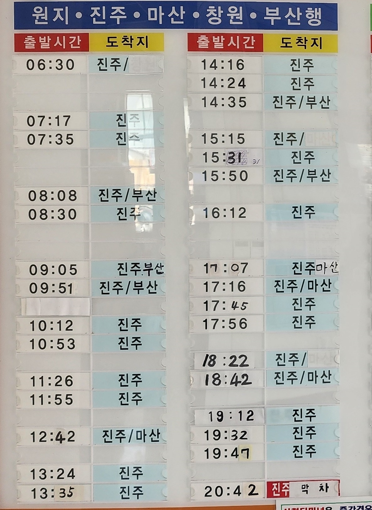 산청 출발 원지, 진주, 마산, 창원 부산 방면.