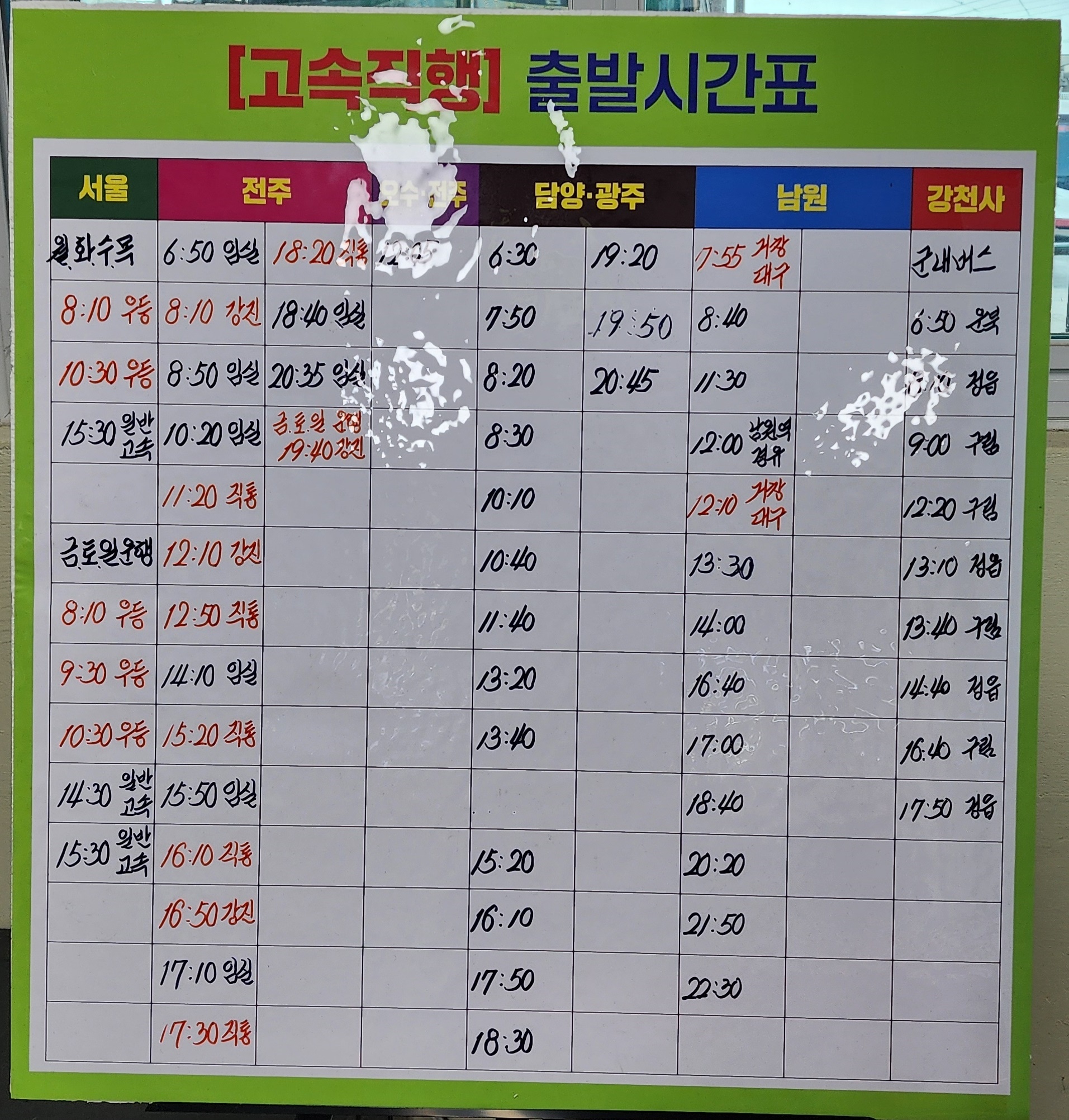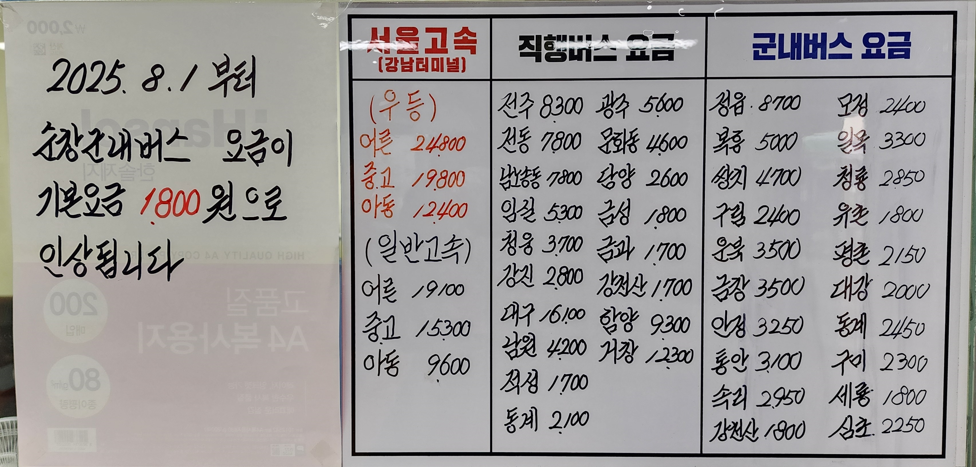 순창시외버스터미널 요금표
