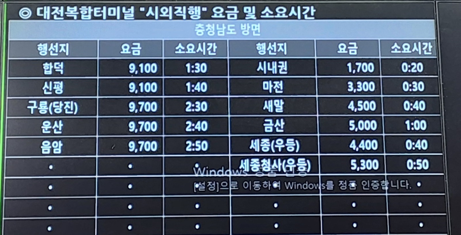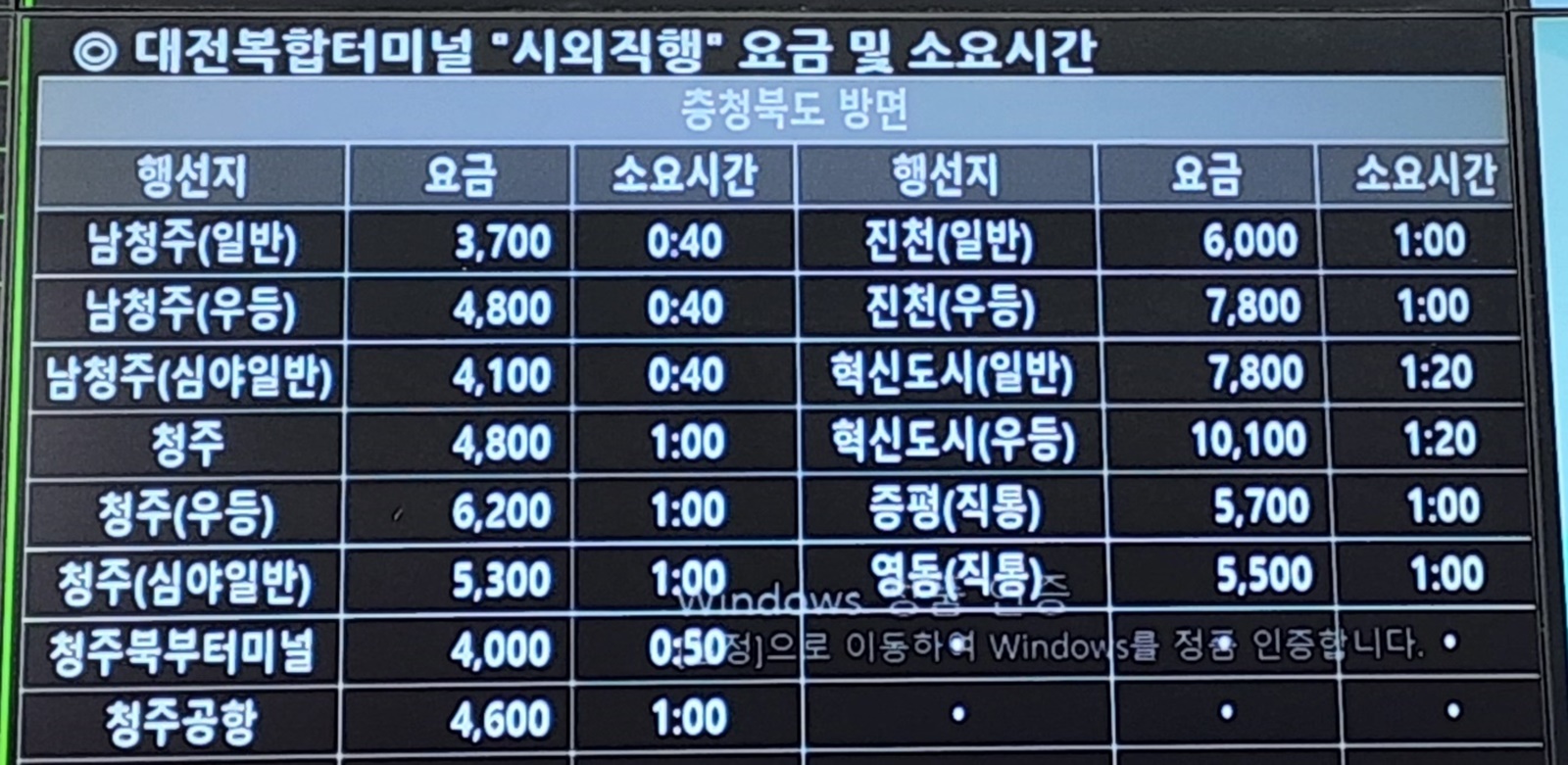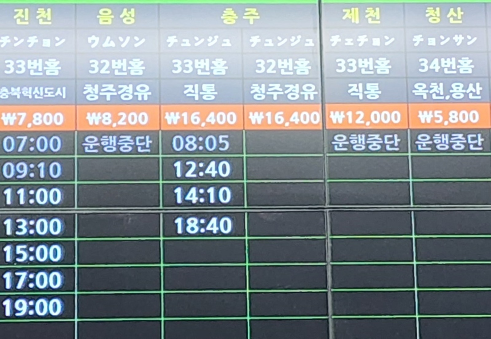 대전 출발 진천, 음성, 충주, 제천, 청산 방면.