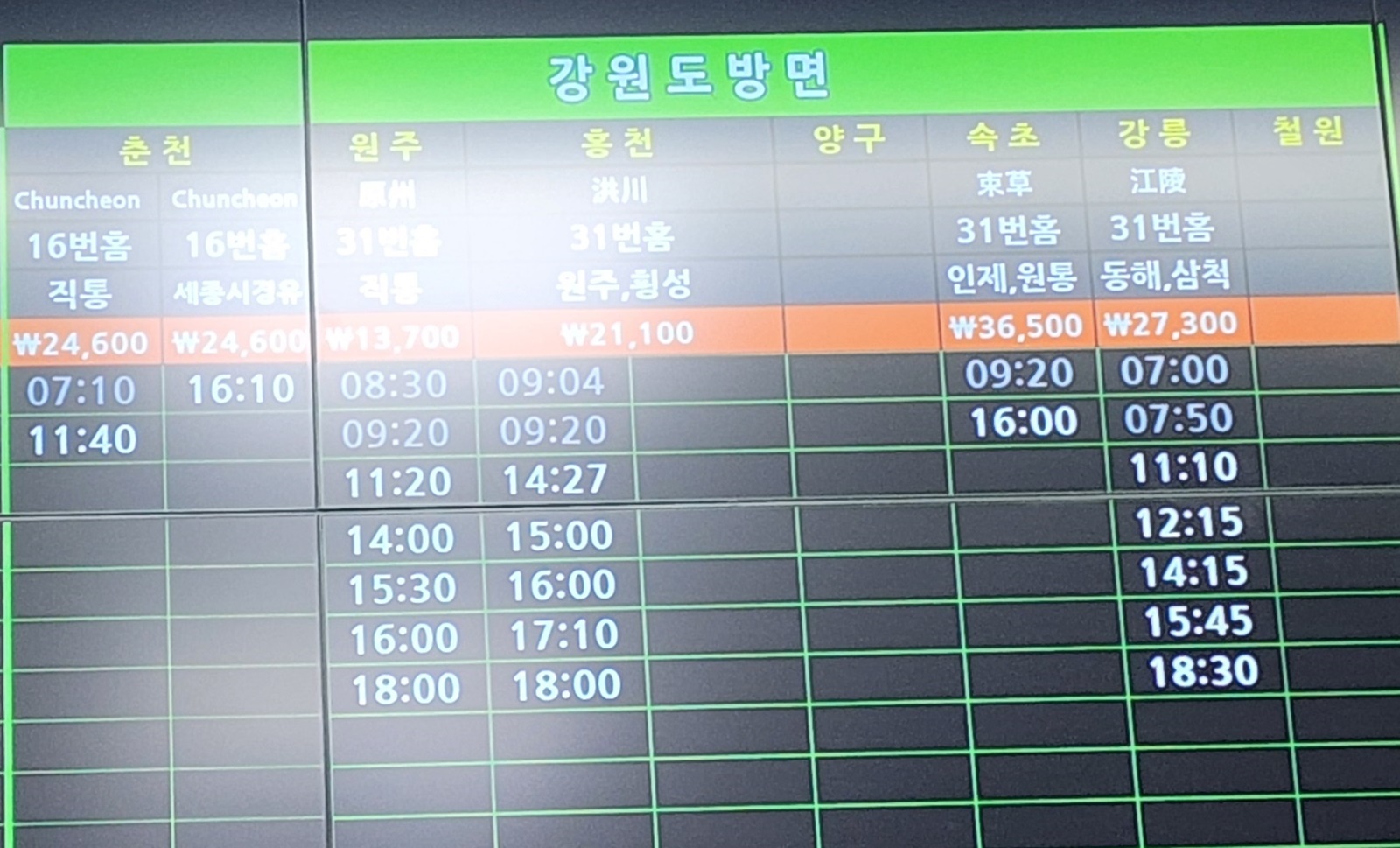 대전 출발 춘천, 원주, 홍천, 속초, 강릉 방면.