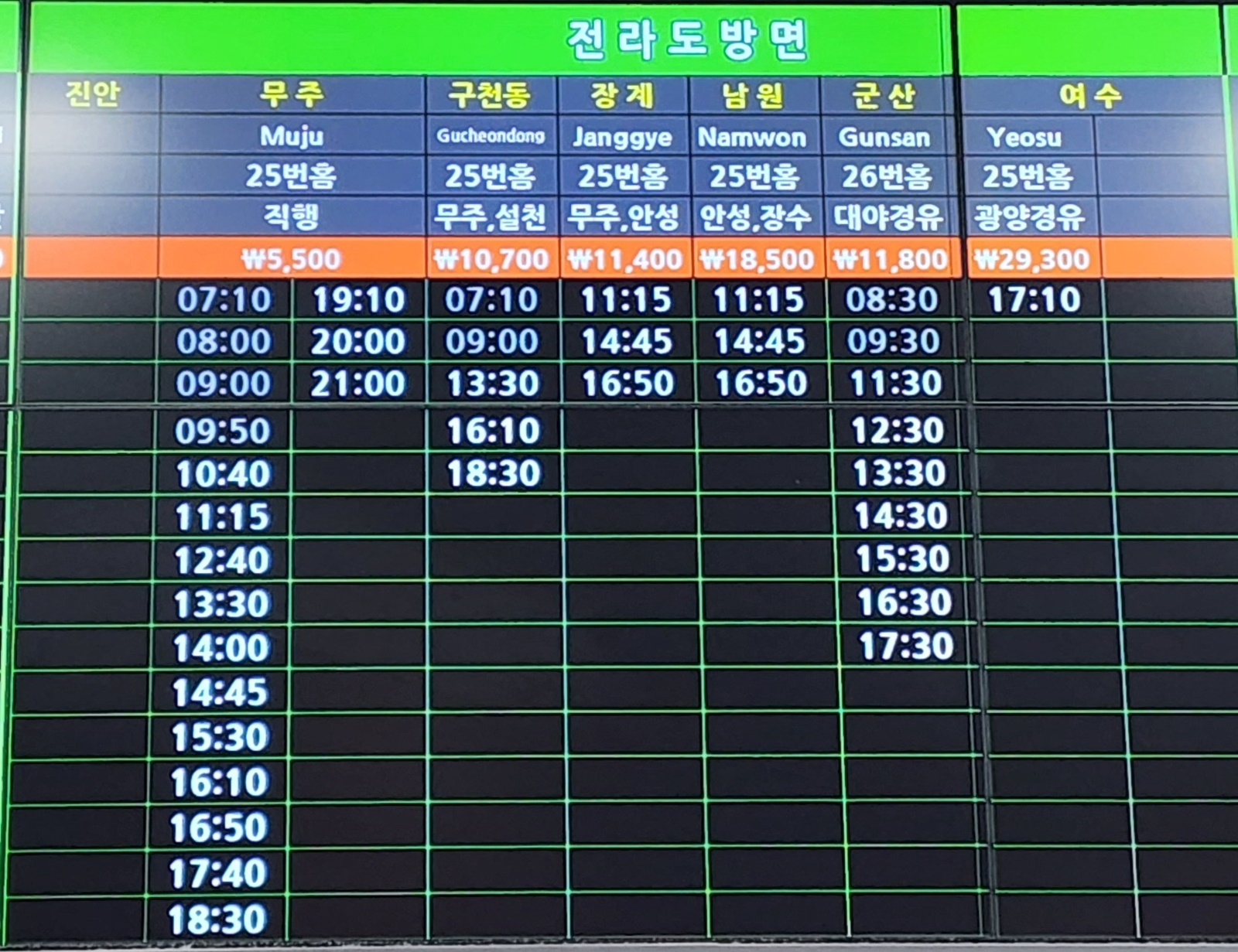 대전 출발 무주, 구천동, 장계, 남원, 군산, 여수 방면.