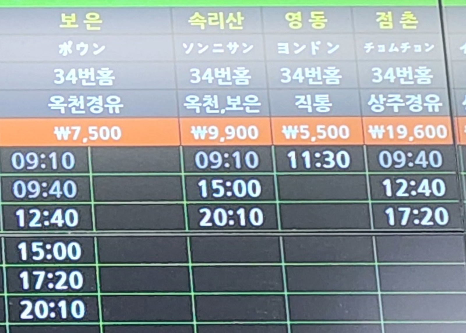 대전 출발 보은, 속리산, 영동, 점촌 방면.